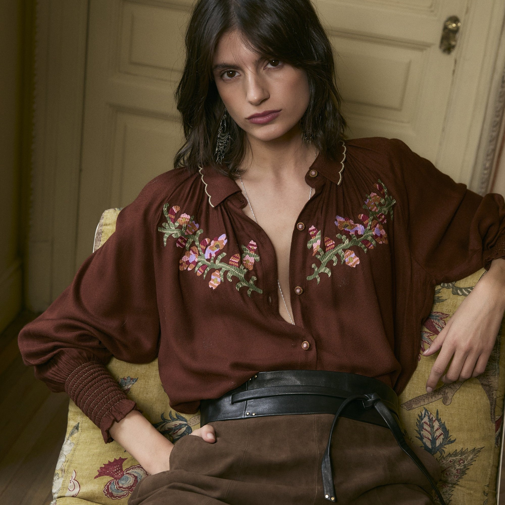BOTANIC | Chestnut Brown Embroidered Floral Blouse