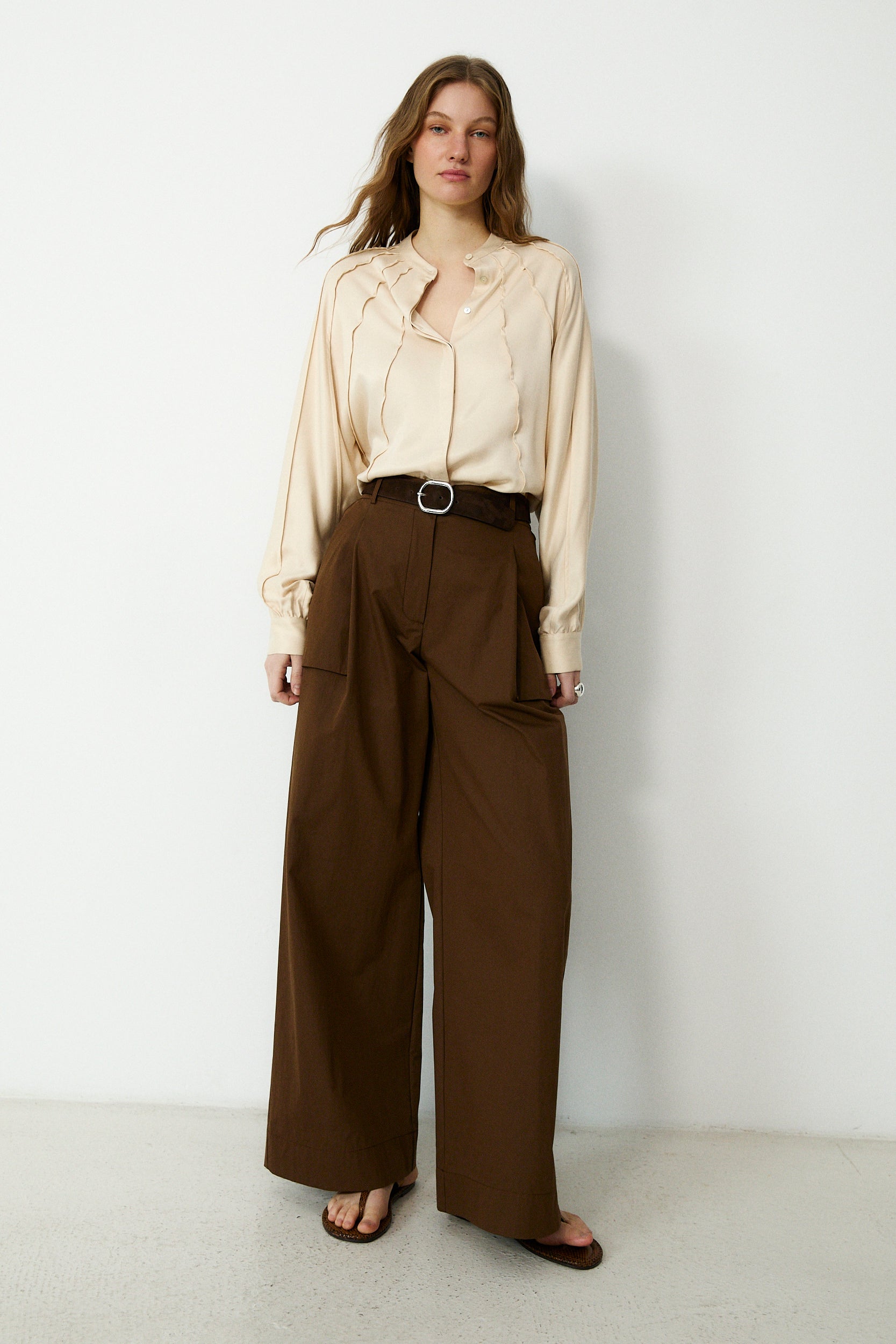 ERICA | Ecru Satin Blouse with Stitch Detailing