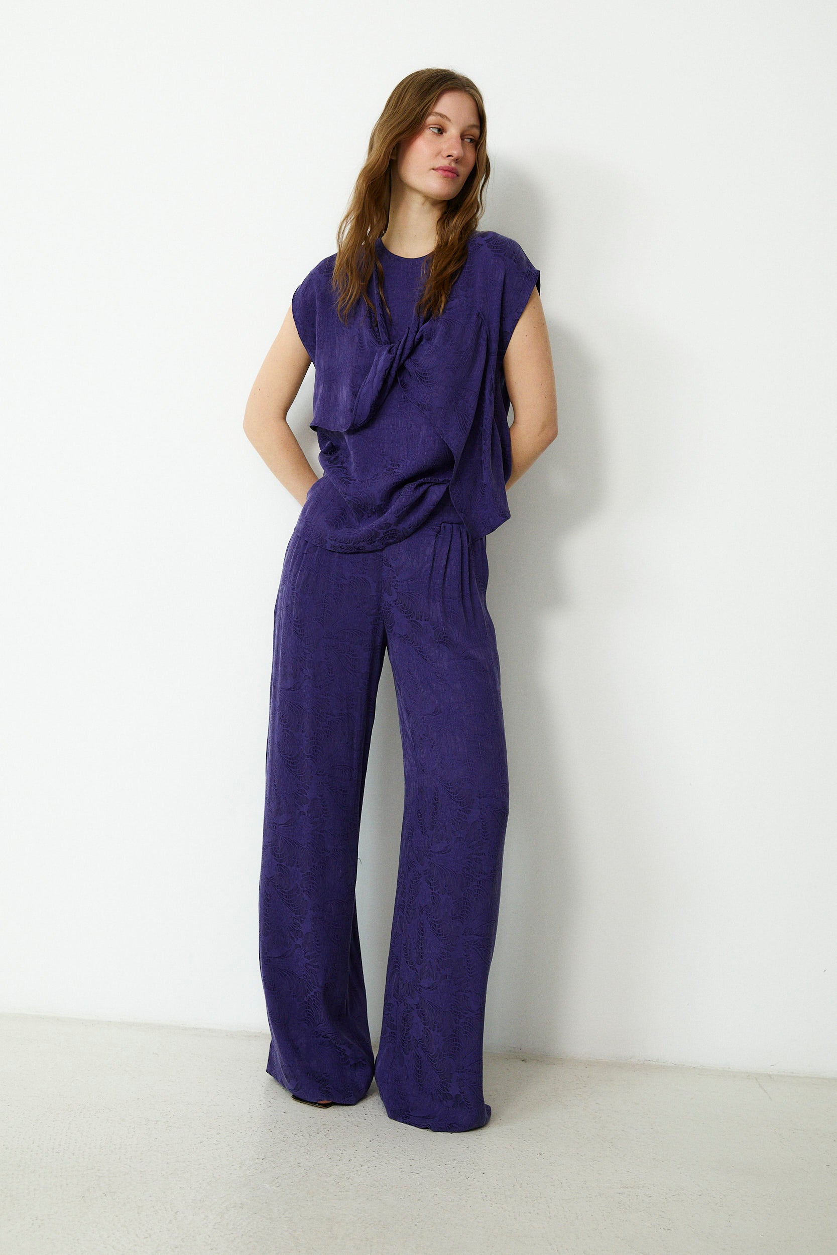 SULTANA | Dark Purple Tonal Jacquard Wide Leg Trousers