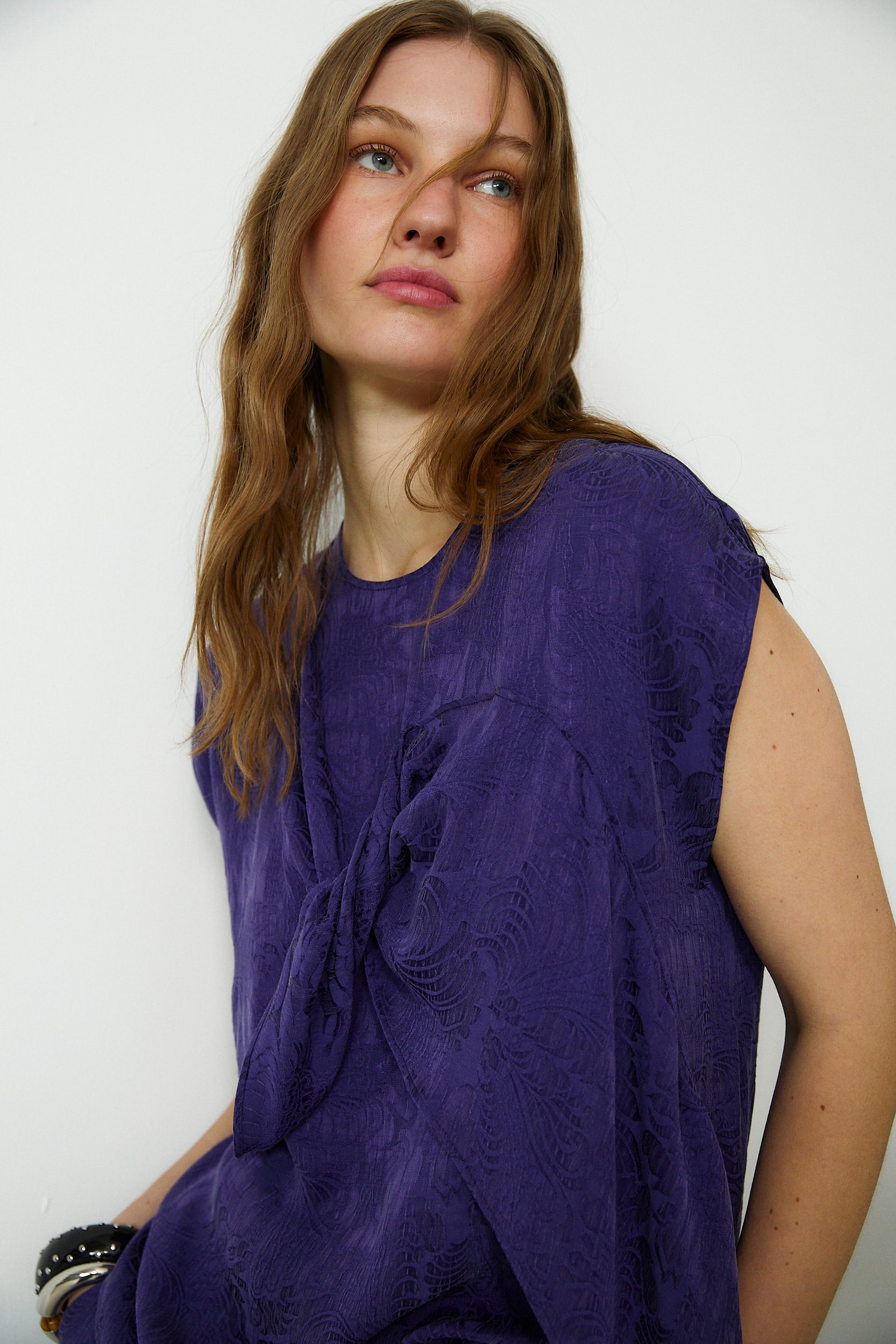 SULTANA | Dark Purple Tonal Jacquard Twist Front Top