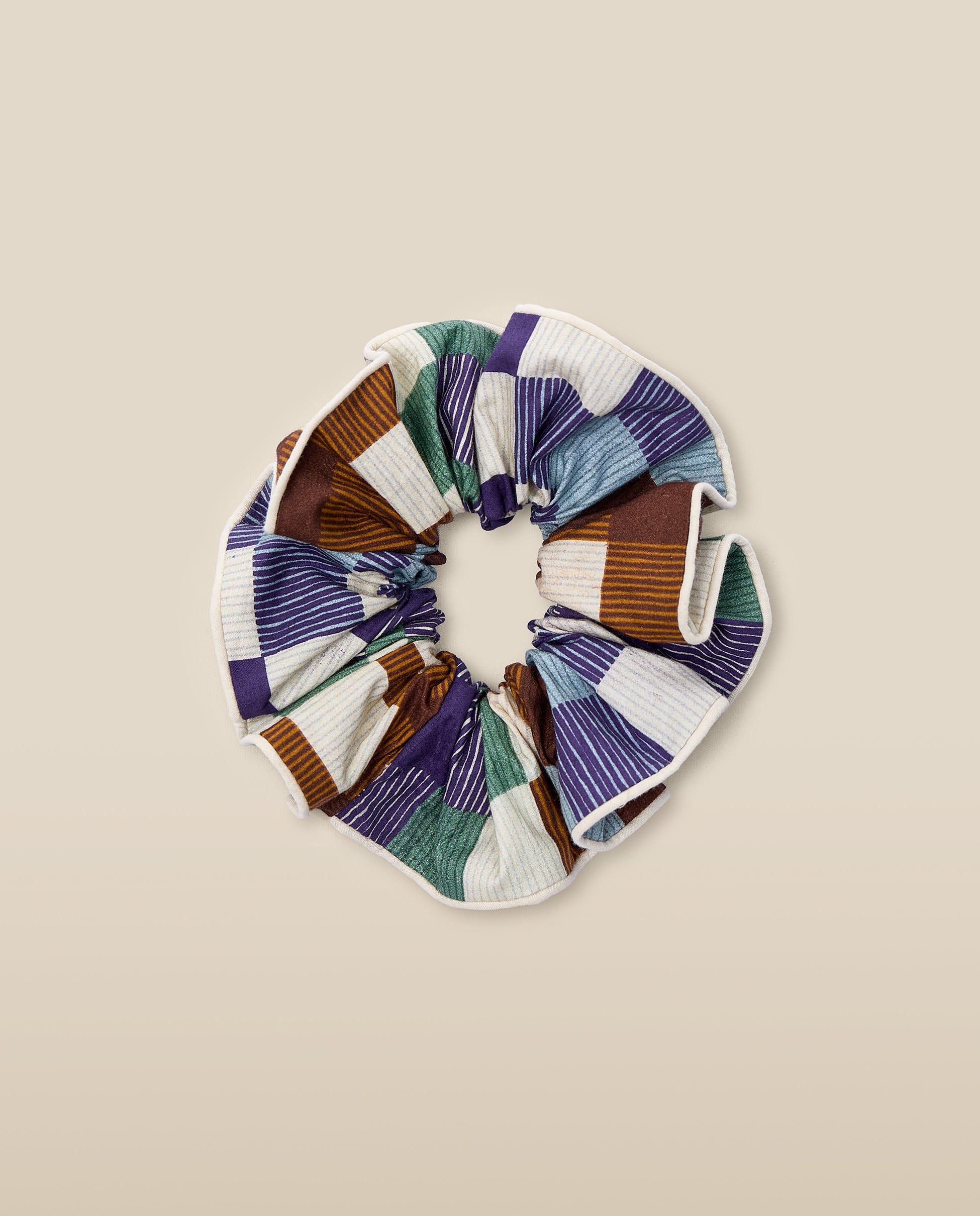 Add a playful twist to your everyday look with this geometric print scrunchie. Finished with soft contrast piping for a touch of texture.