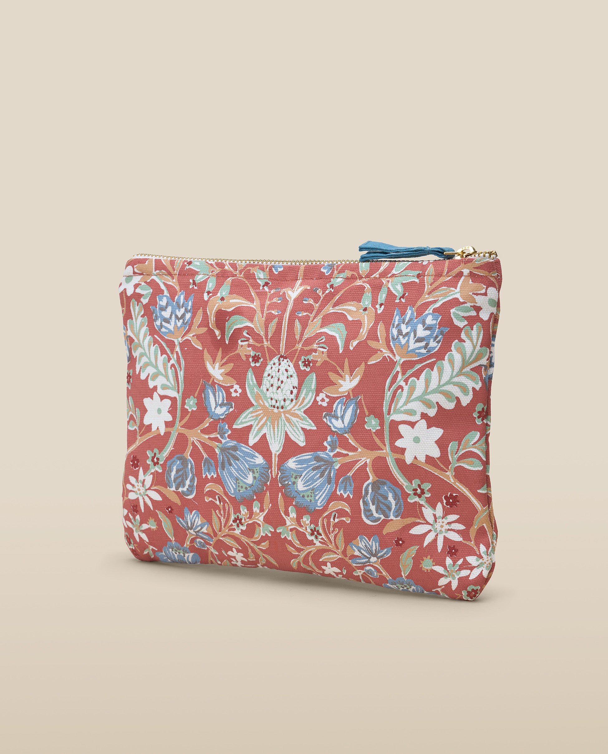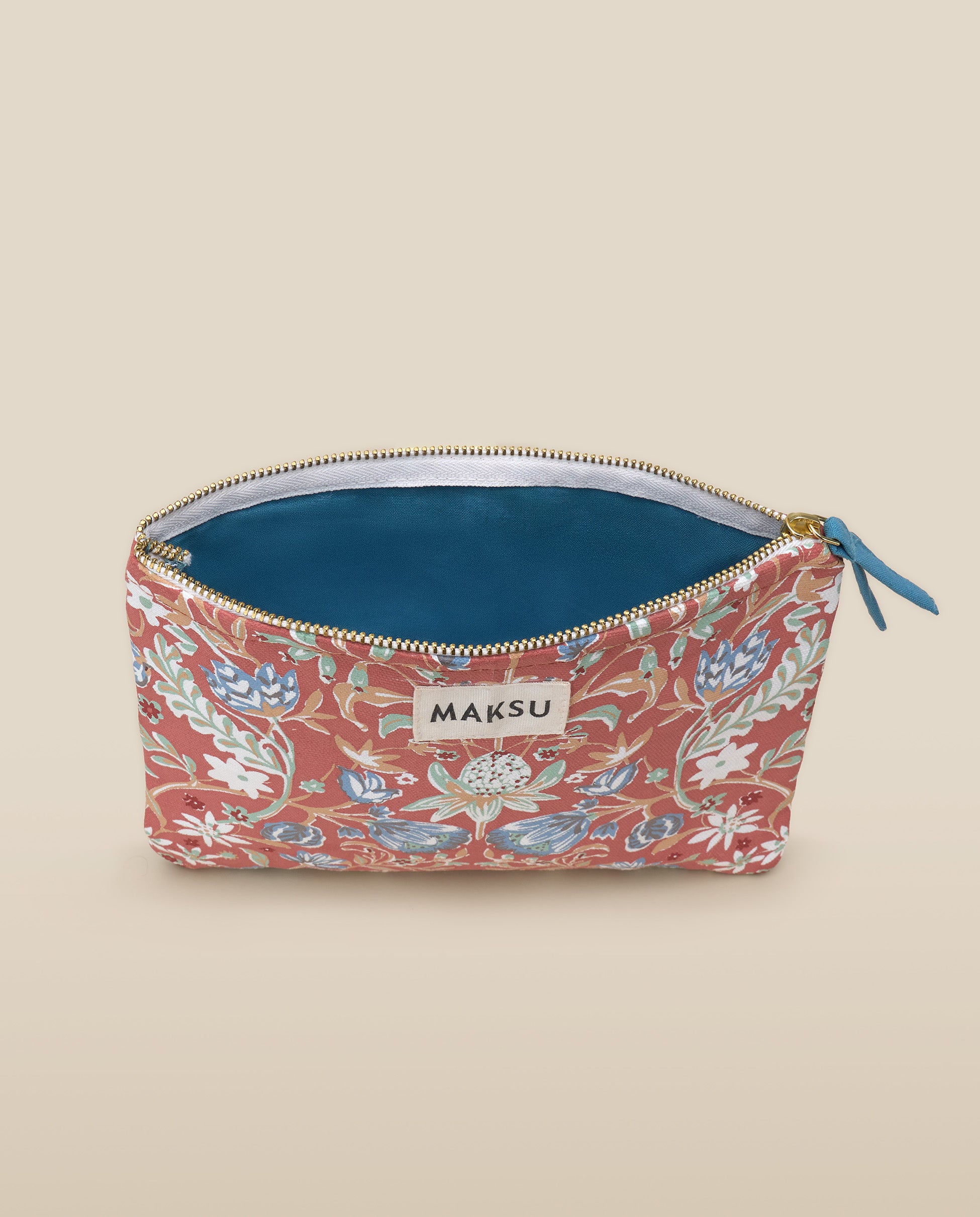 A charming way to organise your essentials. Printed in an intricate floral pattern, this soft cotton pencil case features a rich terracotta base with accents of pale blue, ivory and sage green. It’s lined in teal blue for contrast and secures with a gold-tone metal zip topped with a fabric pull tab. Perfect for stationery, makeup, or small keepsakes.