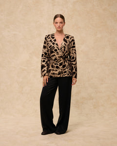 Statement-making yet effortless, the Beduina trousers are tailored from lustrous Italian jacquard in a bold leopard motif. Cut to a relaxed wide-leg silhouette, they feature an elasticated back waistband for comfort and a clean front for a polished finish. Pair with the matching blazer for an elevated take on evening dressing.
