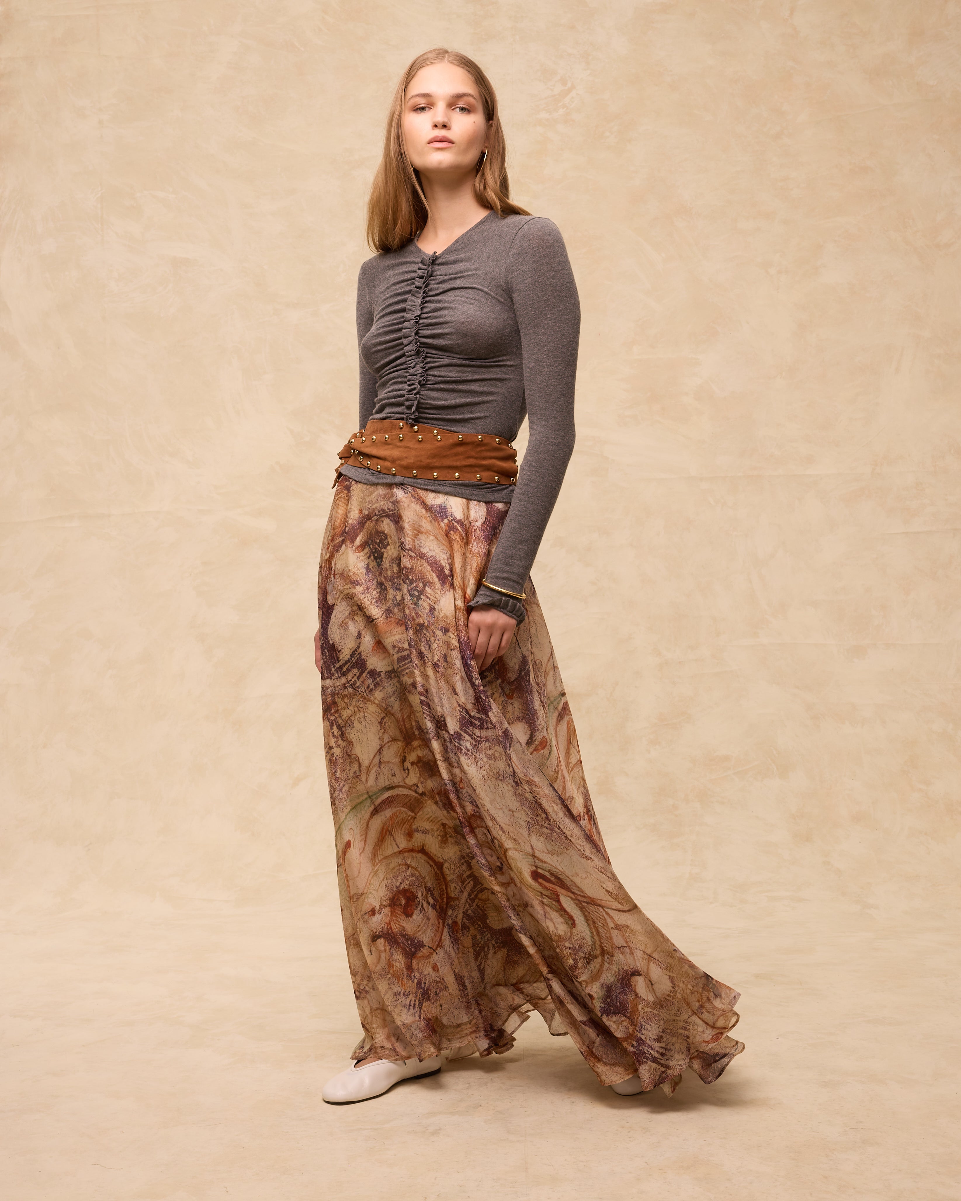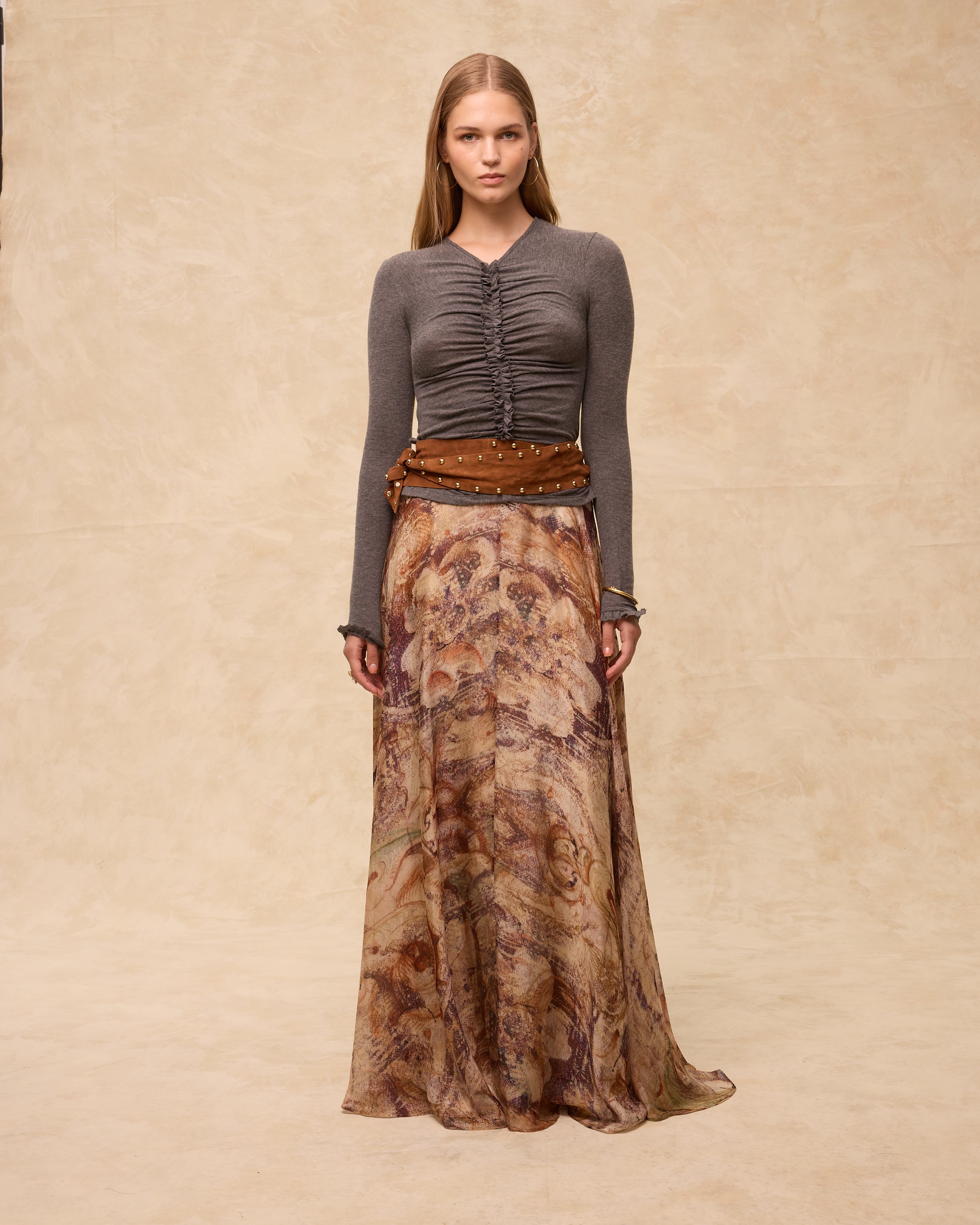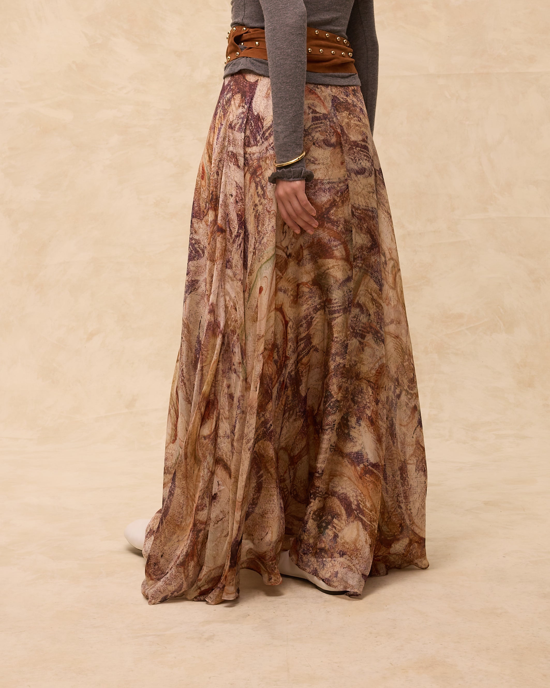 A free-flowing silhouette meets artful texture in the Marsiglia Skirt, crafted from Italian fabric in a washable silk blend with a digitally printed abstract motif. The full-length flared cut moves with ease, while earthy neutral tones and swirling patterns evoke a quiet elegance. Fully lined for added coverage and comfort, it fastens with a concealed side zip for a seamless fit.