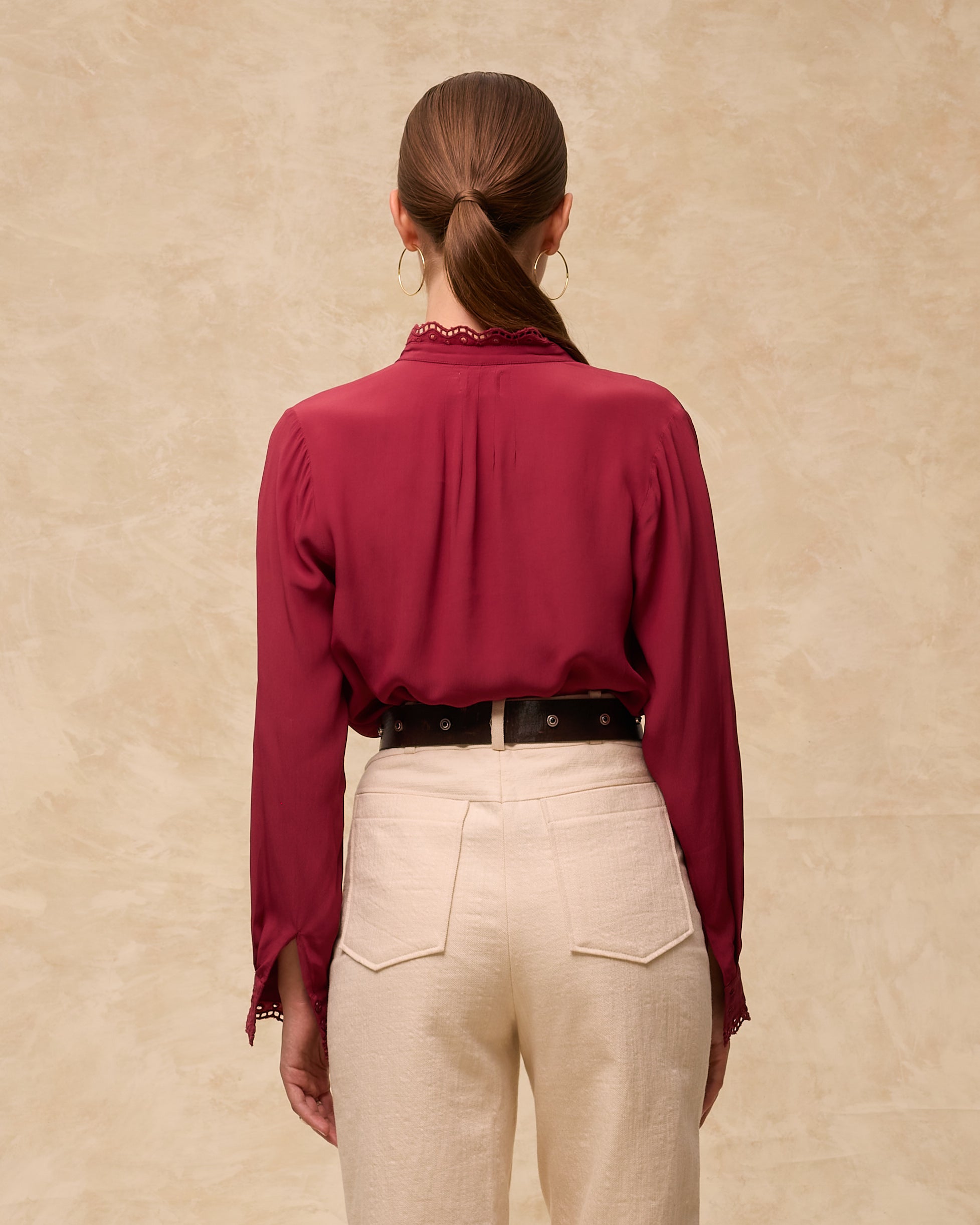 Romantic and refined, the Tordini Blouse in deep red is a timeless addition to any modern wardrobe. Designed with delicate embroidery along the placket and a scalloped neckline, it features tonal buttons for styling versatility. Wear it fully fastened for a polished look or slightly undone for an effortless finish. • Deep red blouse with tonal embroidery and scalloped trim • Button-through front with soft drape and relaxed movement • Gathers at cuff with tonal button fastening