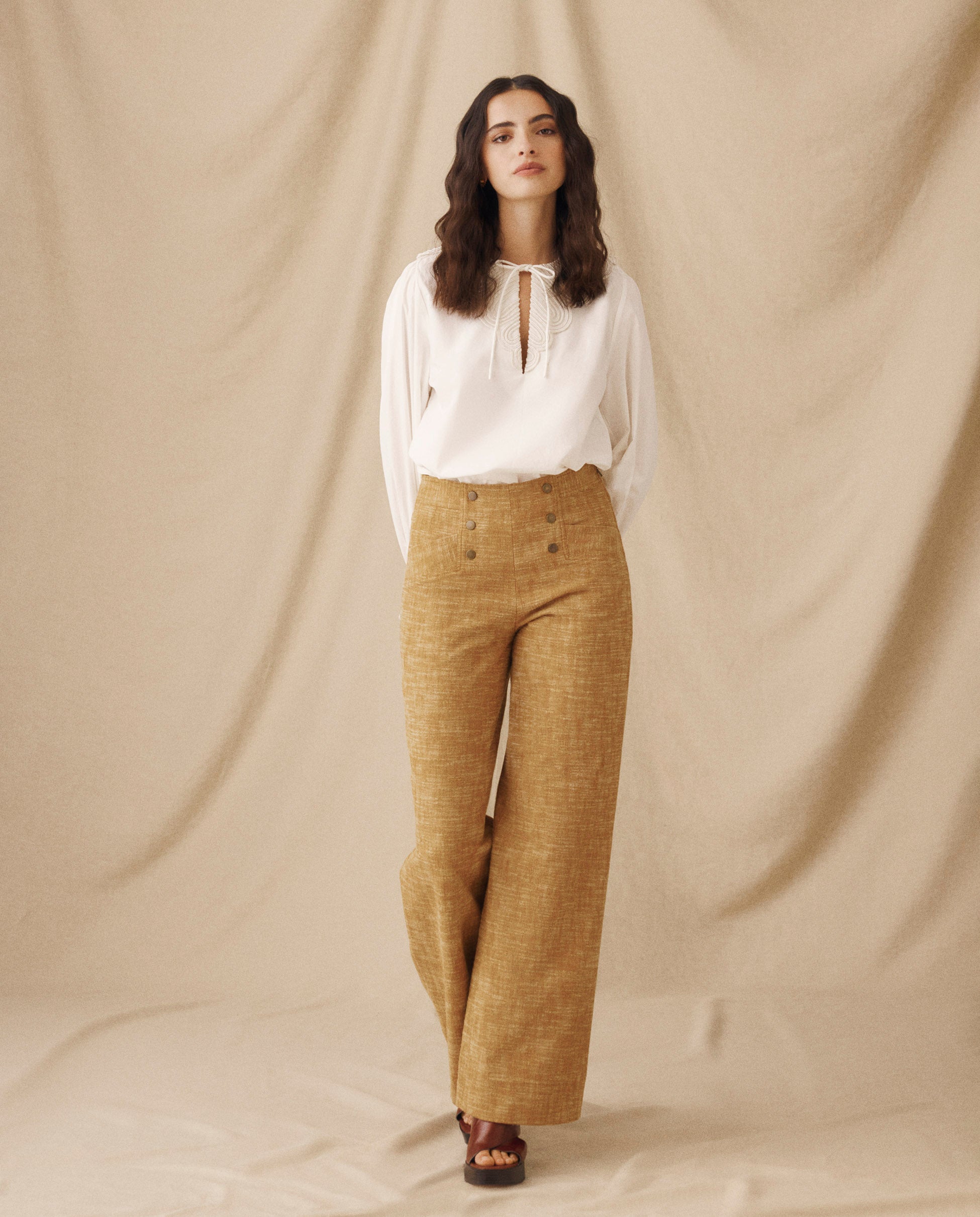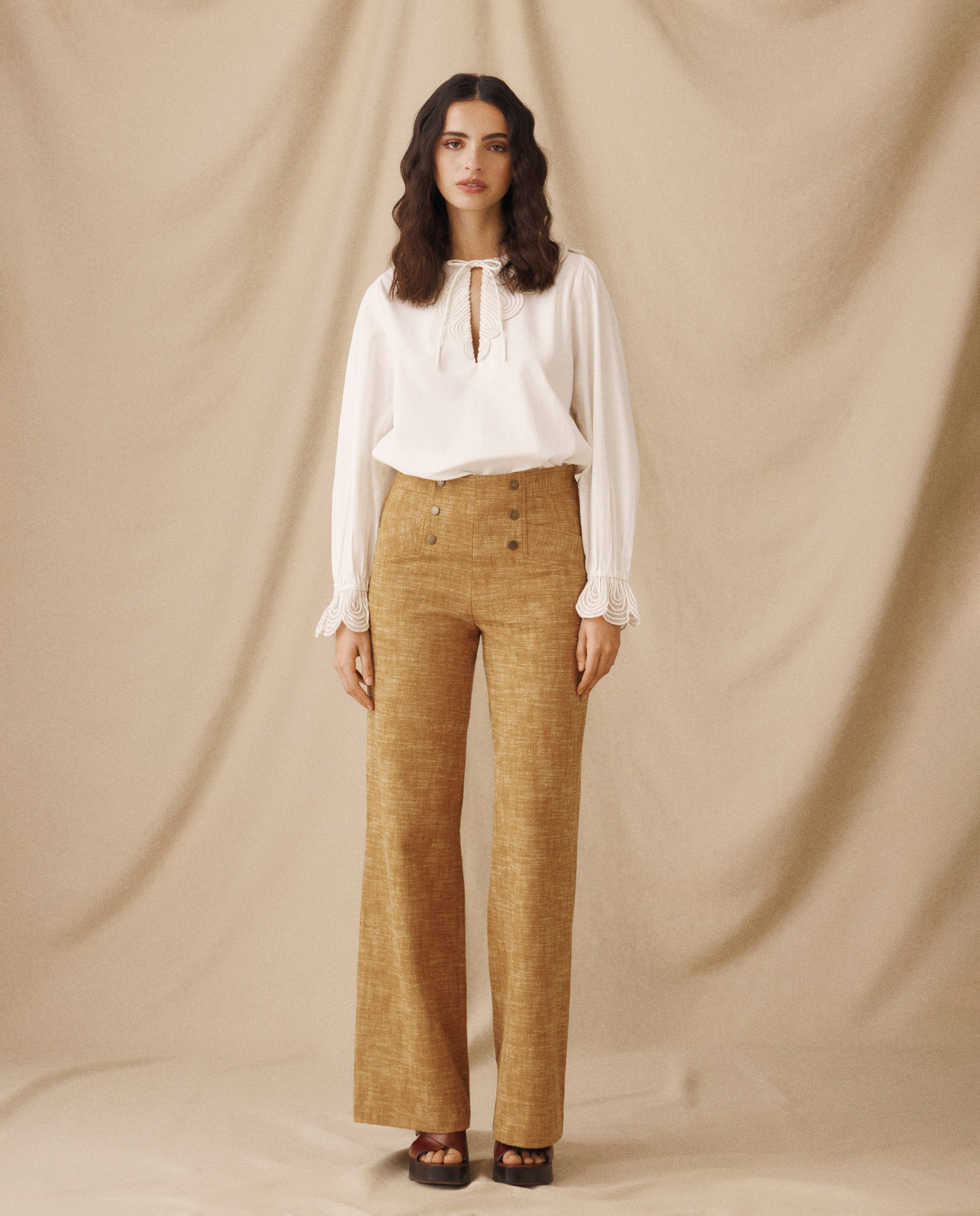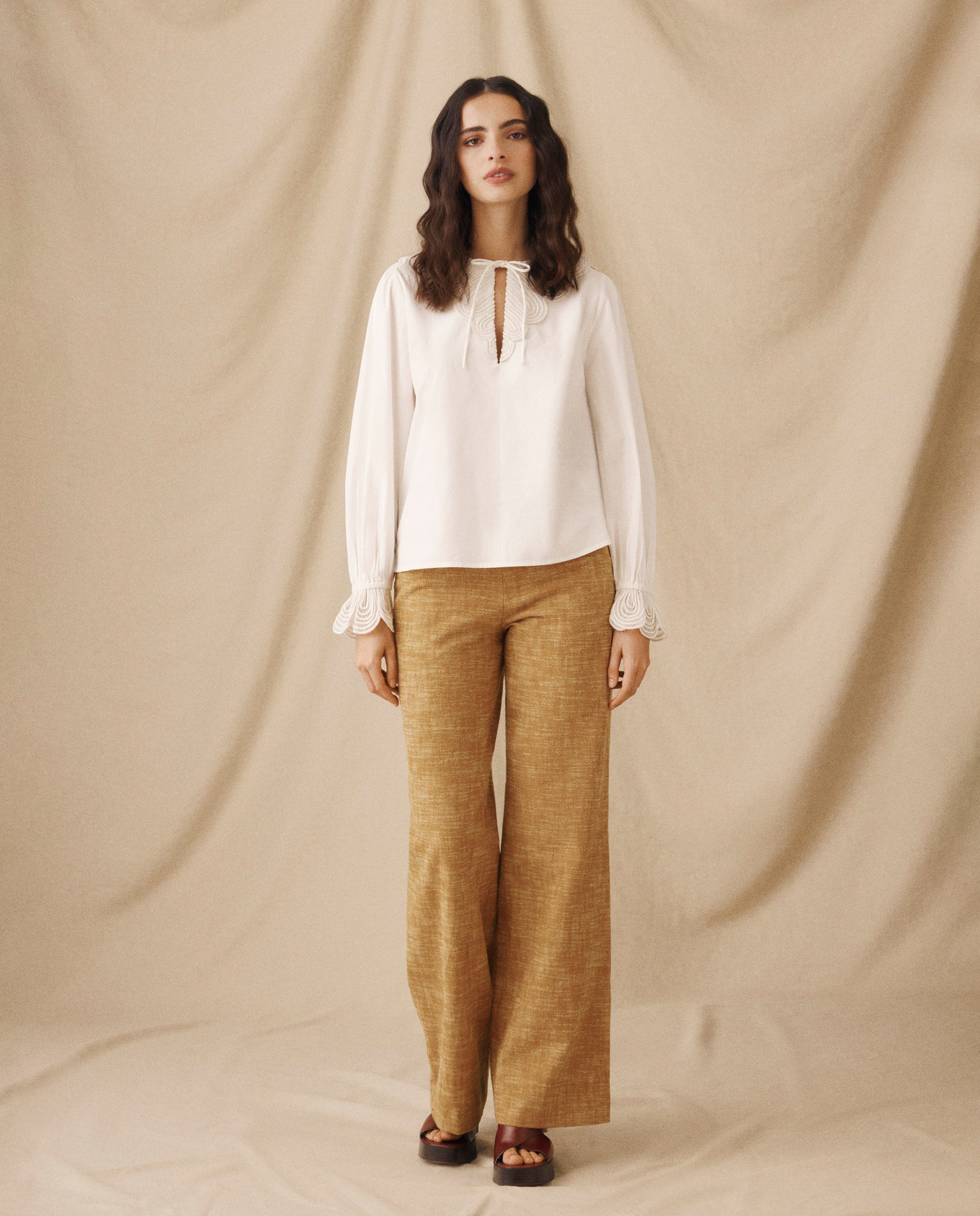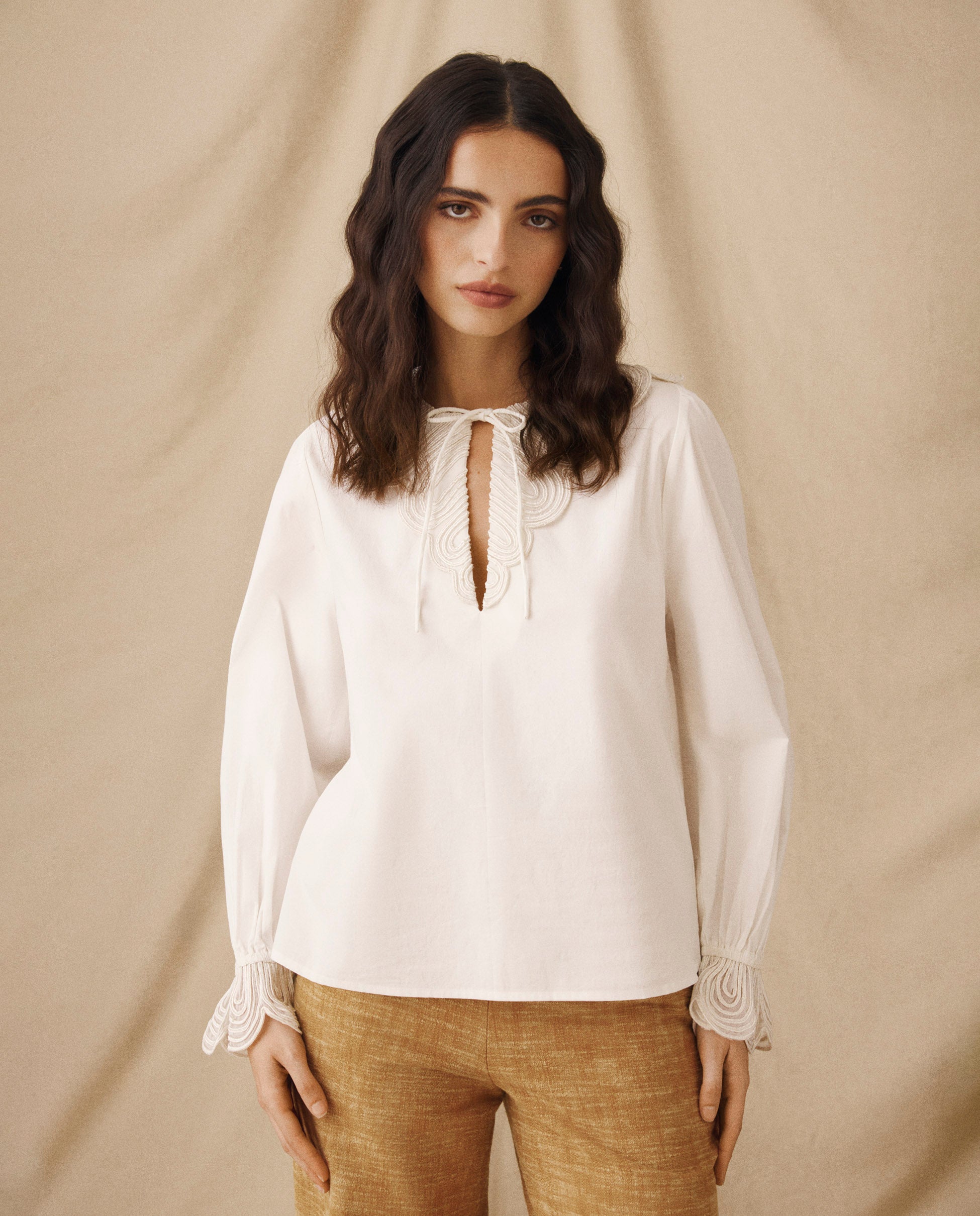 Softly structured in pure cotton, the Brunella Blouse brings a refined touch to everyday dressing. The relaxed silhouette features a scalloped embroidered neckline with keyhole and tie detail, while full-length sleeves are gathered at the wrist with matching embroidery at the cuffs.