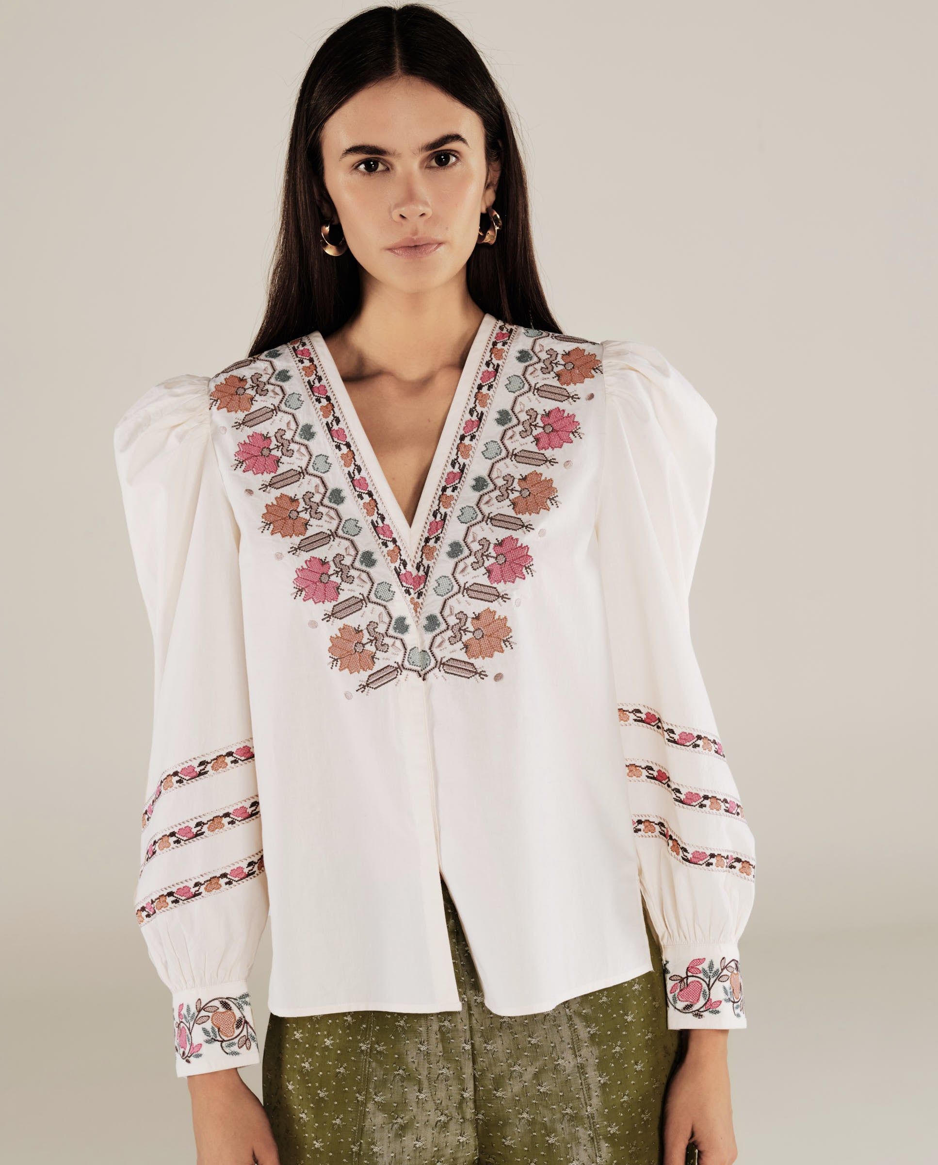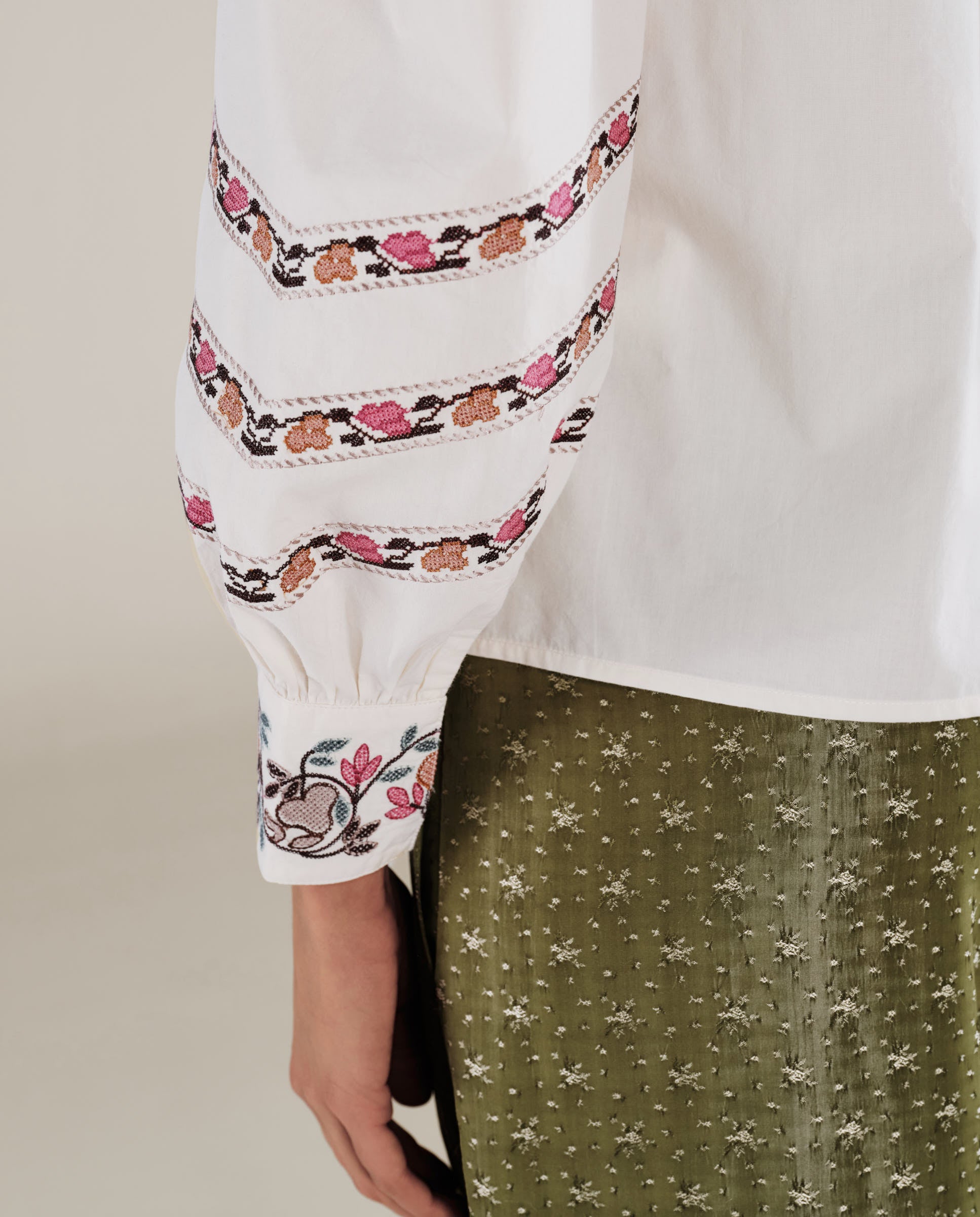 • Delicate embroidery detailing at collar and cuff for added texture