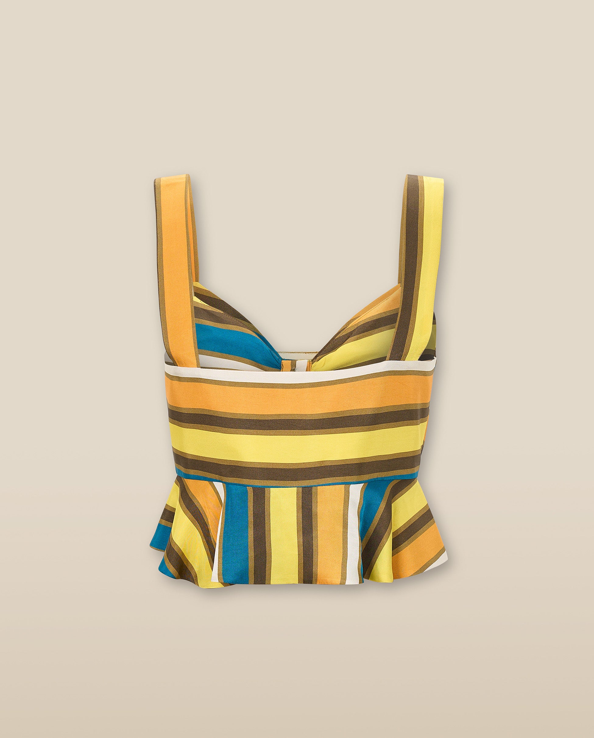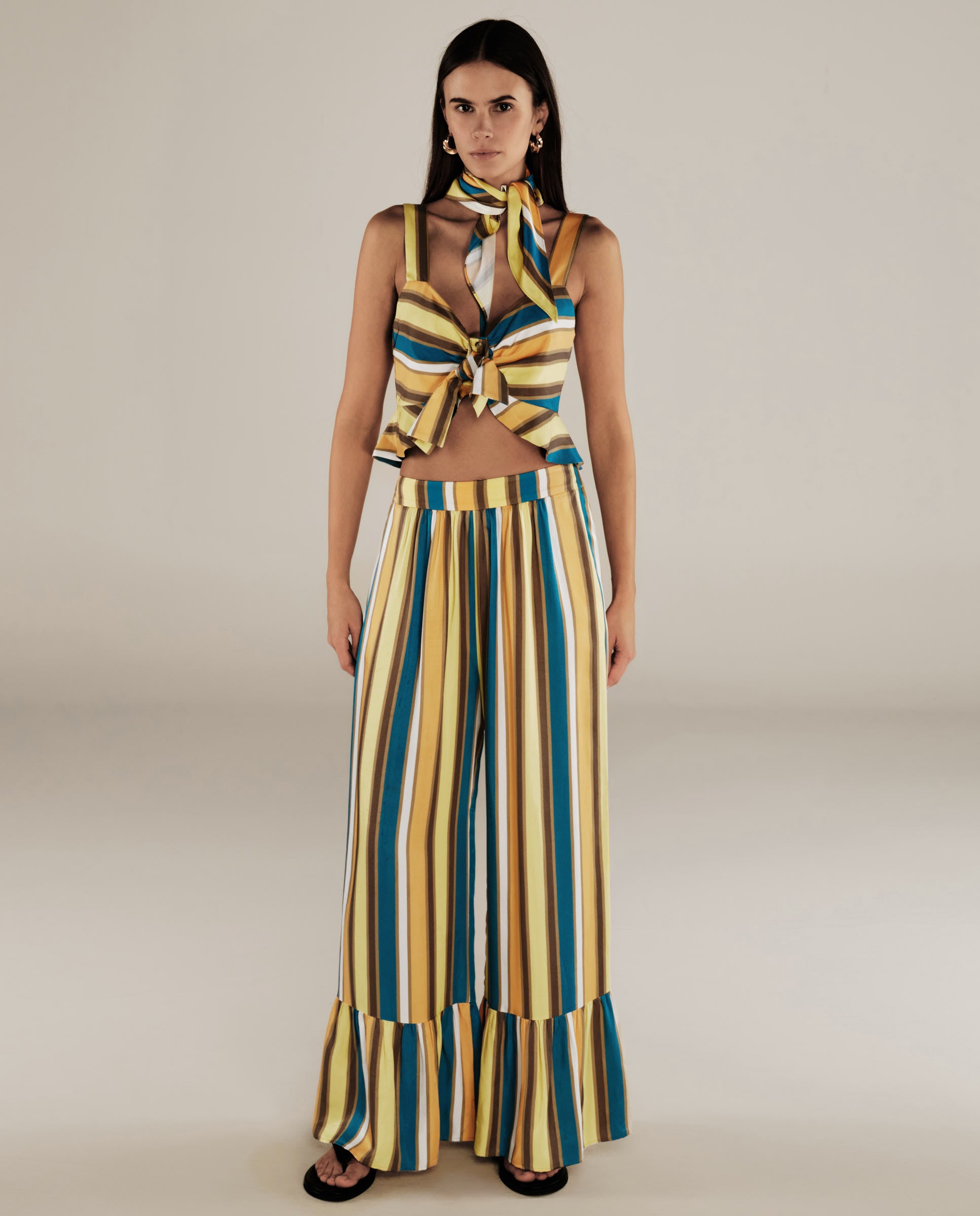 Lively and effortlessly chic, the Eyre Crop Blouse radiates sunny-day charm with its vibrant multicoloured stripes in shades of yellow, orange, brown and blue. Ruffle detailing at the hem infuses a feminine flourish, while the wide straps and structured bodice nod to MAKSU’s signature blend of style and comfort. Ideal for resort getaways or simply adding colour to everyday outfits.
