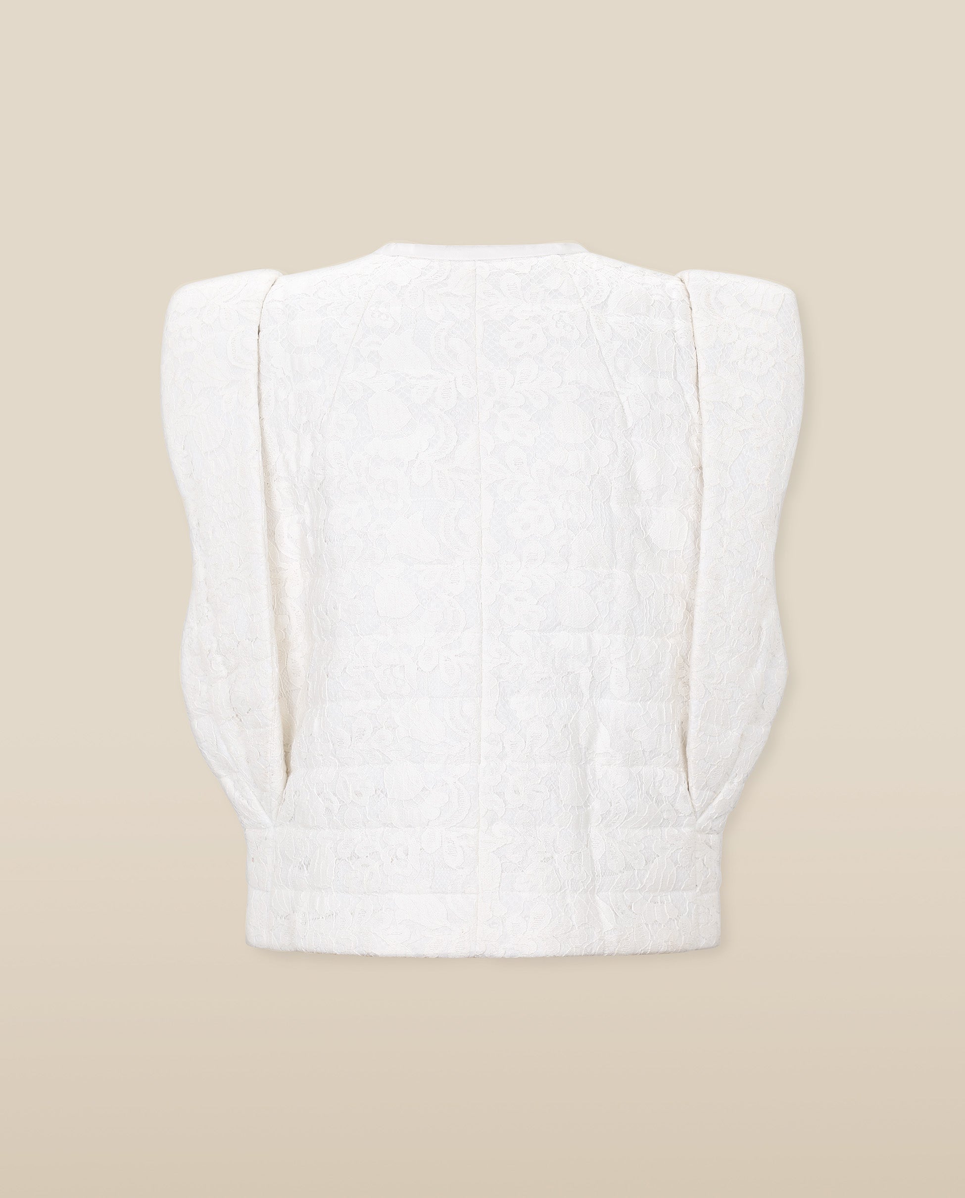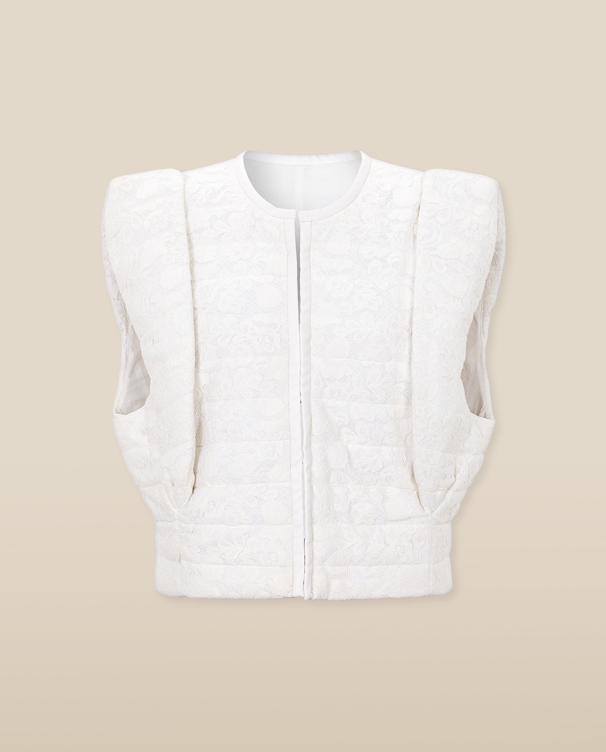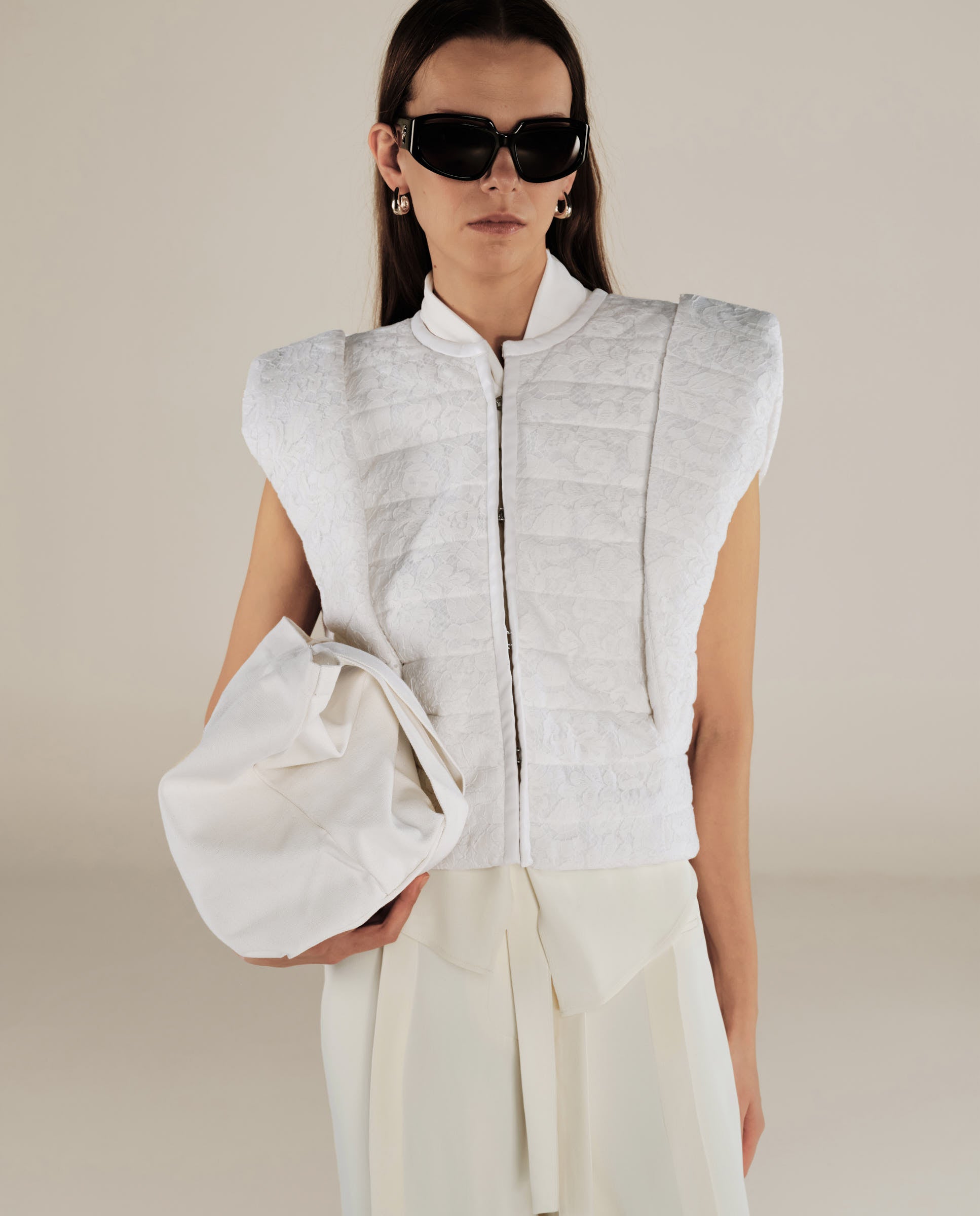 Elevate your layering game with the Fatima Vest in crisp white, crafted from soft cotton and accented by delicate floral embroidery. Its quilted finish adds subtle texture, while structured shoulders impart contemporary polish—an embodiment of MAKSU’s craftsmanship-driven ethos. Slightly cropped to sit at the natural waist, it creates a universally flattering shape and transitions seamlessly from day to night.
