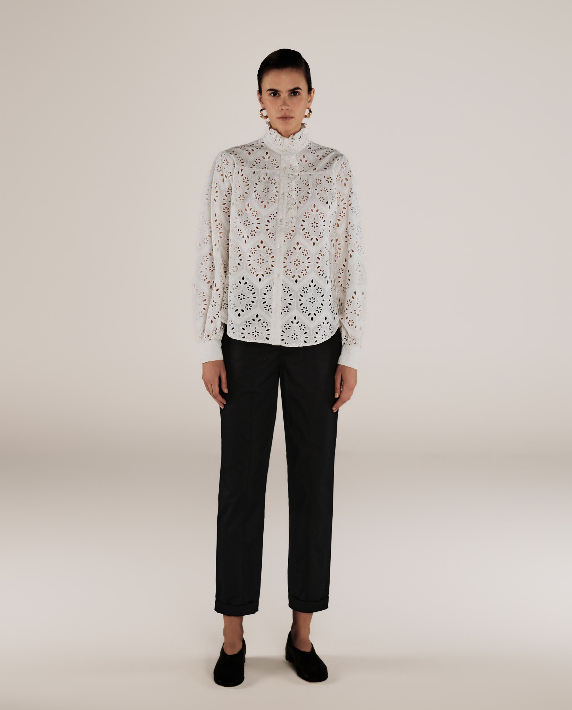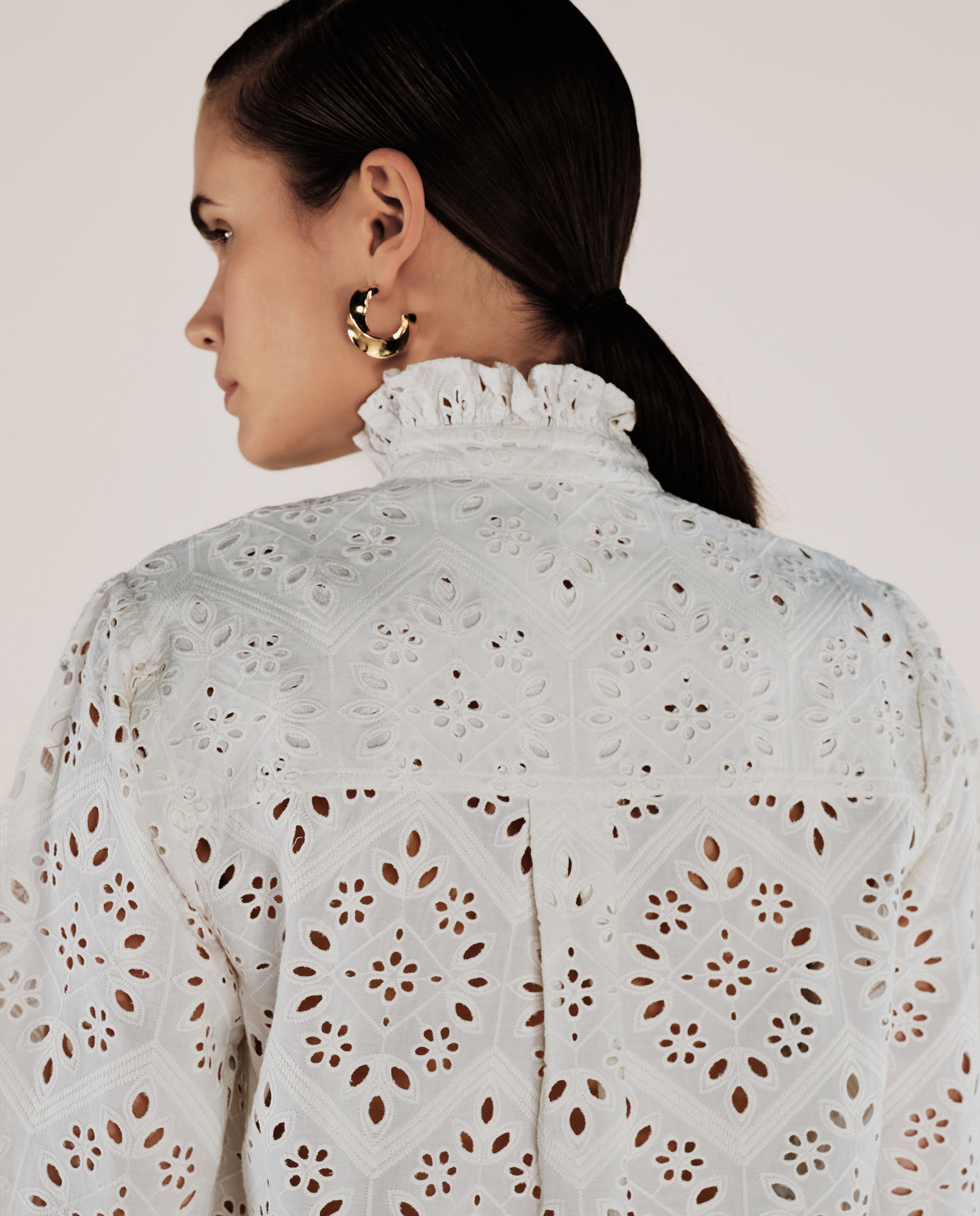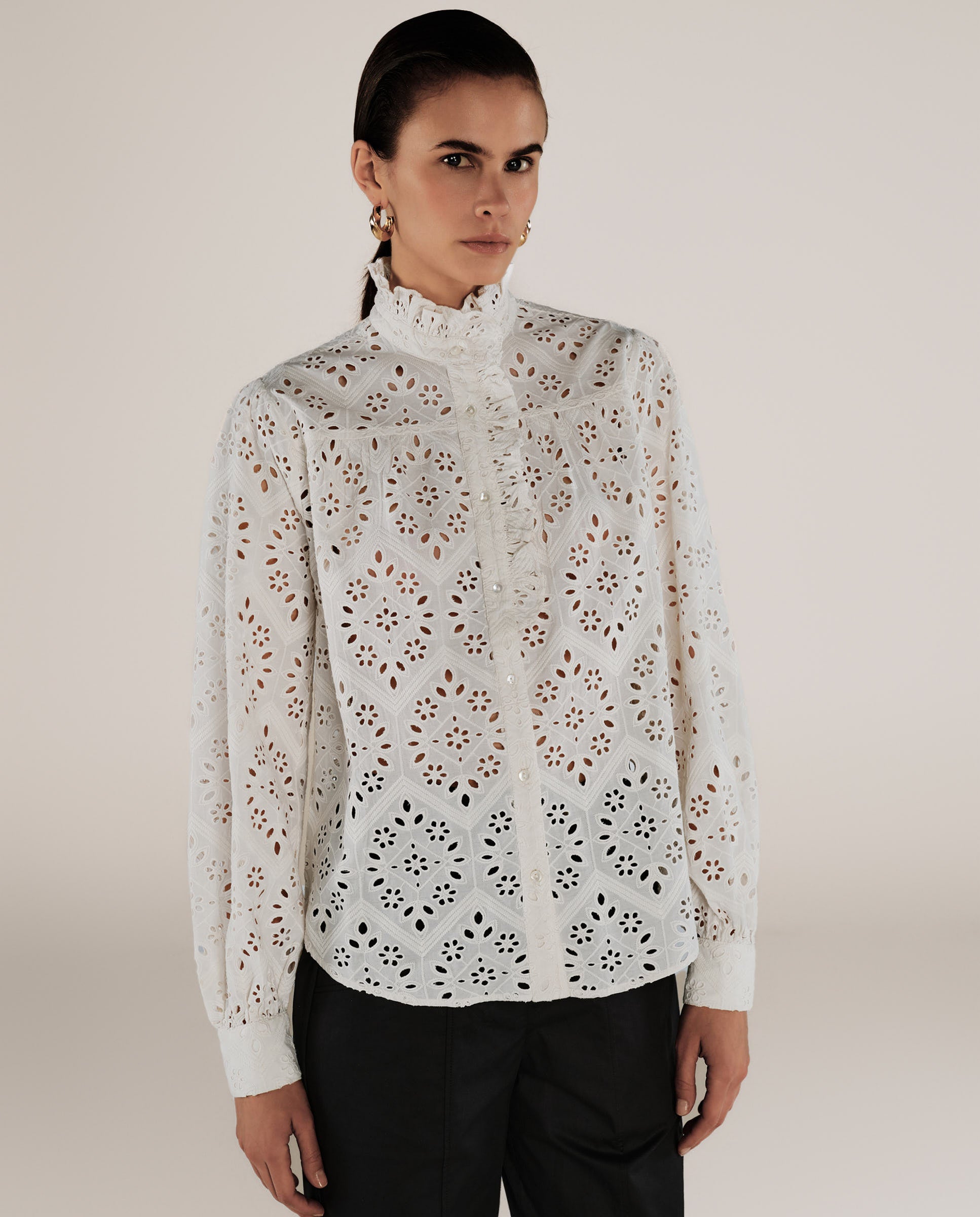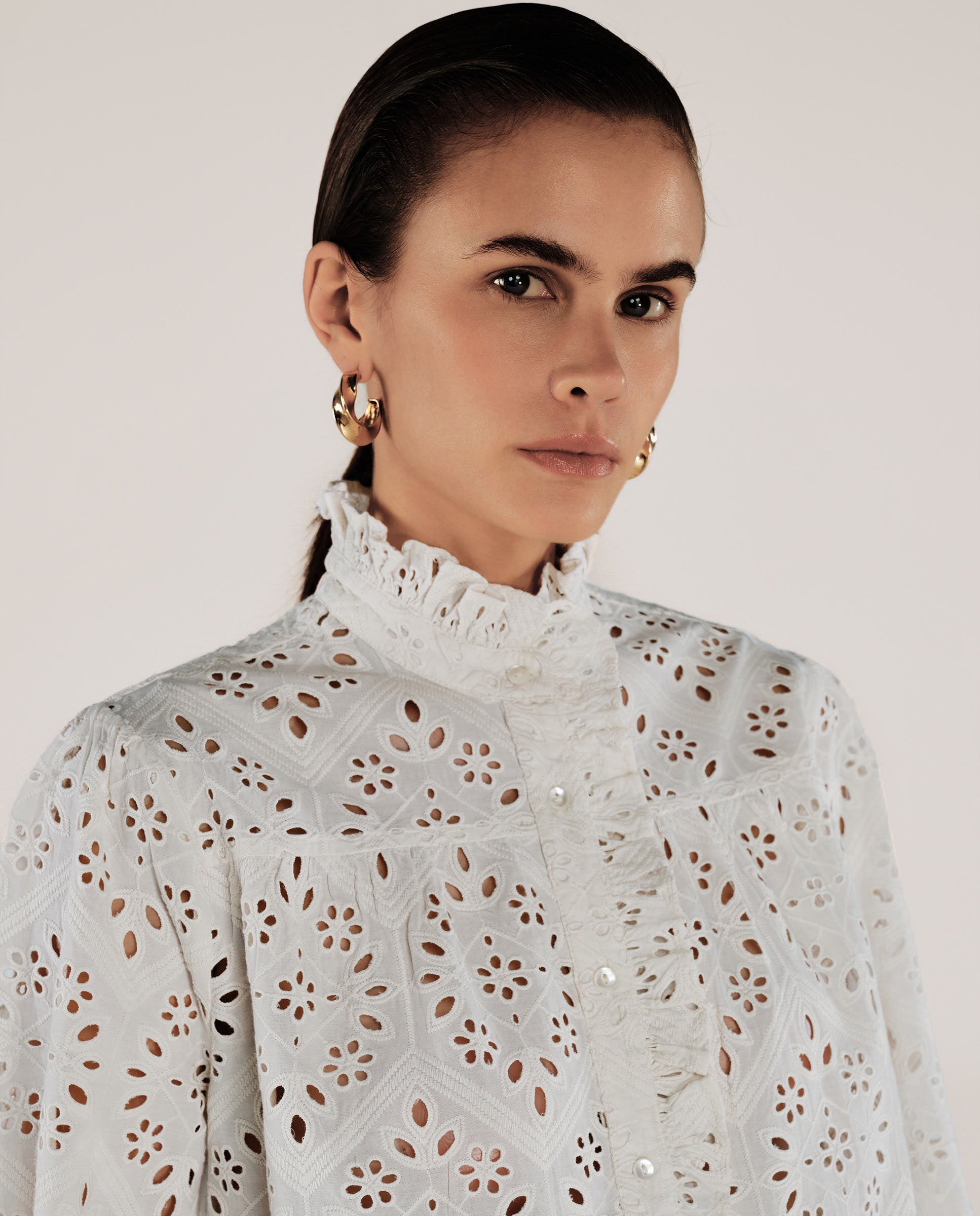 Bring a fresh dose of bohemian flair to your wardrobe with the Lulu Blouse, a romantic take on everyday dressing. Crafted from airy broderie anglaise cotton fabric, it features an elegant high collar with ruffled trim and delicate cutwork throughout. Softly gathered shoulders transition into full-length sleeves, striking the perfect balance between comfort and refinement. A buttoned front closure adds versatility—simply pair it with jeans for a casual daytime ensemble or dress it up with a flowing maxi skirt for an effortless evening look.