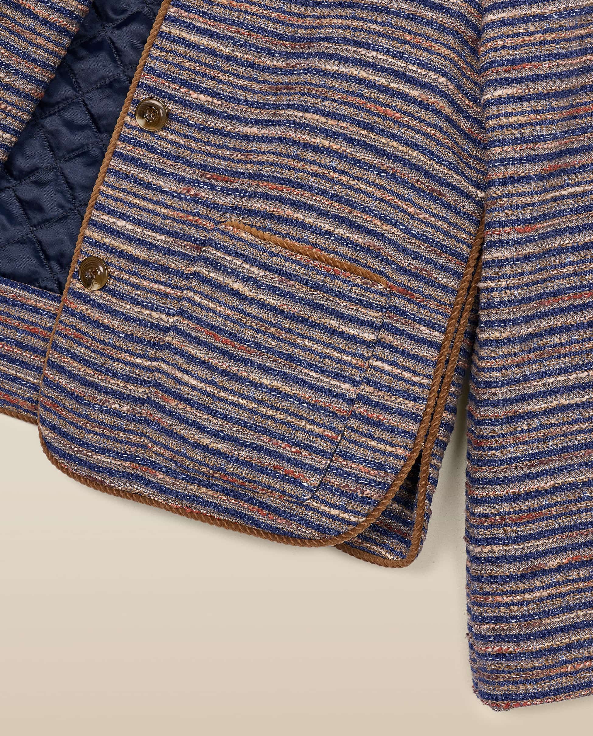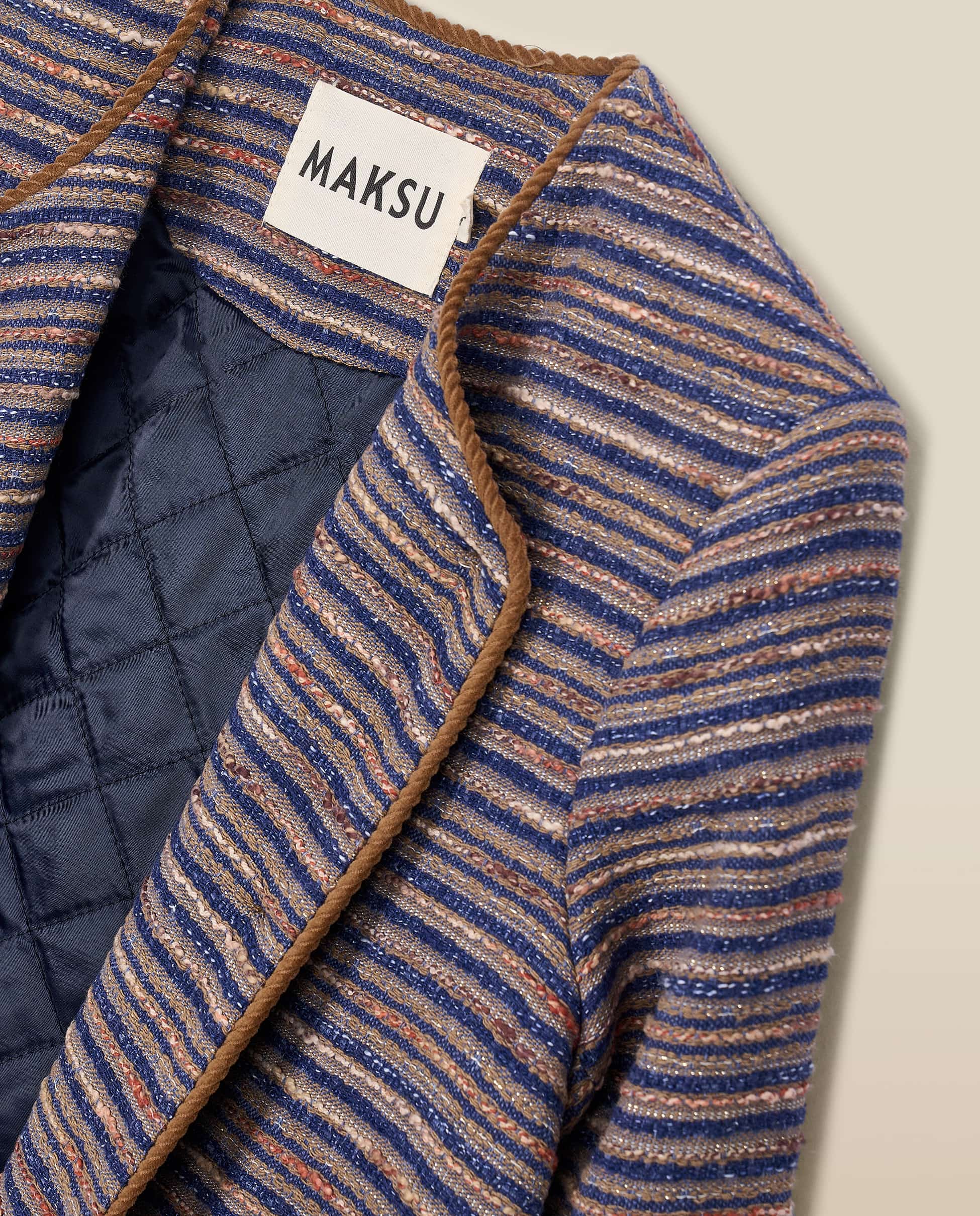 The MAKSU Petra jacket redefines modern elegance with its sharp tailoring and timeless design. Crafted from premium fabric, this cropped blazer features a structured silhouette with refined piping detailing. Its versatile blue and neutral hue adds a sophisticated edge, making it the perfect layering piece for day-to-night transitions. The cropped fit accentuates the figure, while the premium craftsmanship ensures long-lasting comfort and style. Whether paired with trousers for a power suit look or styled with jeans for casual chic, the Petra Jacket is your go-to for effortless sophistication.