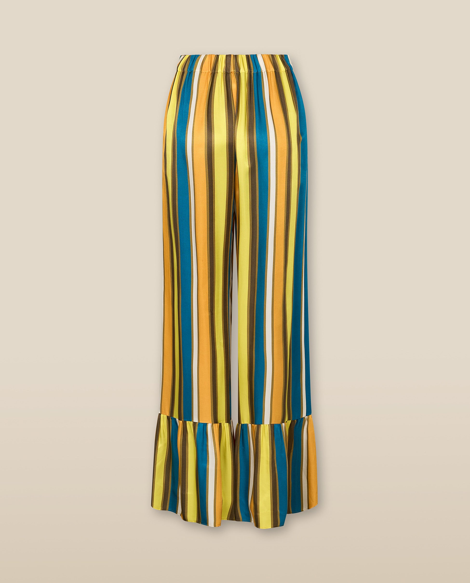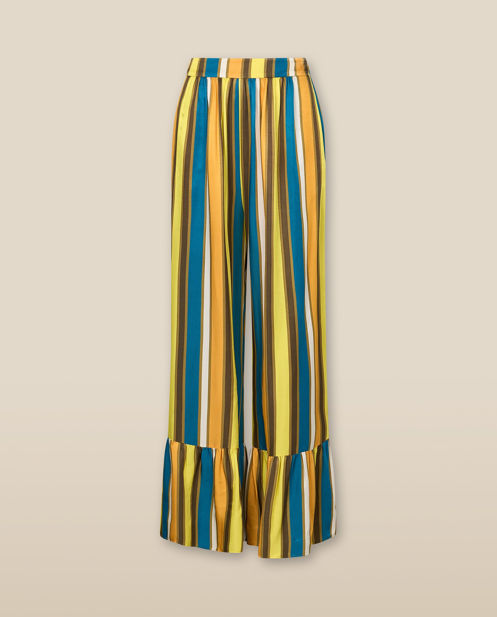 Designed for effortless elegance, the Popea Trousers feature vibrant multicoloured stripes in shades of yellow, orange, brown and blue, making them a standout choice for the spring-summer season. Cut to a flowing wide-leg silhouette, they offer exceptional comfort with a soft elasticated waistband, while the ruffled hem adds movement and volume.