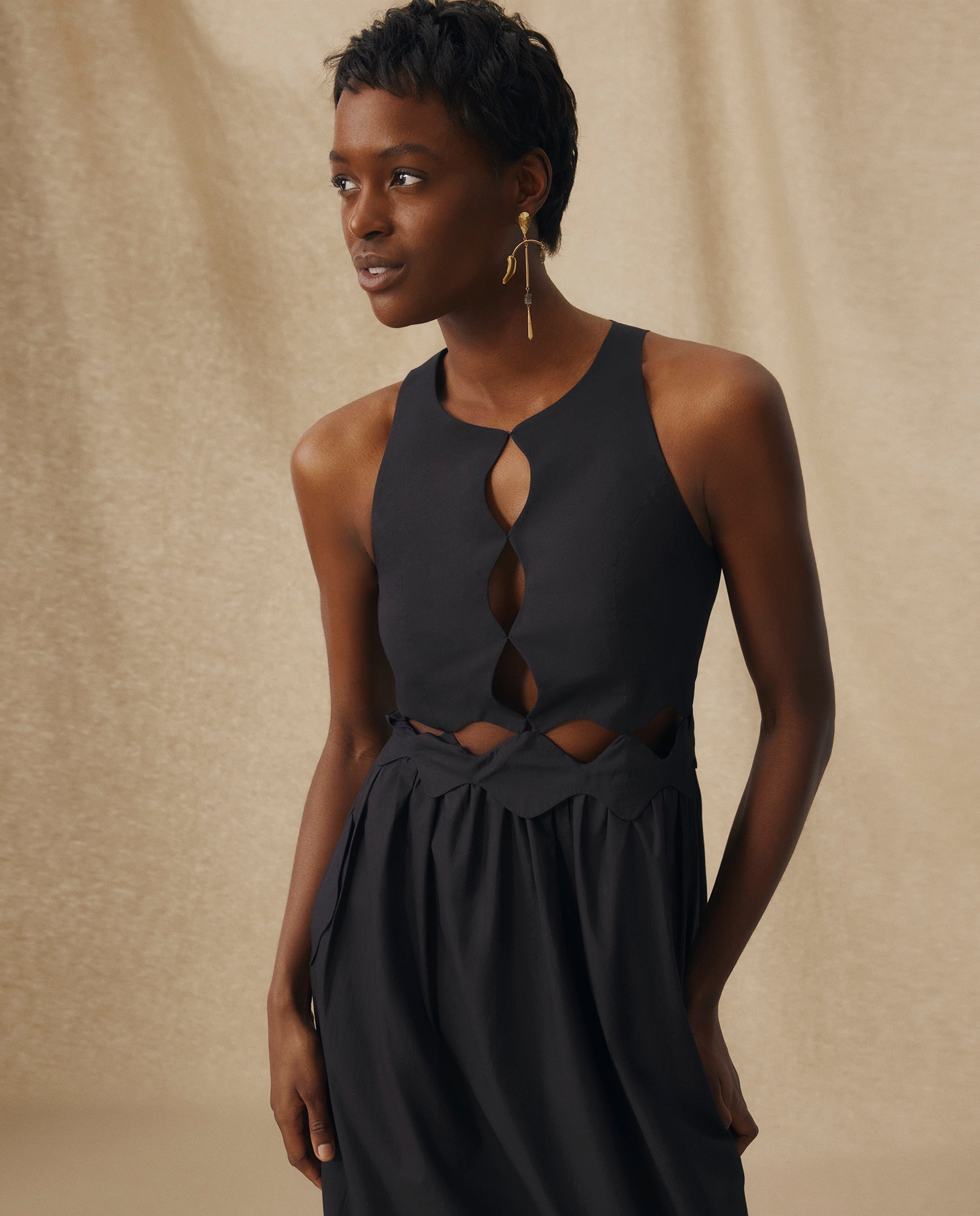 Striking yet refined, the Anusha Dress in black is a bold take on femininity. Crafted from 100% cotton in classic black, it features sculptural, scalloped cut-outs at the waist and bodice, a fitted silhouette through the top, and a voluminous midi-length skirt. The softly fluted hem adds movement and ease, while a concealed back zip ensures a clean finish.