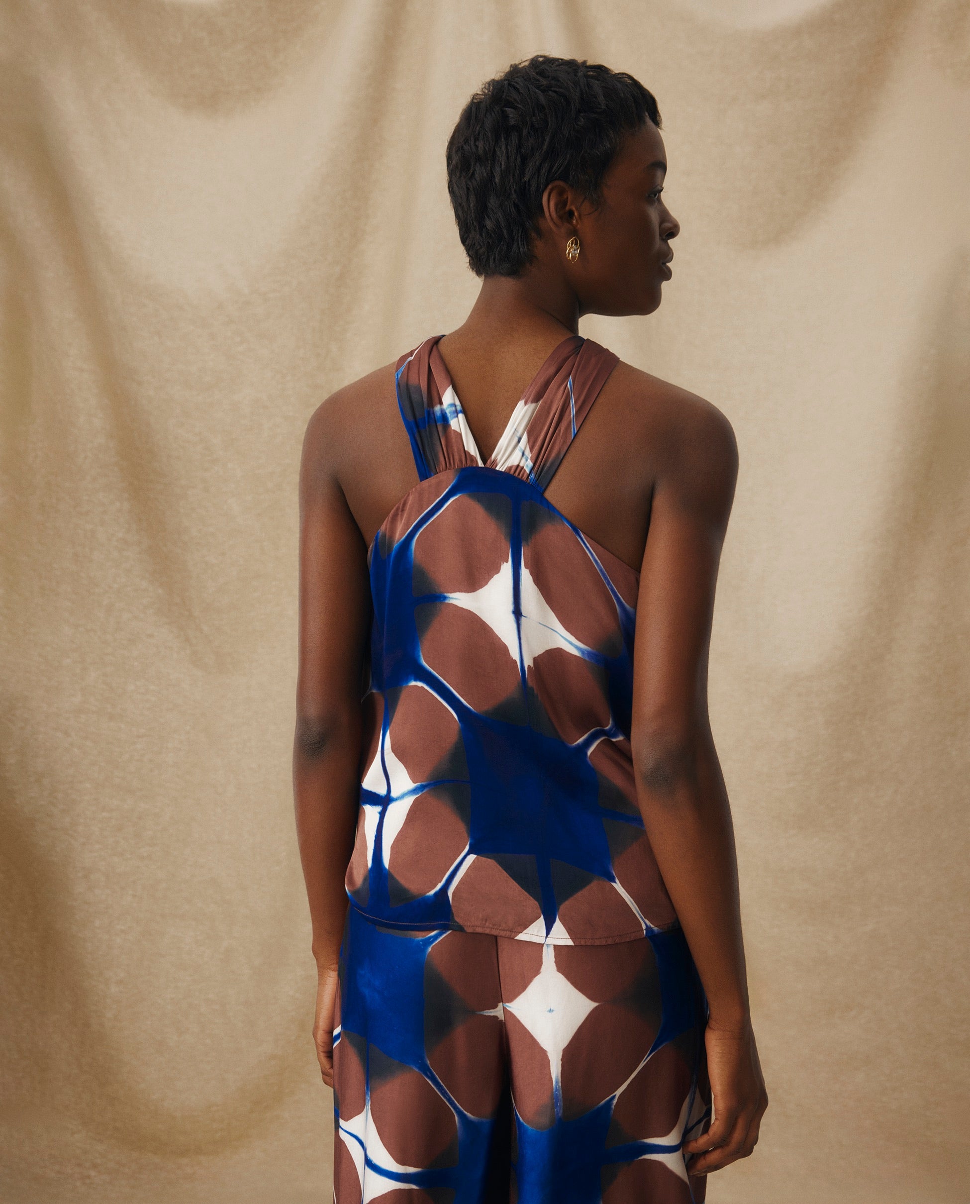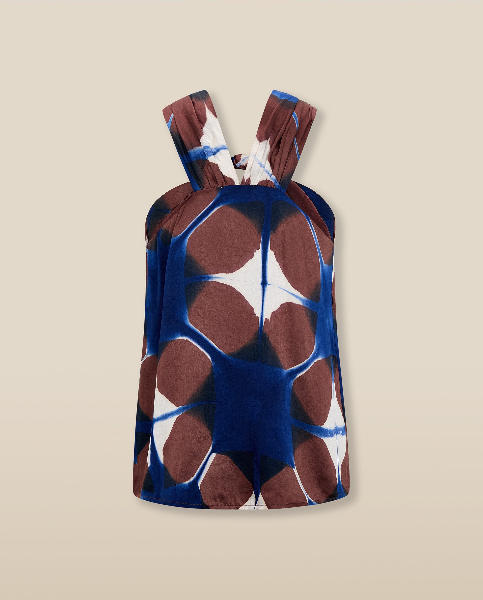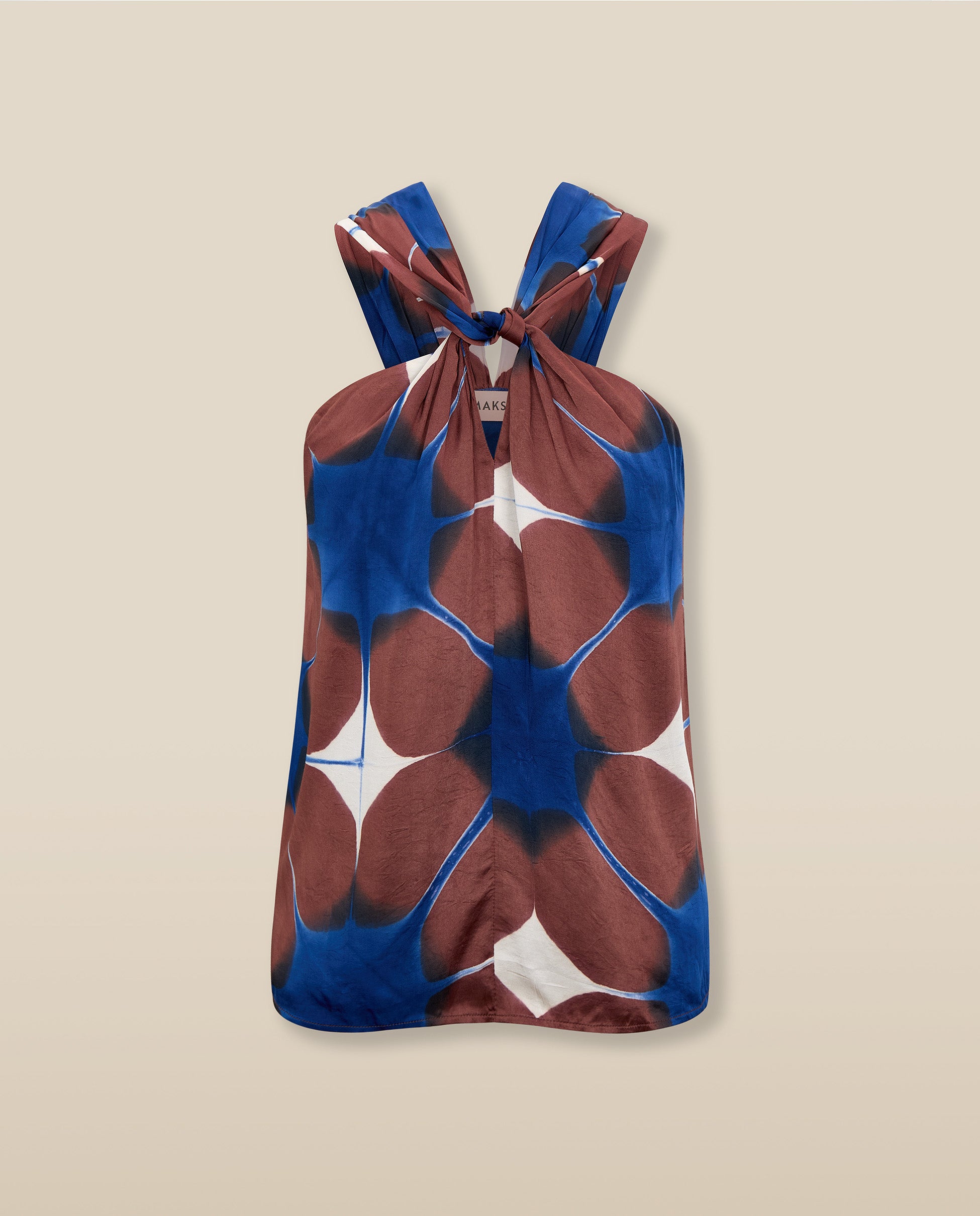 The Bruna Top is a vibrant addition to your summer wardrobe, cut in a fluid silhouette with a twisted halter neckline. Crafted using real tie-dye techniques, the abstract blue and burgundy print brings bold movement and colour. Wear it loose or tucked into the matching trousers for a coordinated look.