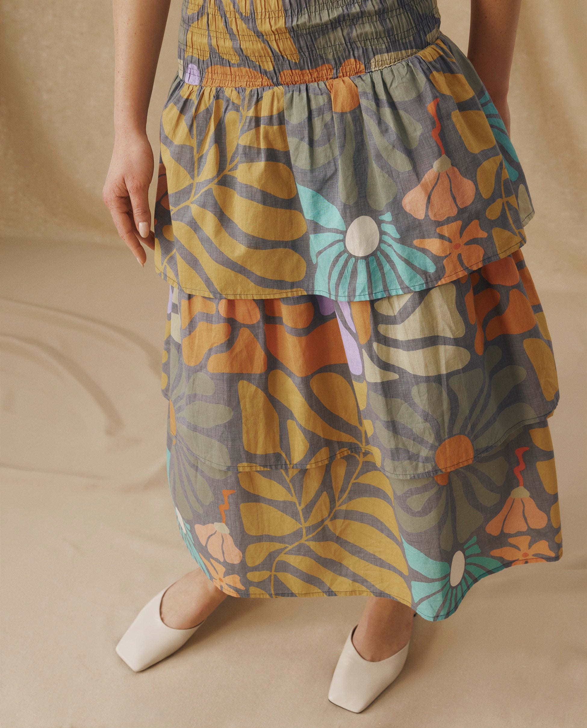 • Tiered midi skirt with soft ruffles for elegant movement