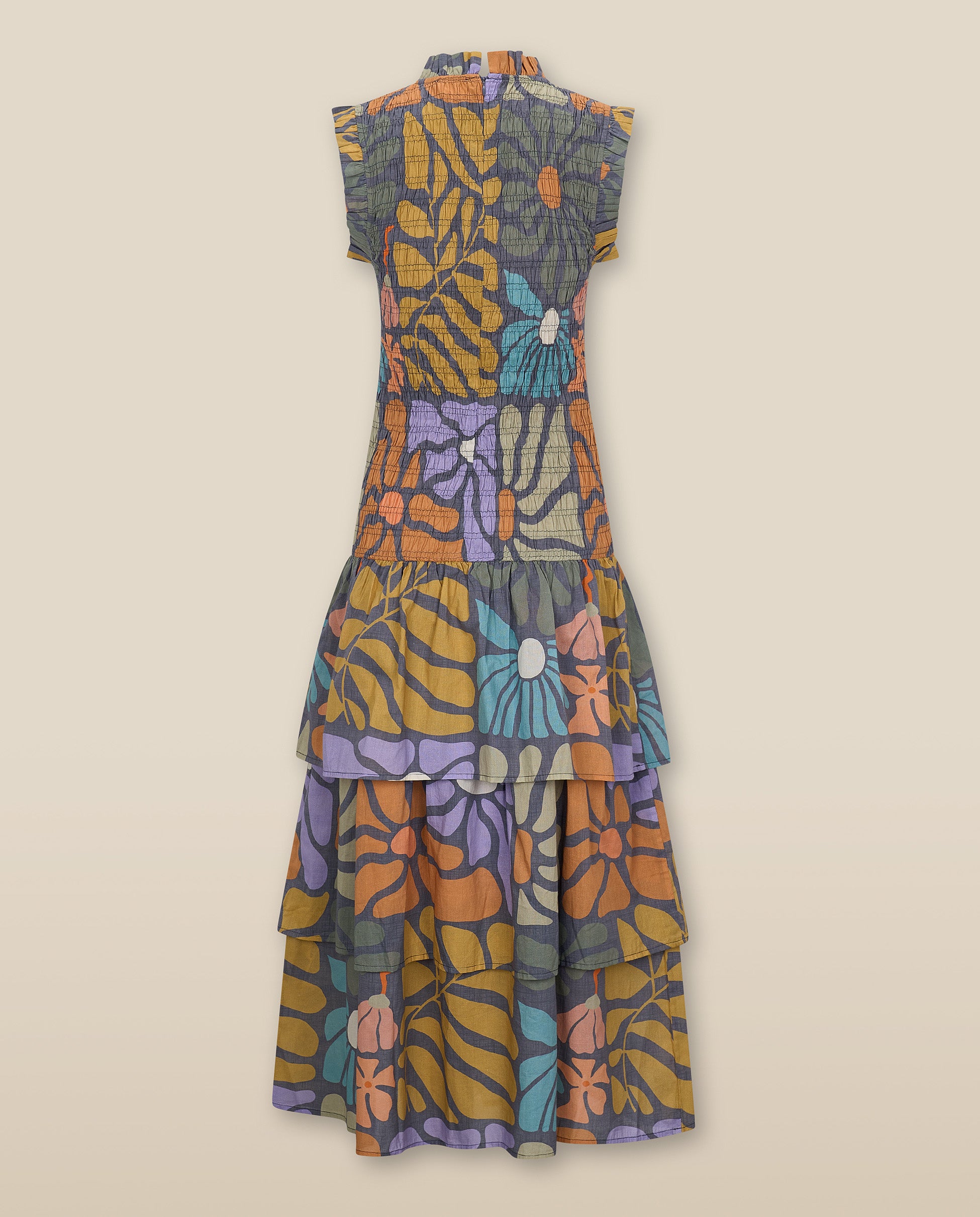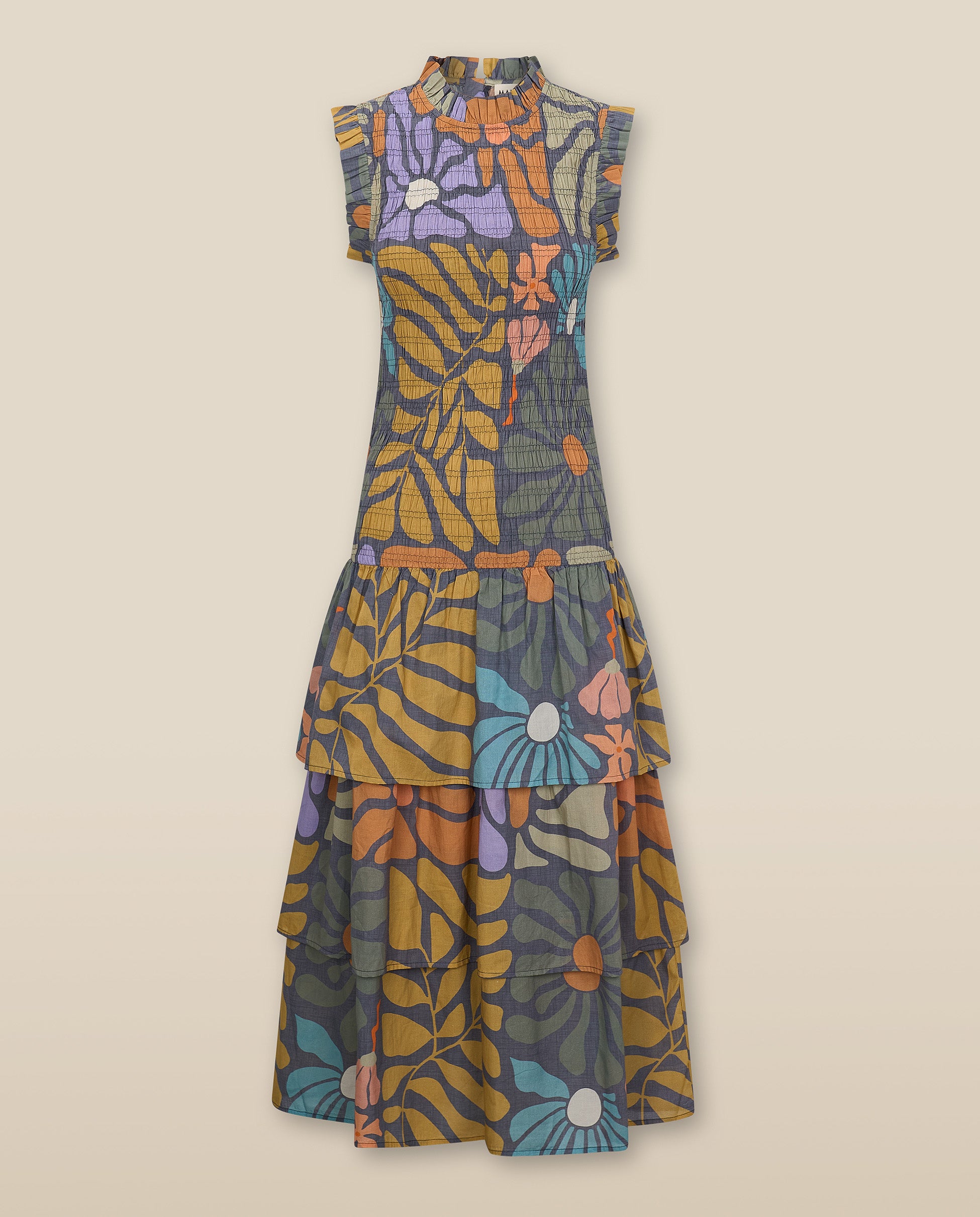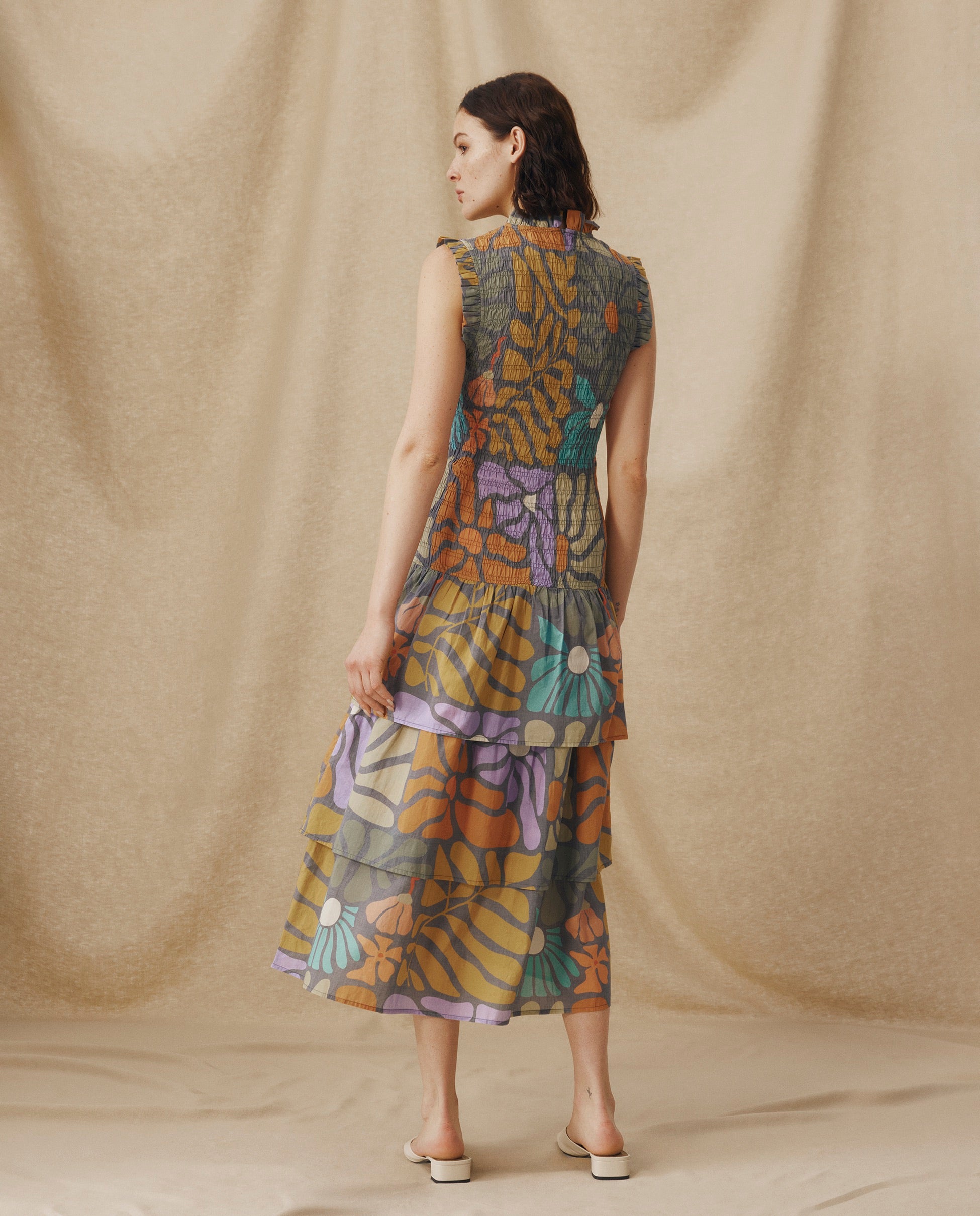 A playful take on femininity, the Charita Dress is cut from airy 100% cotton in a vibrant multicolour botanical print. The smocked bodice contours the figure with ease, while the tiered skirt adds soft volume and movement. Finished with delicate ruffle trims, it’s a romantic silhouette with everyday versatility.
