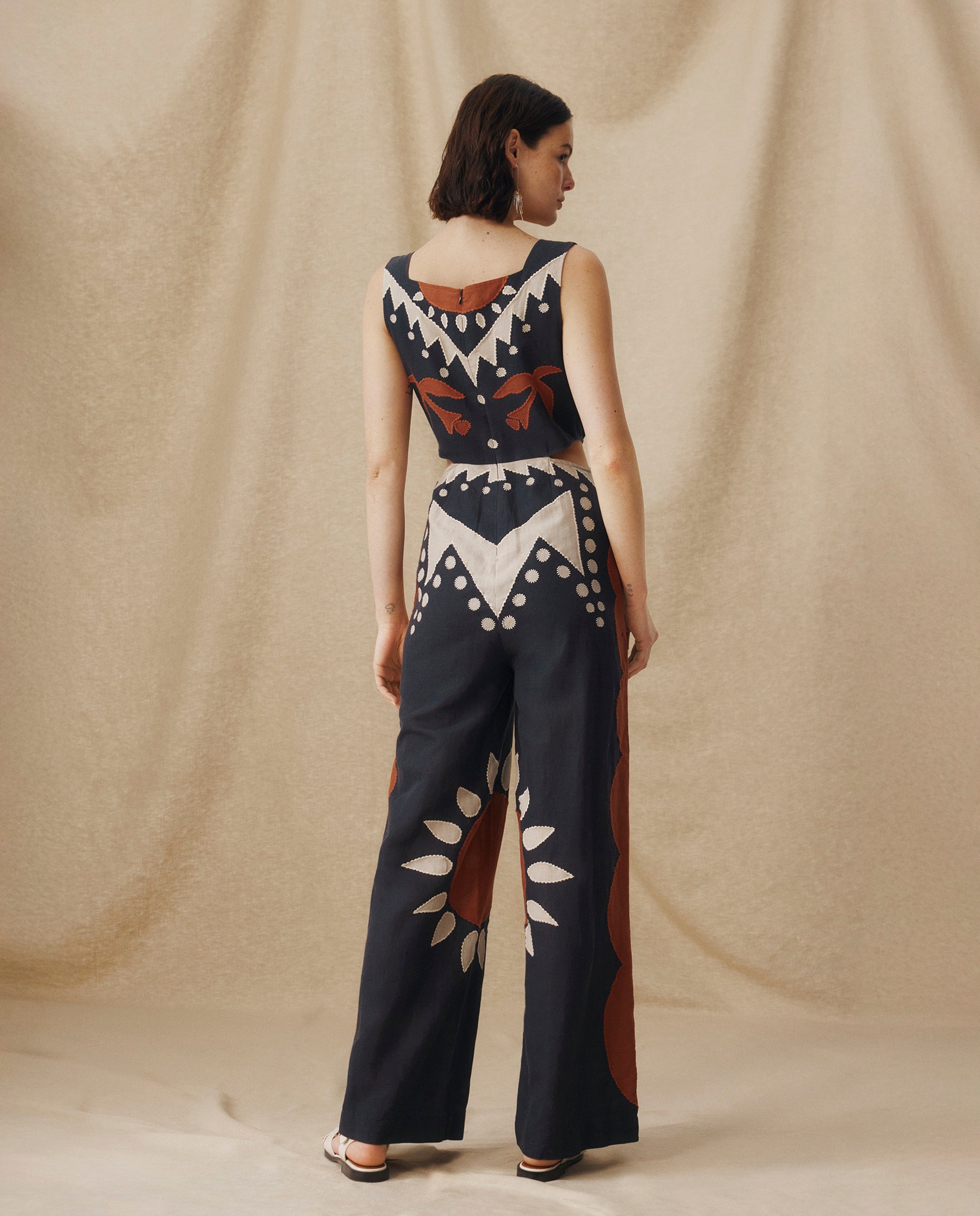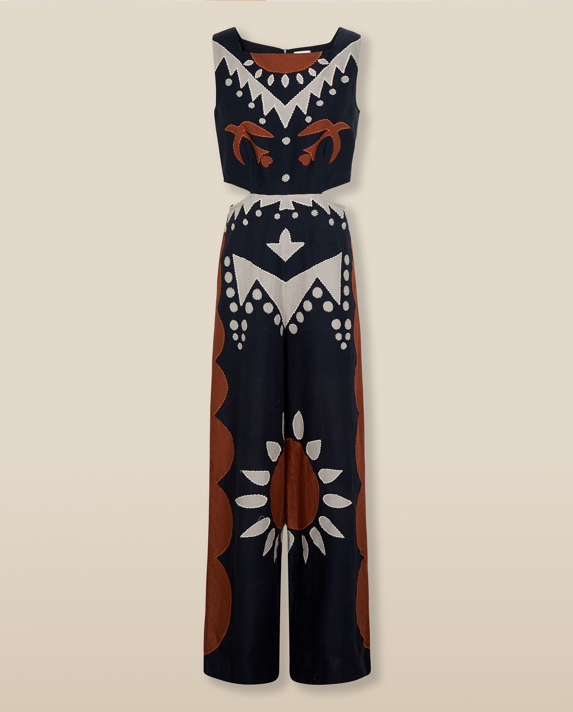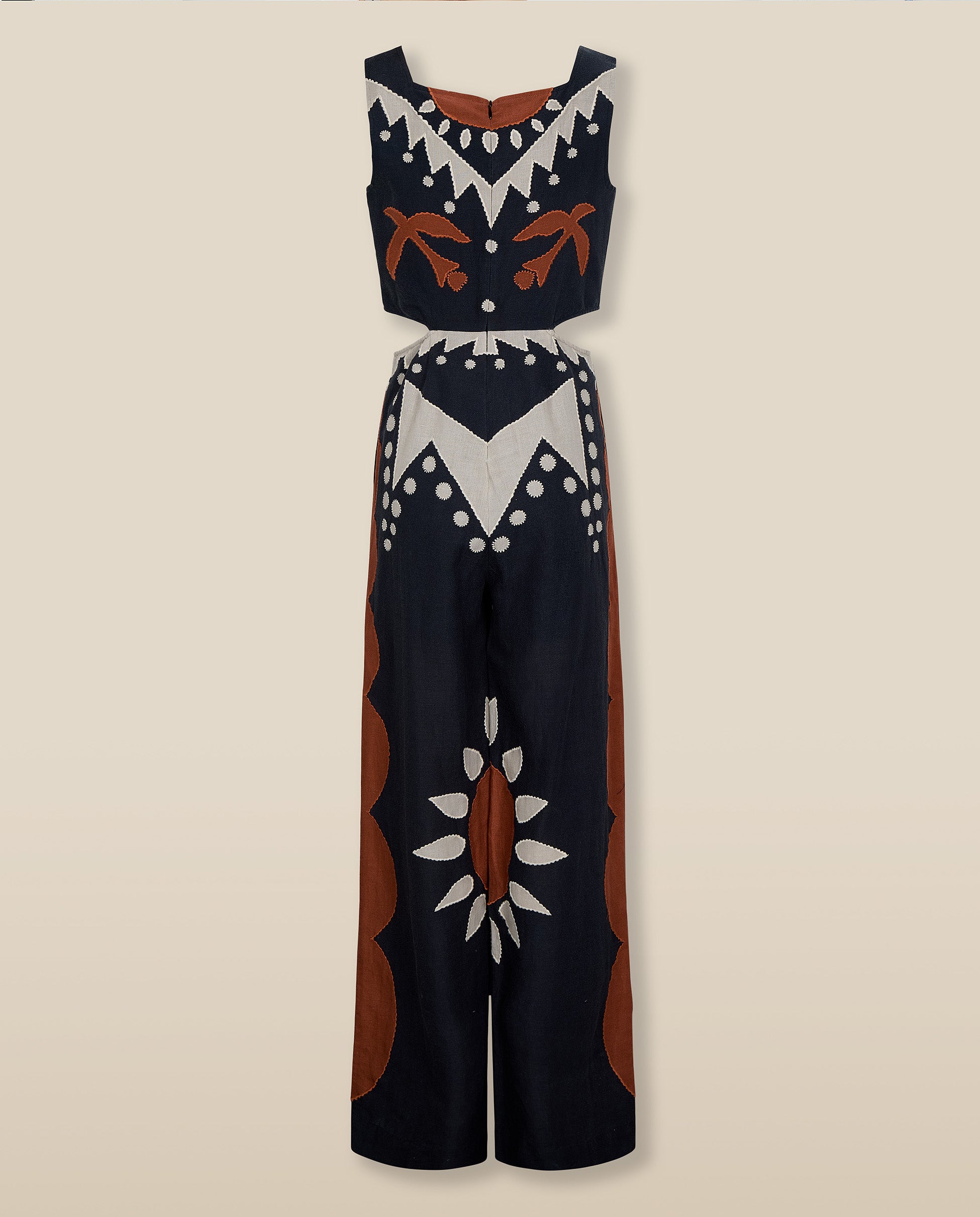 Bold and artful, the Genoveva Jumpsuit channels statement-making ease through its striking geometric embroidery and sculptural silhouette. Crafted from a breathable cotton-linen blend, it features a square neckline, subtle waist cut-outs and wide-leg trousers for a confident, elongating fit. The vivid motif in terracotta and ecru adds handcrafted character to this standout piece.