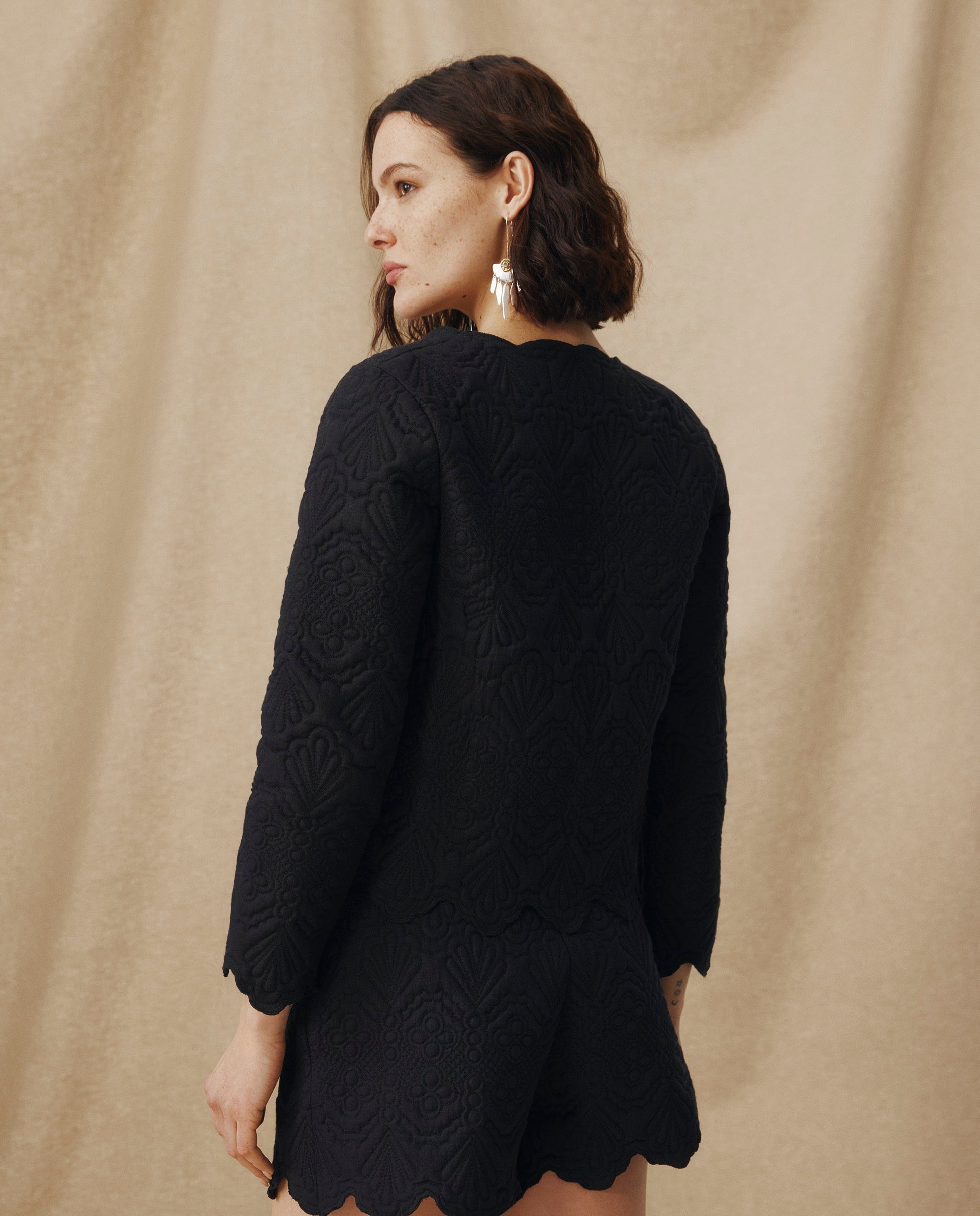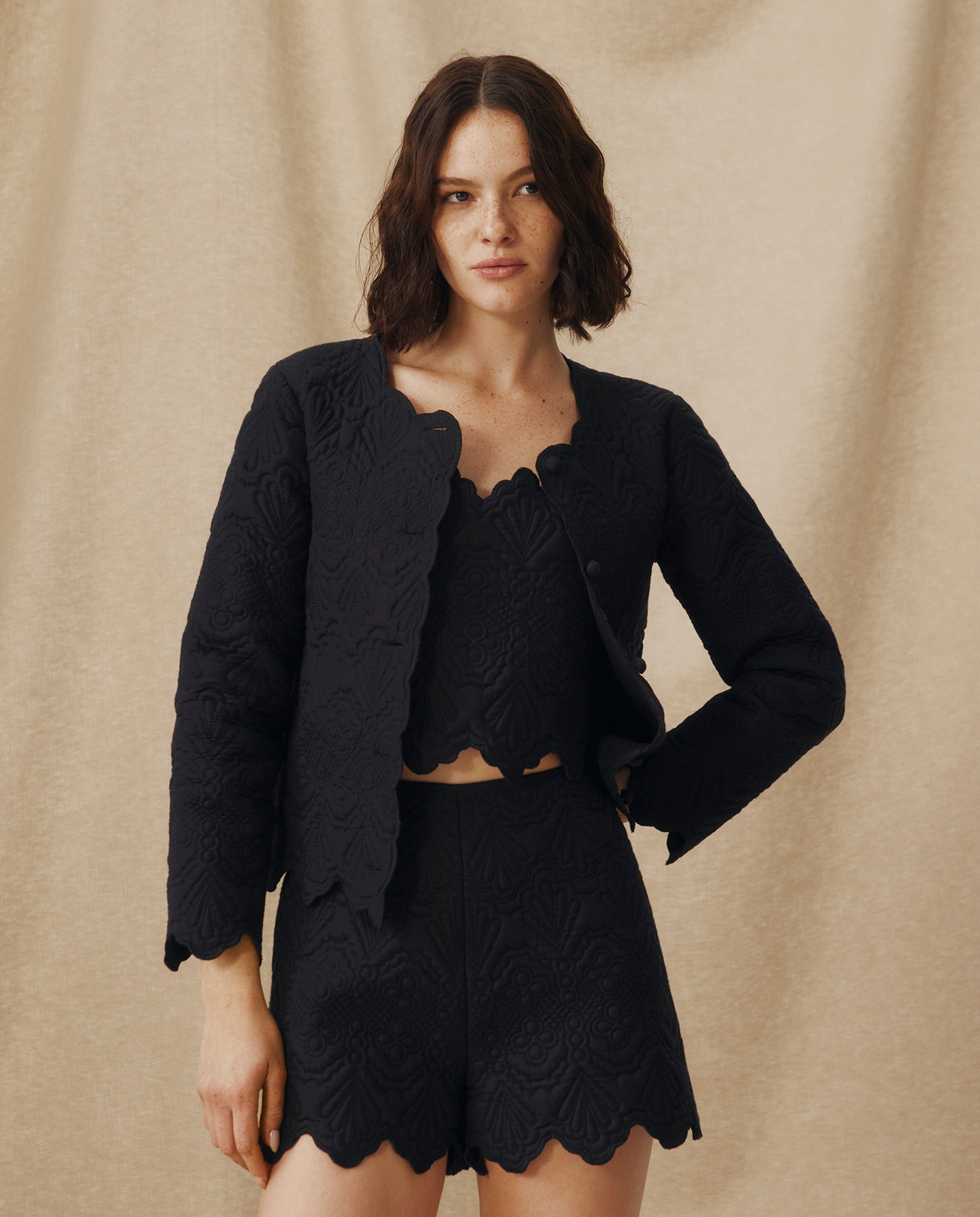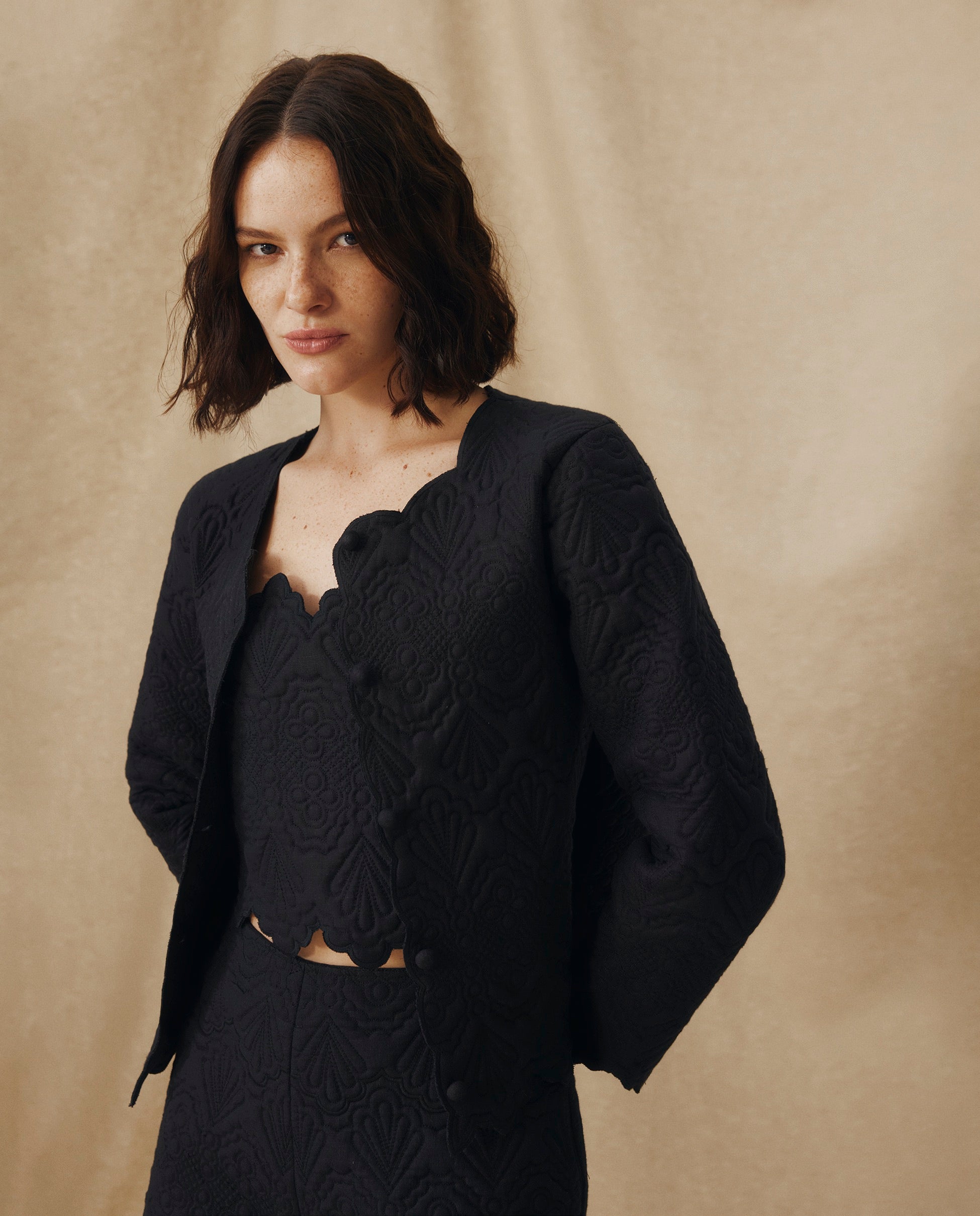 Delicately embroidered with a trapunto-inspired finish, the Ishani Jacket is a modern ode to craftsmanship. Cut from 100% linen, it balances structure and softness with its straight silhouette, fabric-covered buttons and scalloped hems. Wear it as a lightweight outer layer or styled as a set with the coordinating pieces.