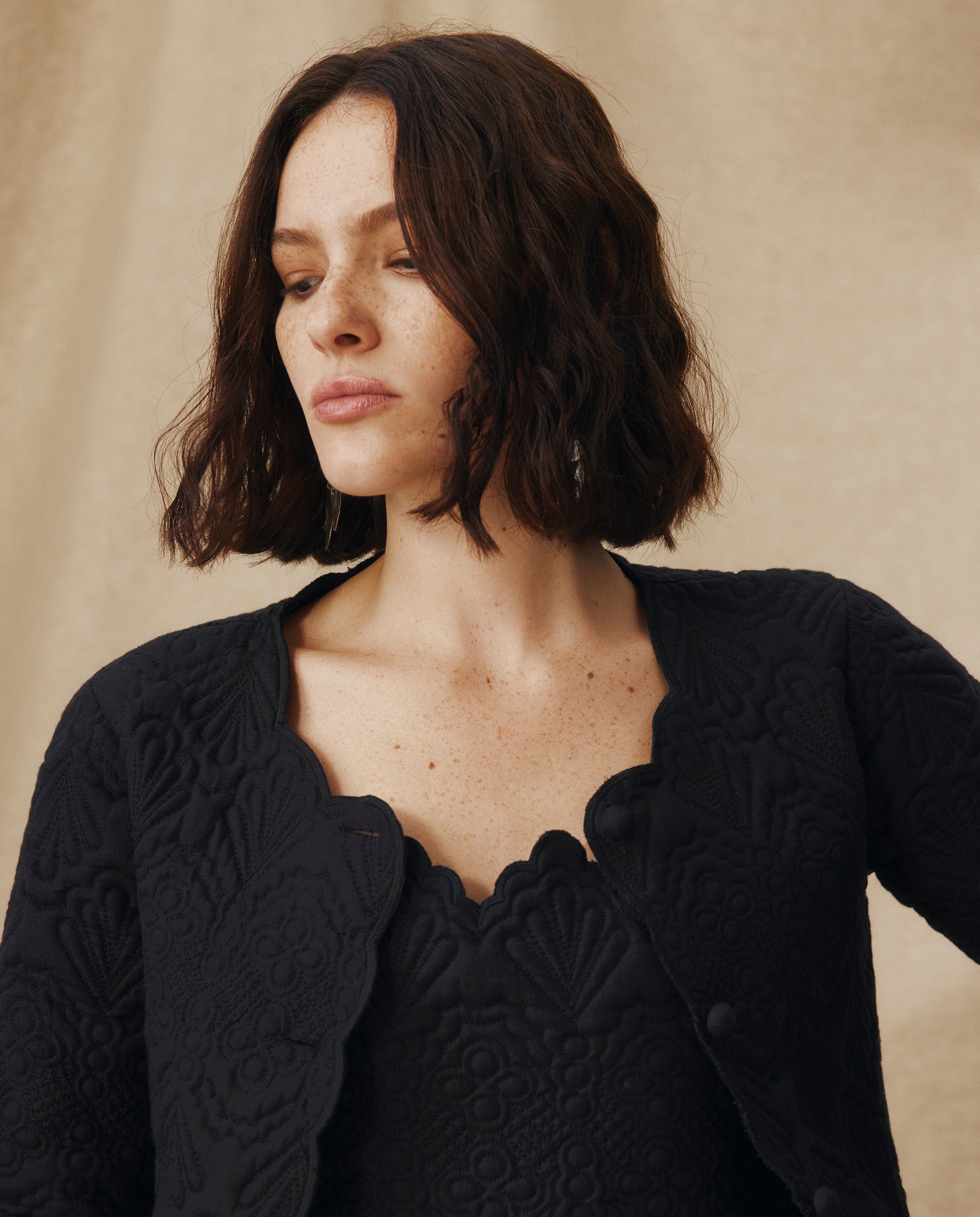 • Scalloped edges and tonal buttons for a refined finish