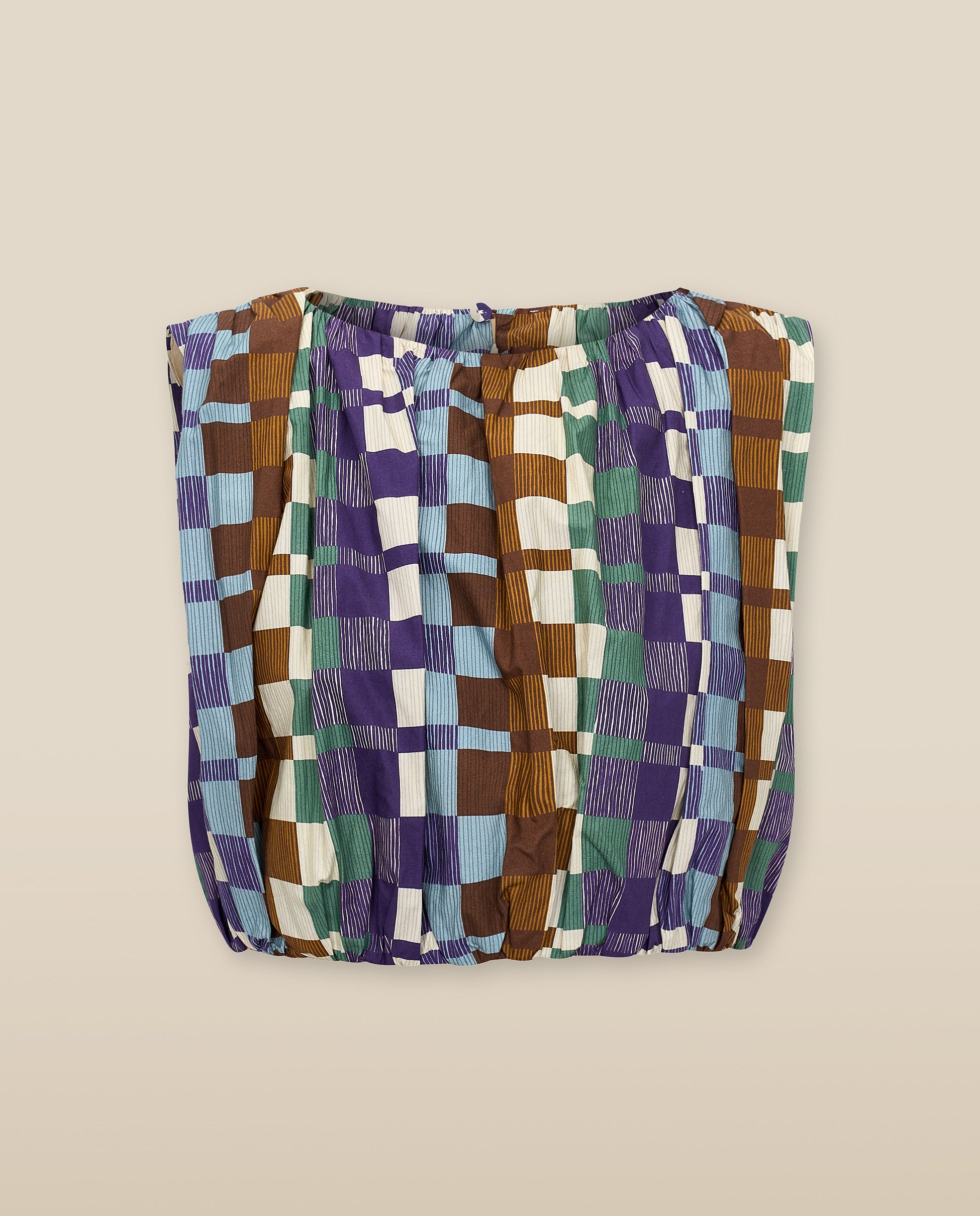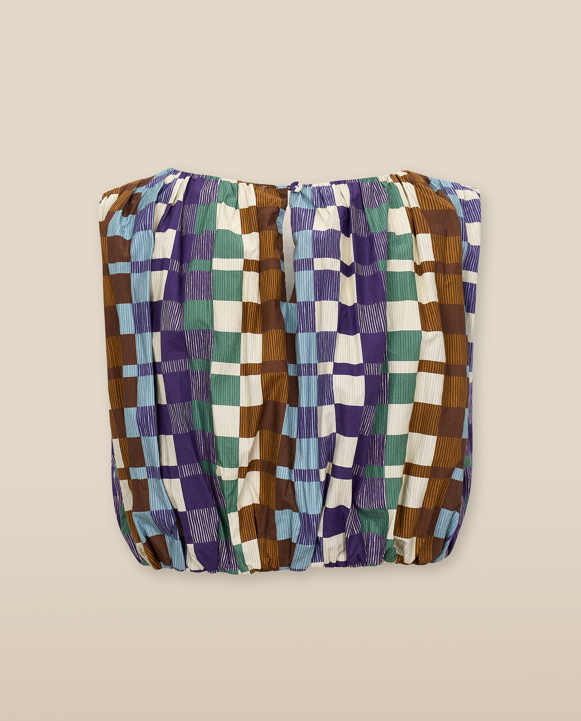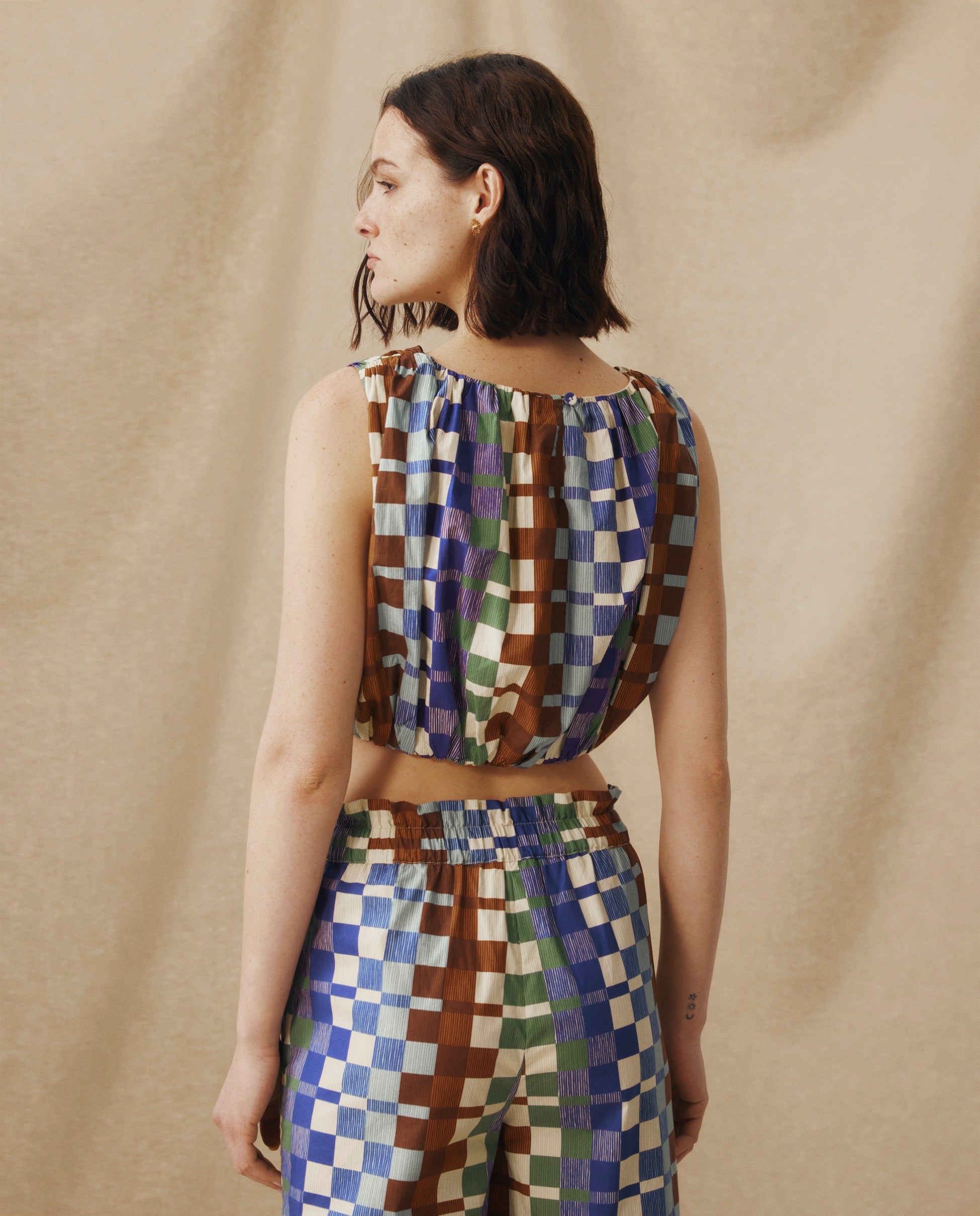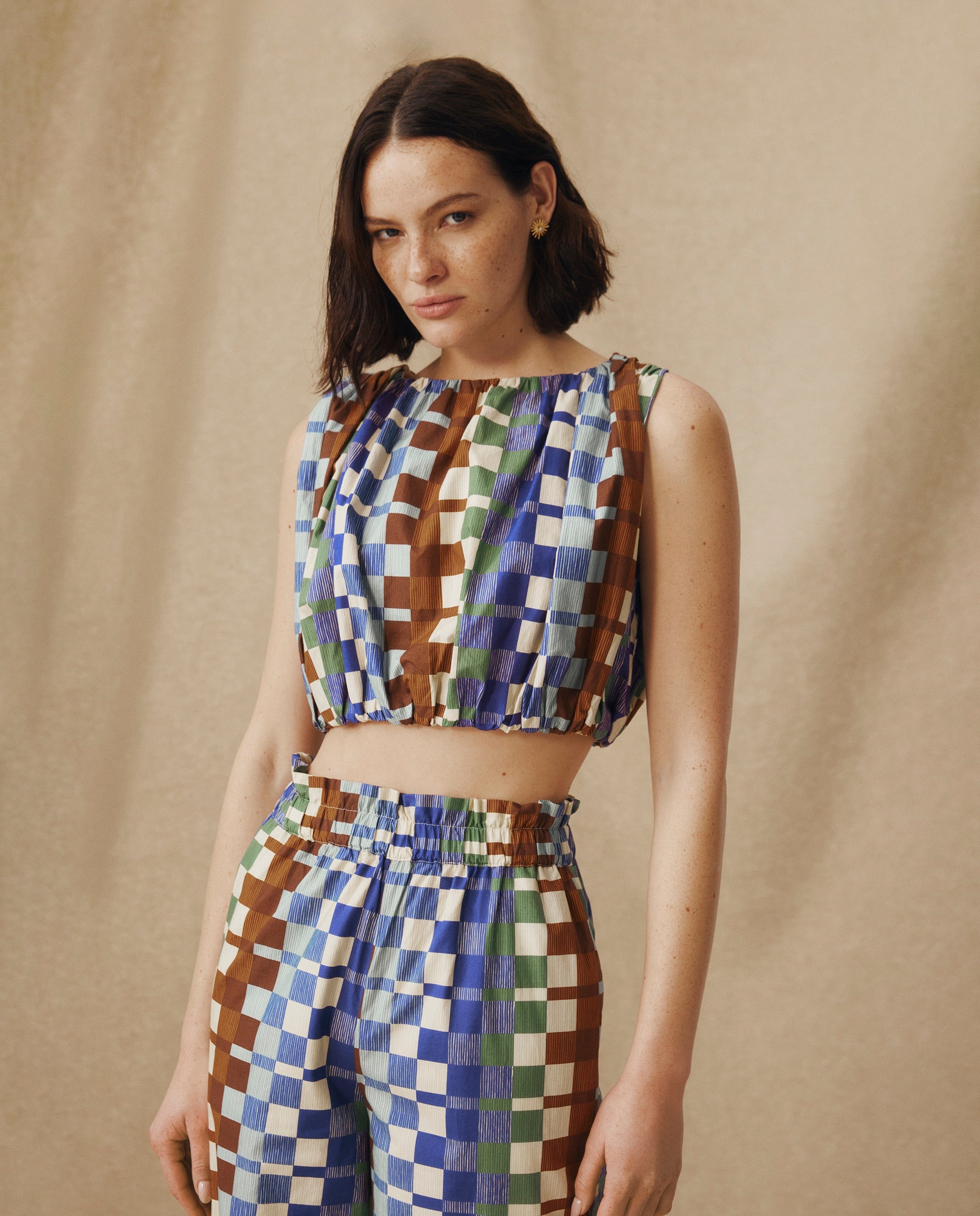 A vibrant interpretation of modern bohemia, the Morinal top is defined by its voluminous silhouette and bold geometric print. Crafted from 100% cotton, it features a gathered neckline, cropped hem and elasticated edges for a flexible fit. Pair it with the matching trousers for a striking set or style it solo for effortless impact.