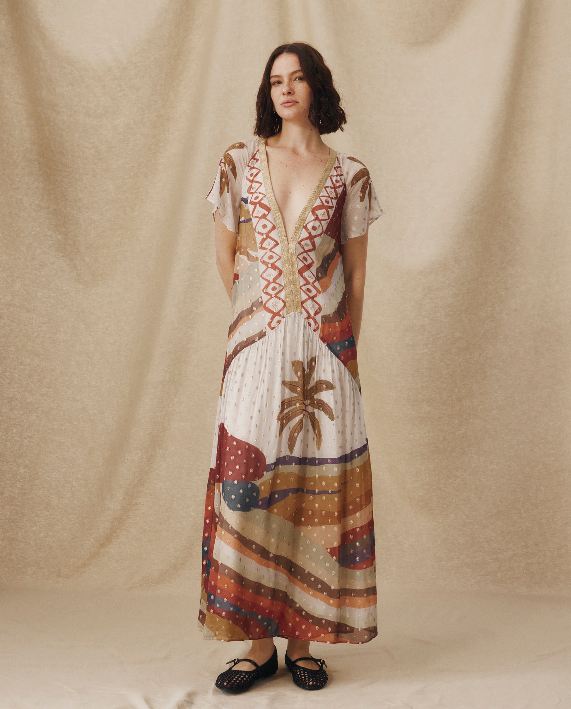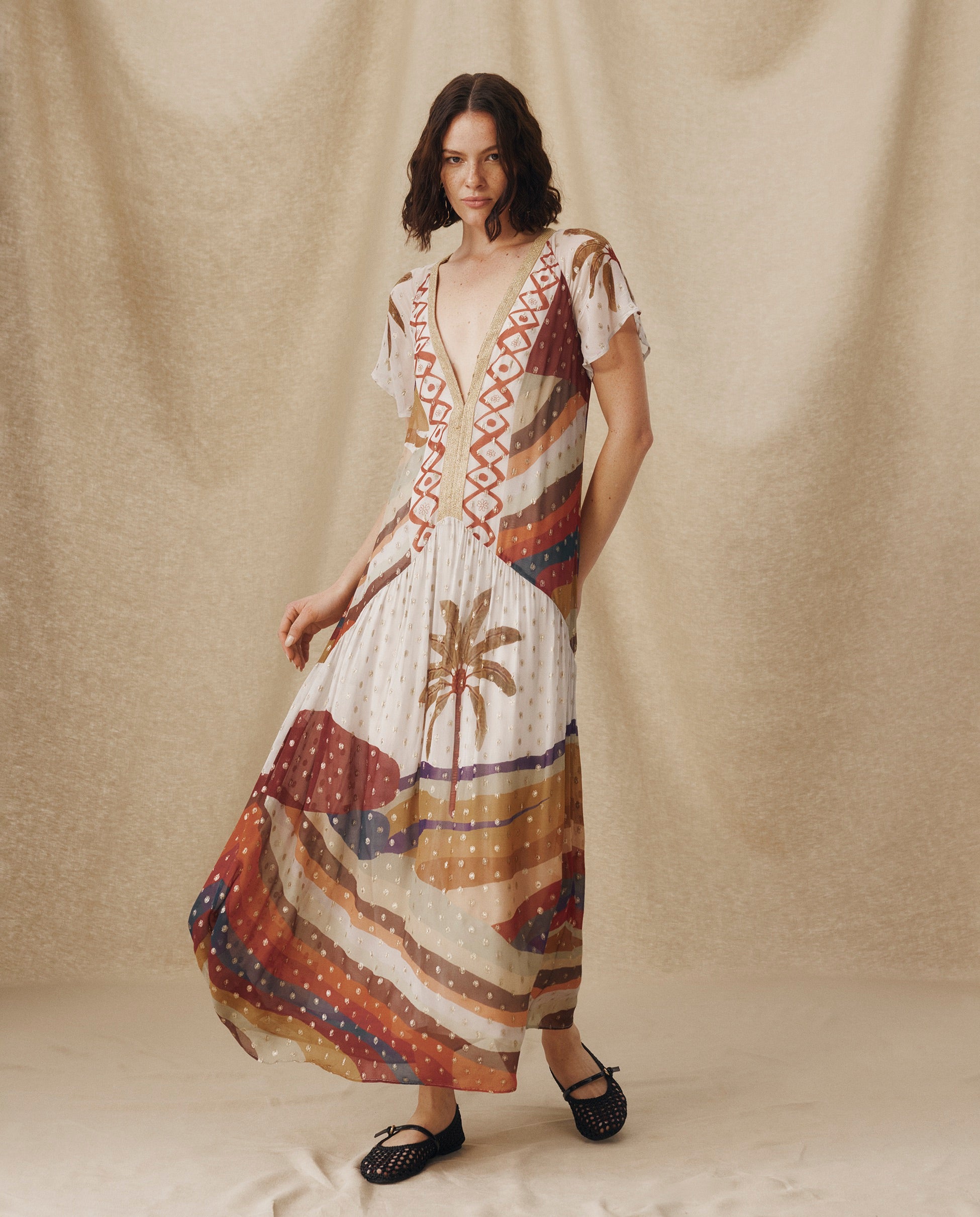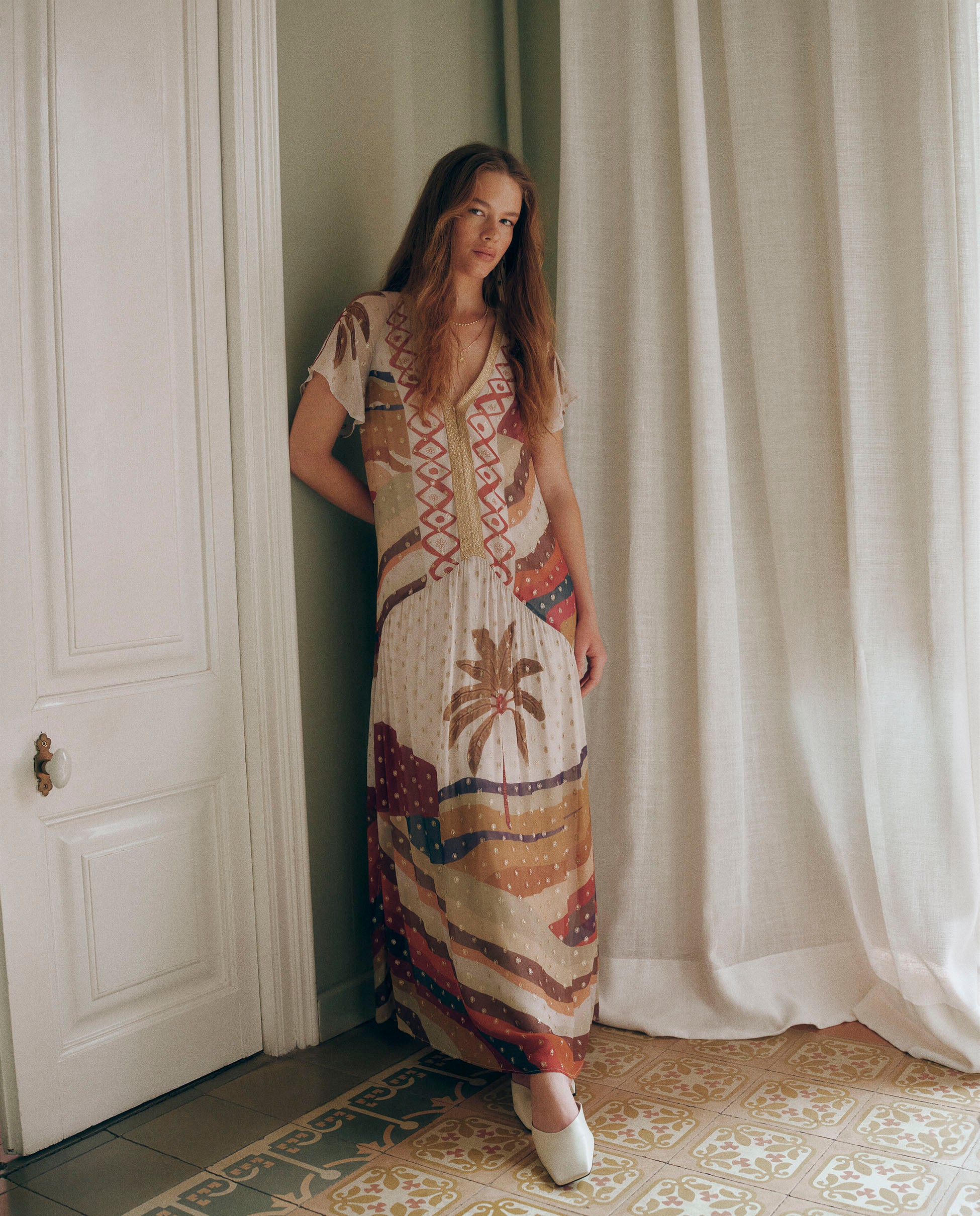 The Naomi Dress blends bohemian spirit with artisanal detail. Crafted in a lightweight printed fabric, this style features a V-neckline framed by tonal gold embroidery and airy short sleeves. The drop-waist silhouette and softly gathered skirt create fluid movement with every step. A front hook-and-eye fastening allows for versatile styling—from a refined to a plunging neckline.