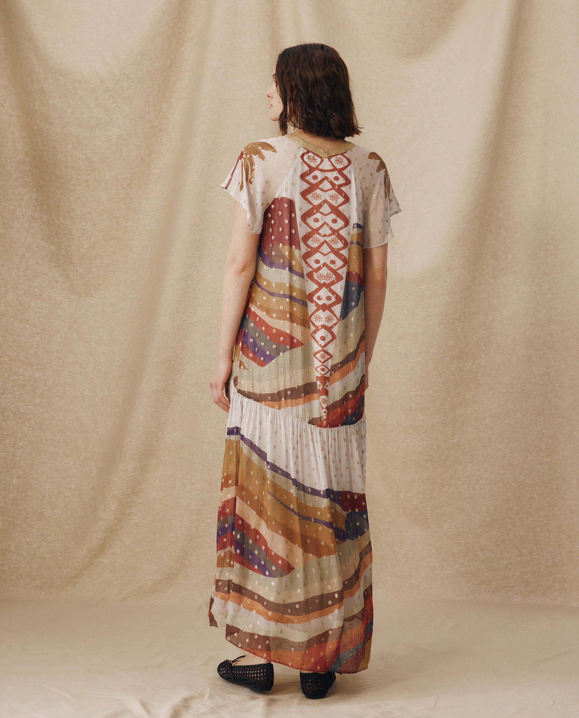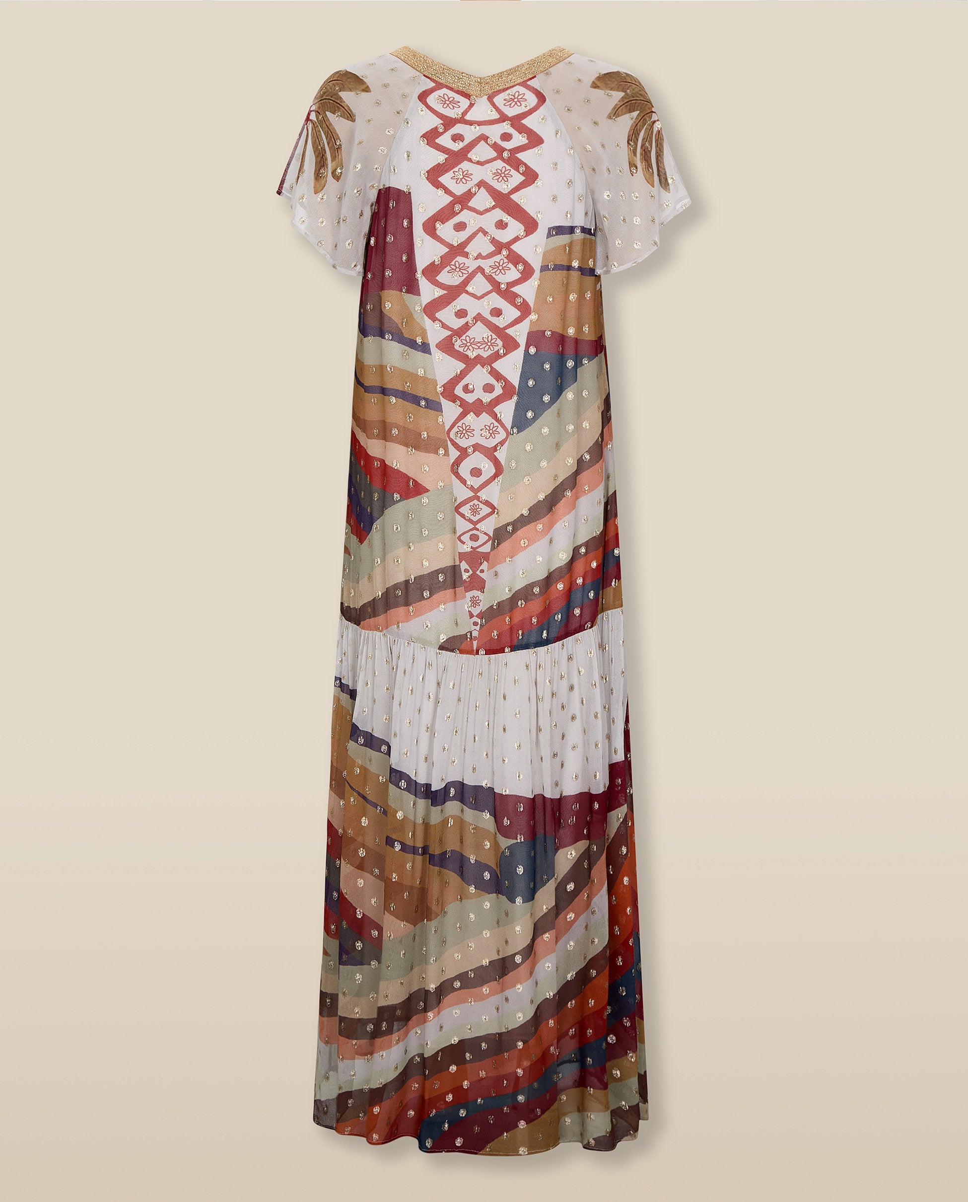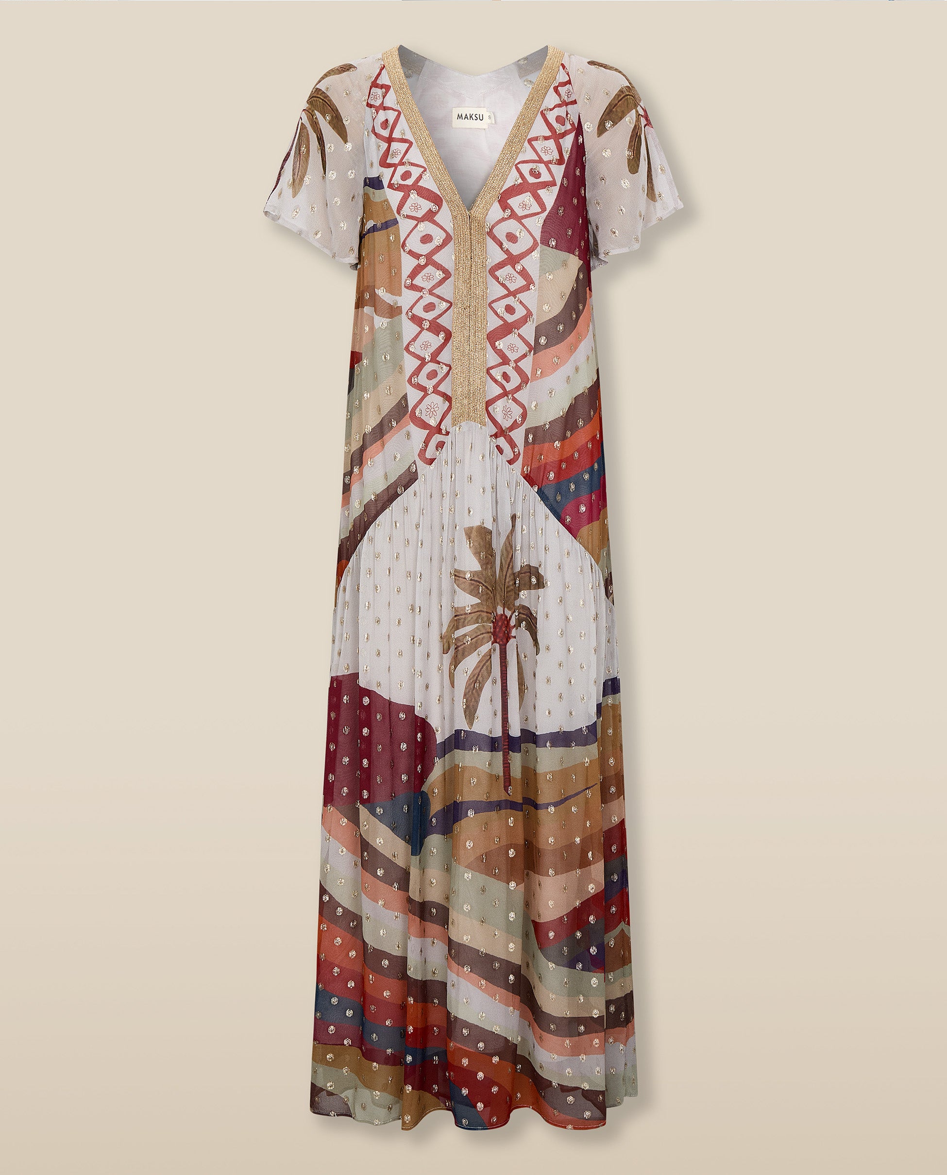 The Naomi Dress blends bohemian spirit with artisanal detail. Crafted in a lightweight printed fabric, this style features a V-neckline framed by tonal gold embroidery and airy short sleeves. The drop-waist silhouette and softly gathered skirt create fluid movement with every step. A front hook-and-eye fastening allows for versatile styling—from a refined to a plunging neckline.