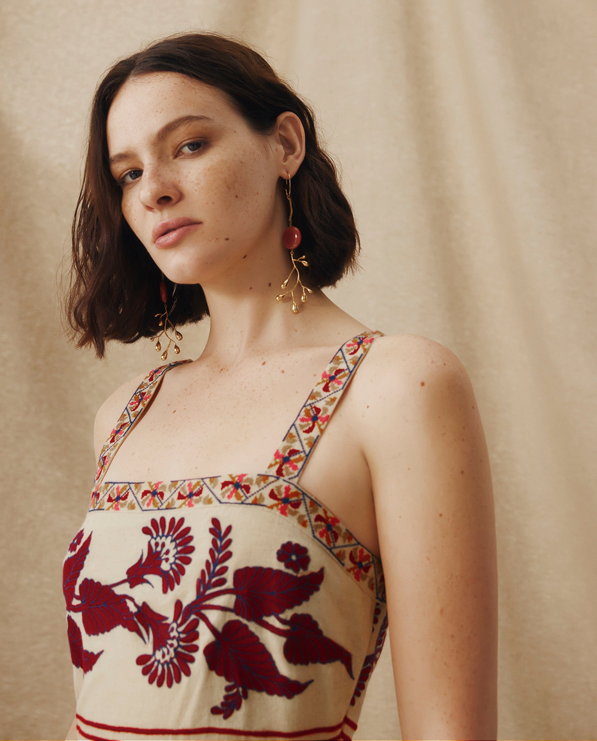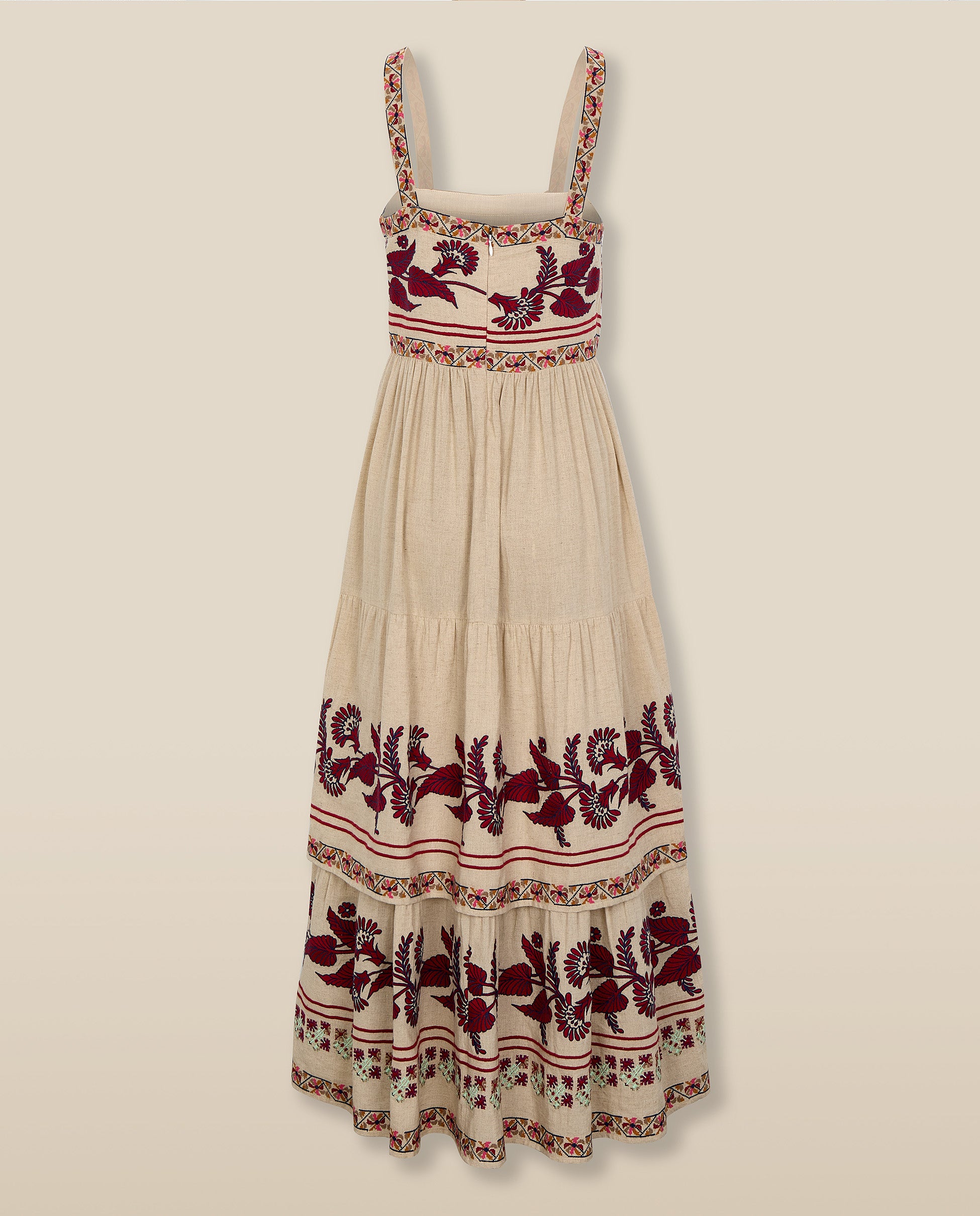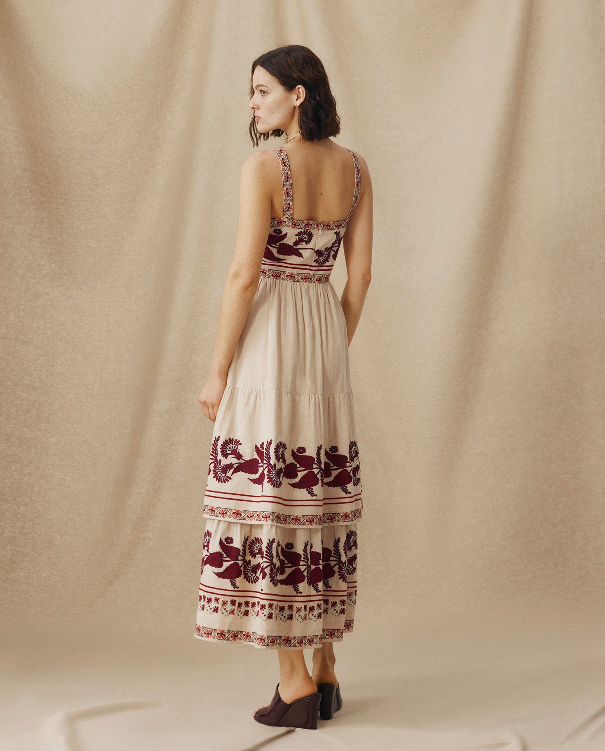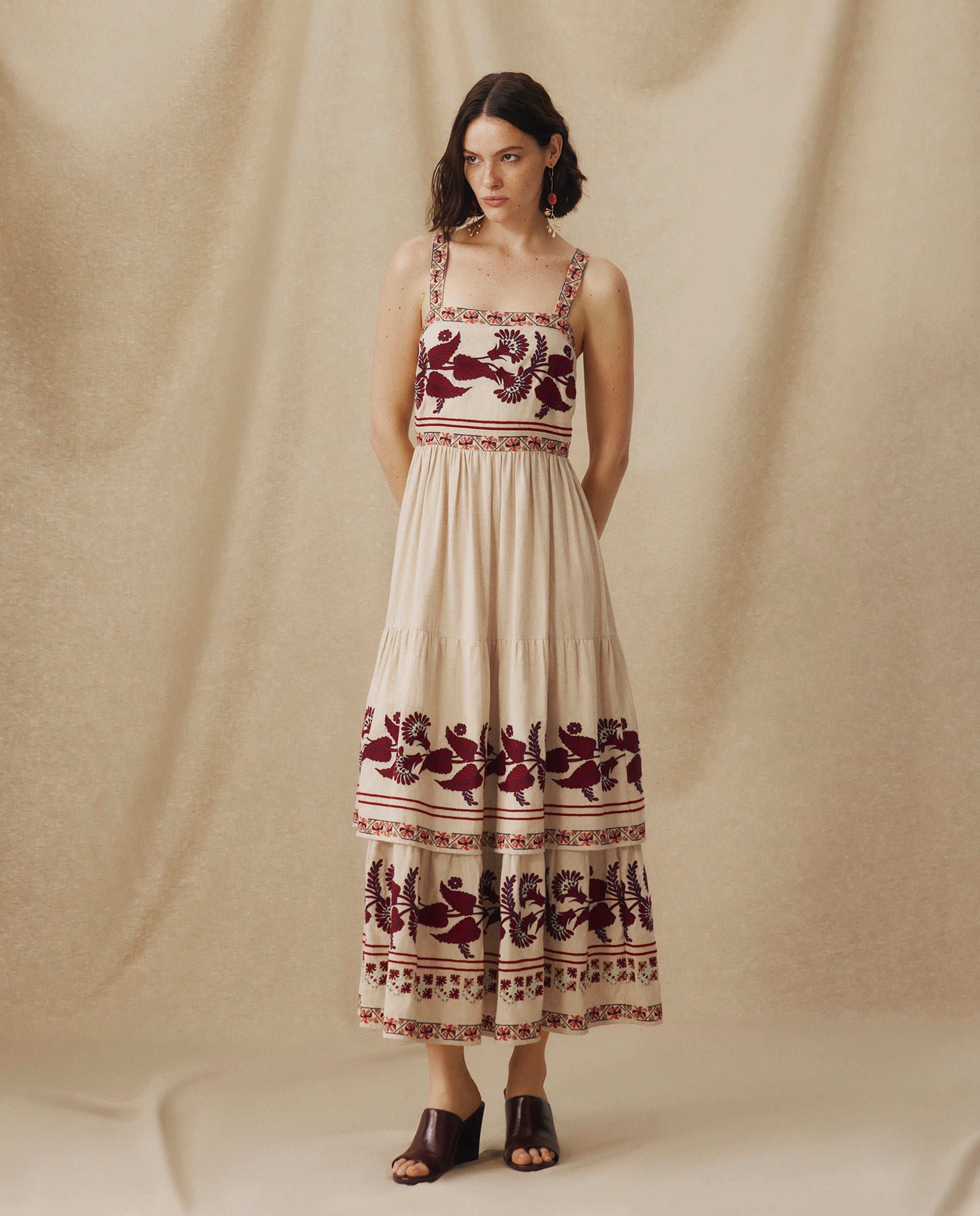 Rooted in artisanal detail and soft structure, the Neesha Dress is defined by its intricate embroidery and tiered silhouette. Cut from a soft, lightweight blend with a natural slub texture, this midi design features wide straps, a square neckline and floral embroidery in deep burgundy tones. The tiered skirt adds volume and fluidity, while the concealed back zip ensures a seamless finish.