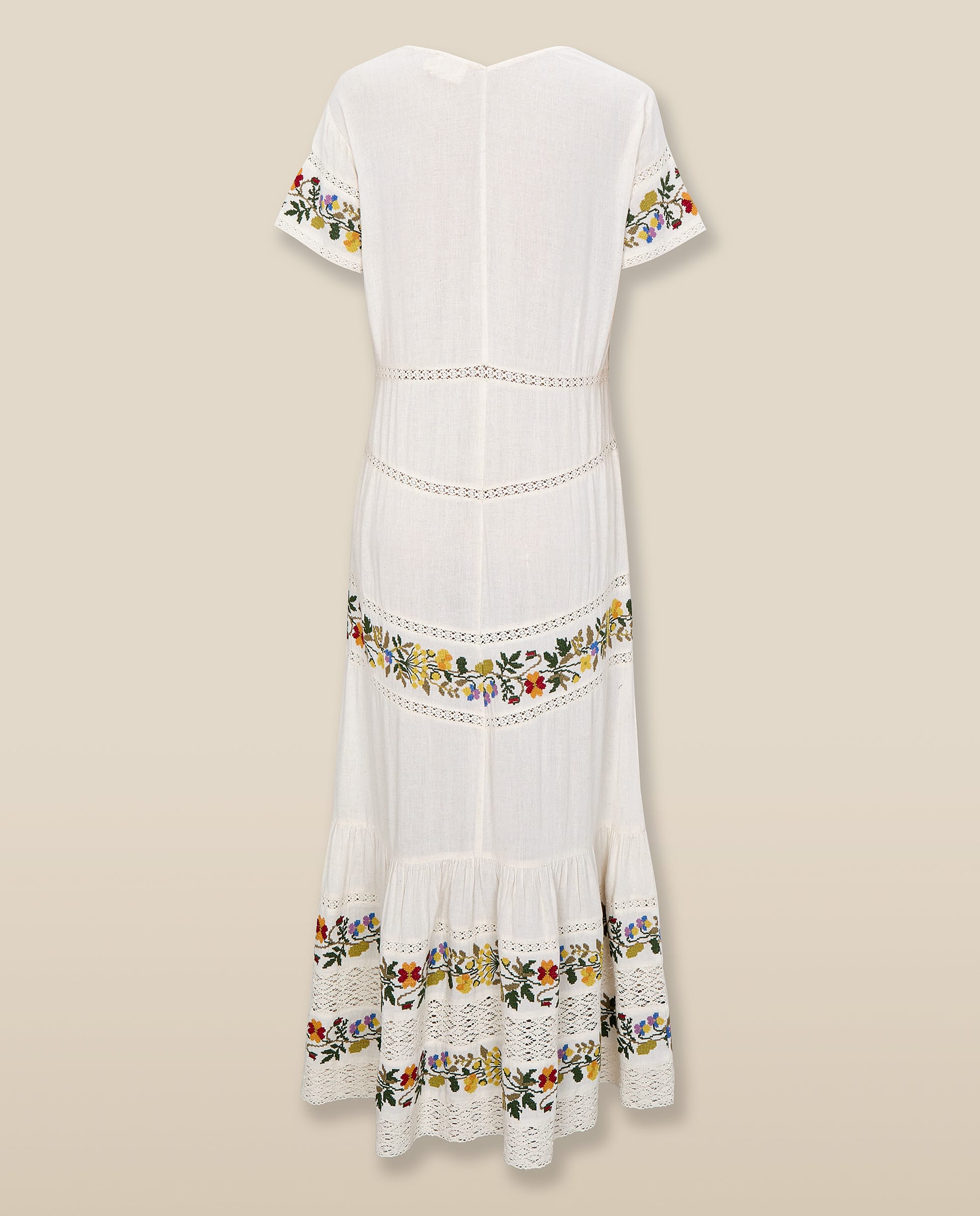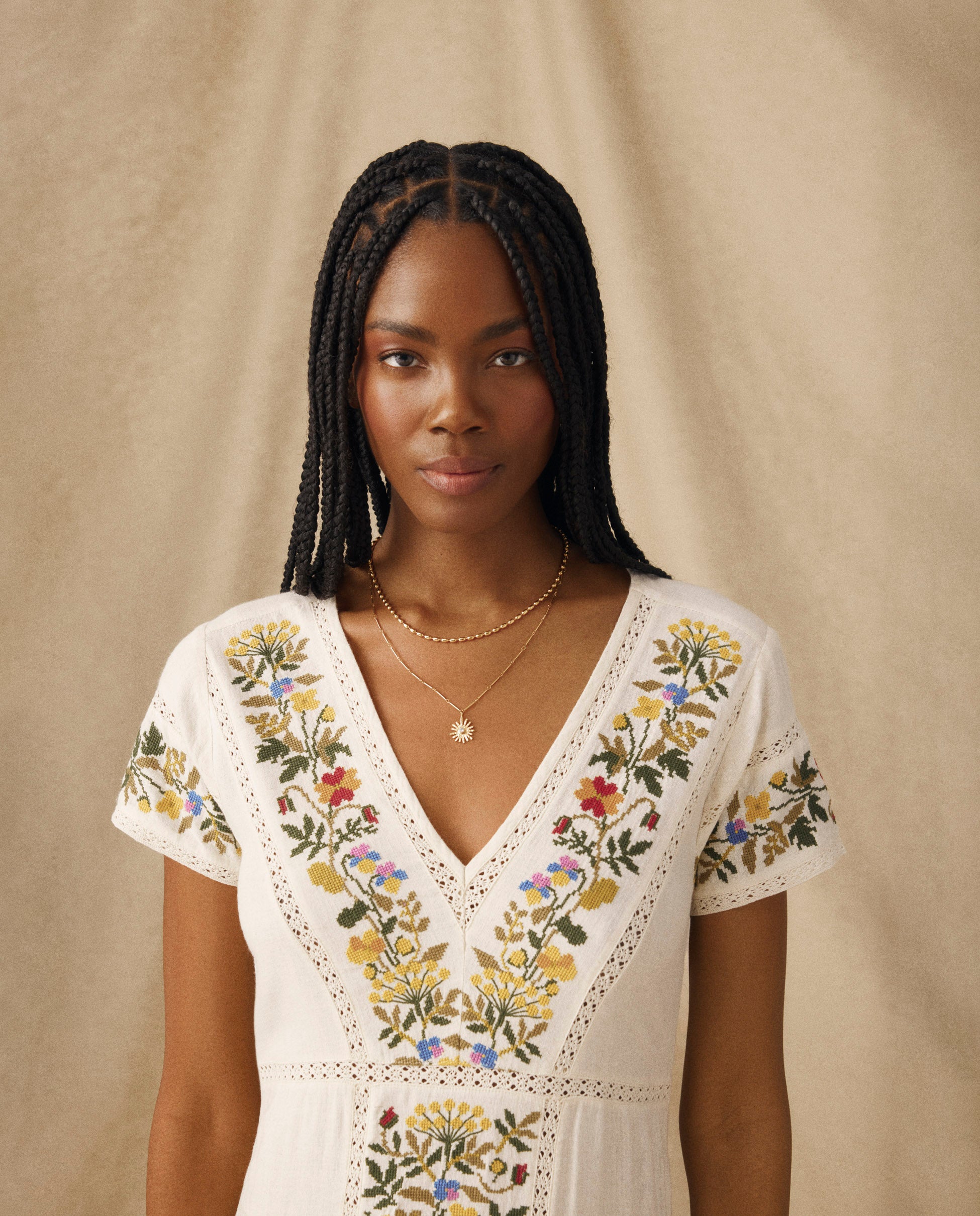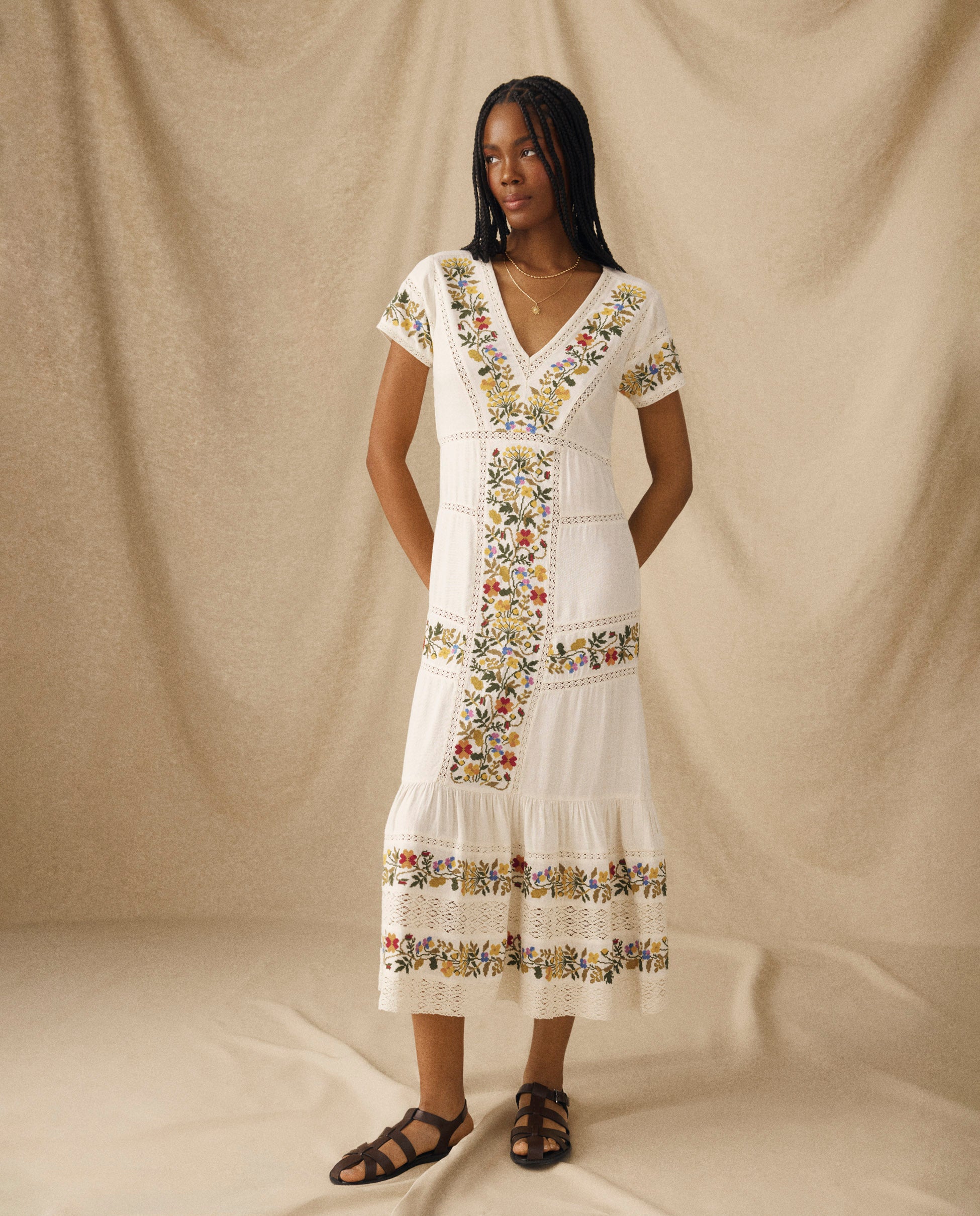 A celebration of artisanal craft, the Rashana Tunic captures a sense of timeless elegance with its intricate floral embroidery and open lacework. Cut from a breathable, lightweight fabric, it features a V-neckline and short sleeves, with a tiered silhouette that adds soft movement. The tunic is framed with ladder lace inserts, creating a beautifully textured contrast against the vibrant, multicolored floral detailing.