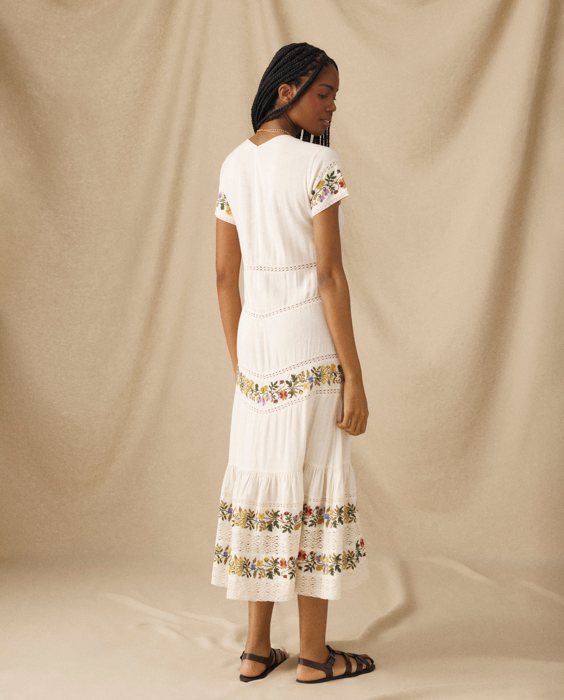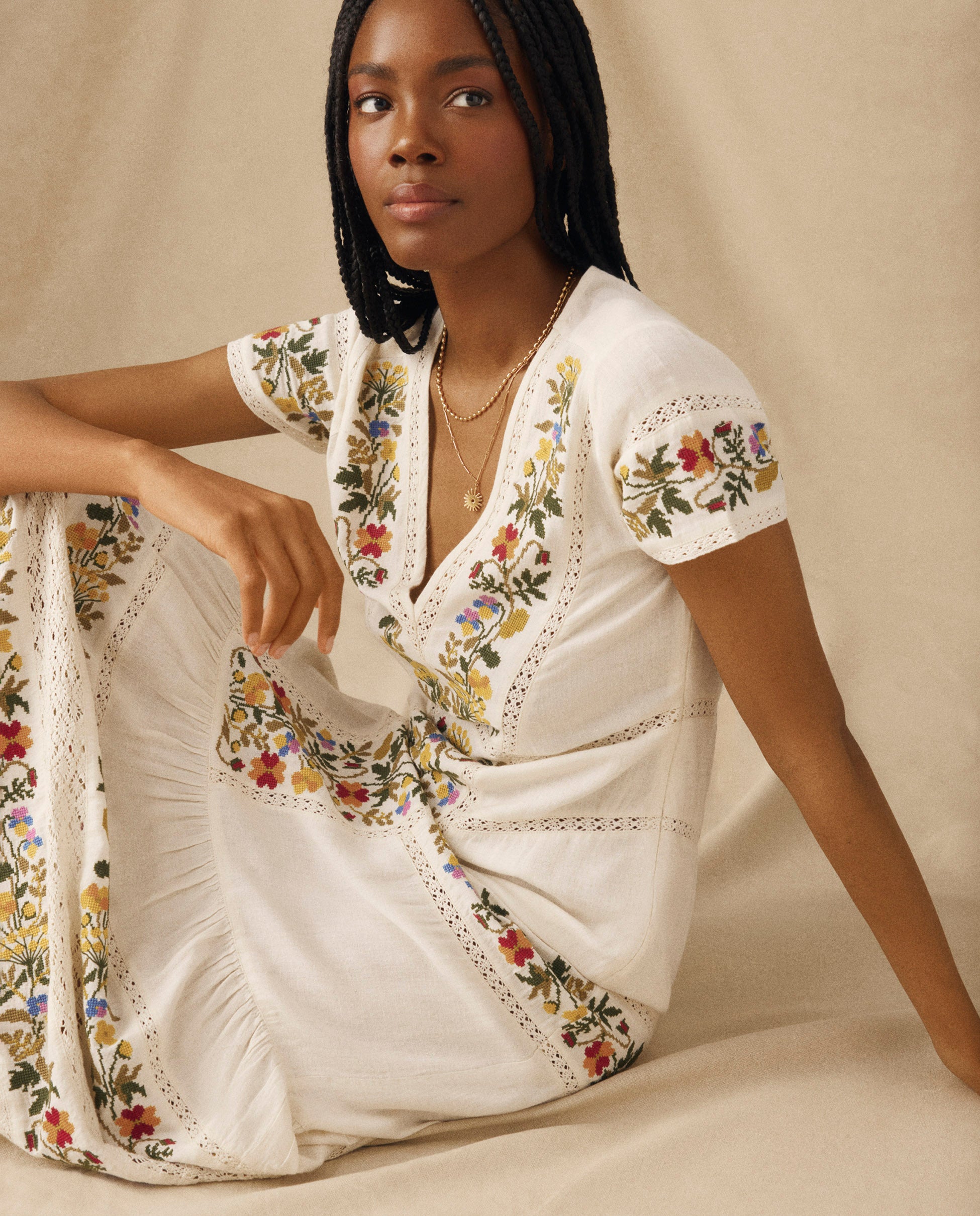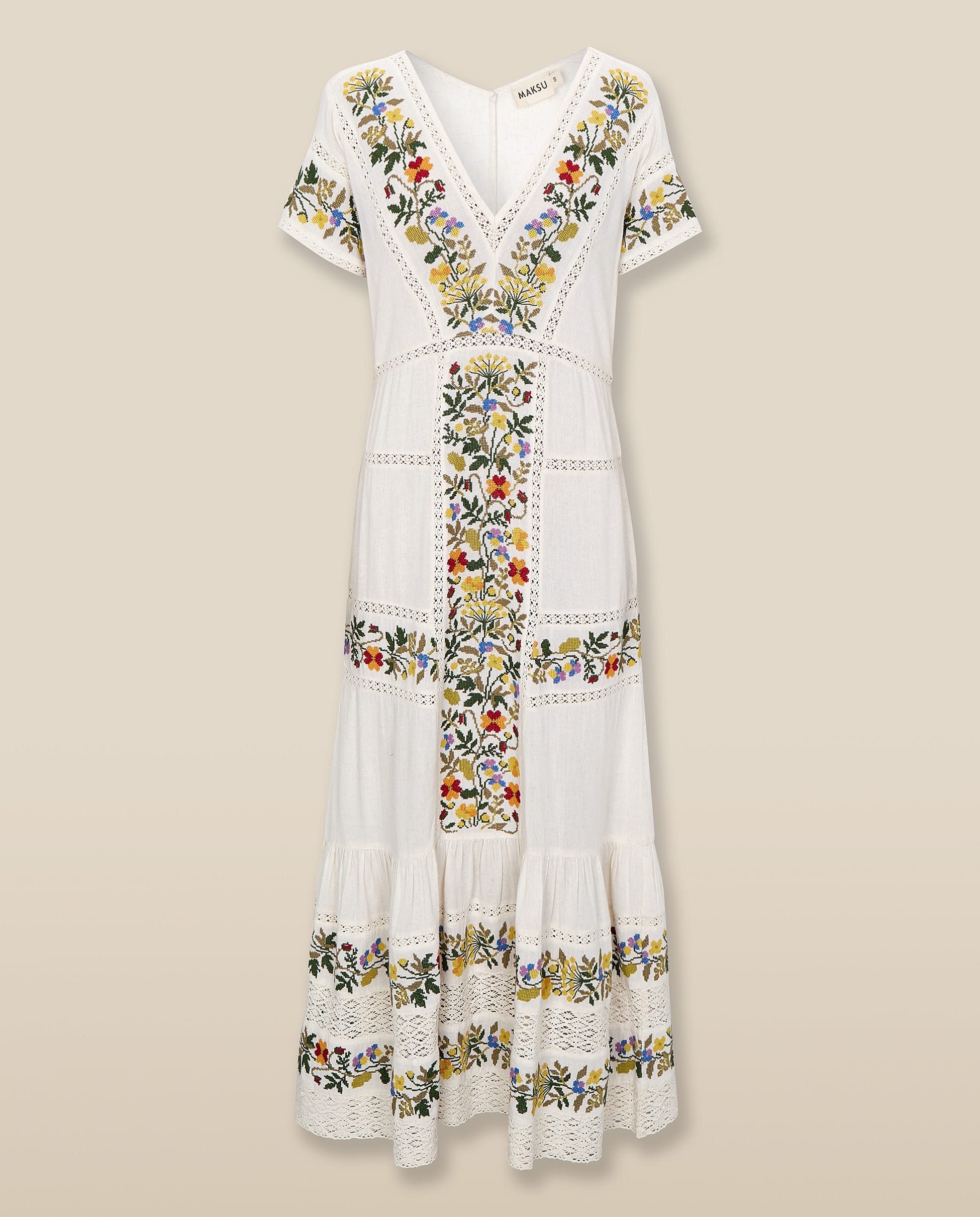 A celebration of artisanal craft, the Rashana Tunic captures a sense of timeless elegance with its intricate floral embroidery and open lacework. Cut from a breathable, lightweight fabric, it features a V-neckline and short sleeves, with a tiered silhouette that adds soft movement. The tunic is framed with ladder lace inserts, creating a beautifully textured contrast against the vibrant, multicolored floral detailing.