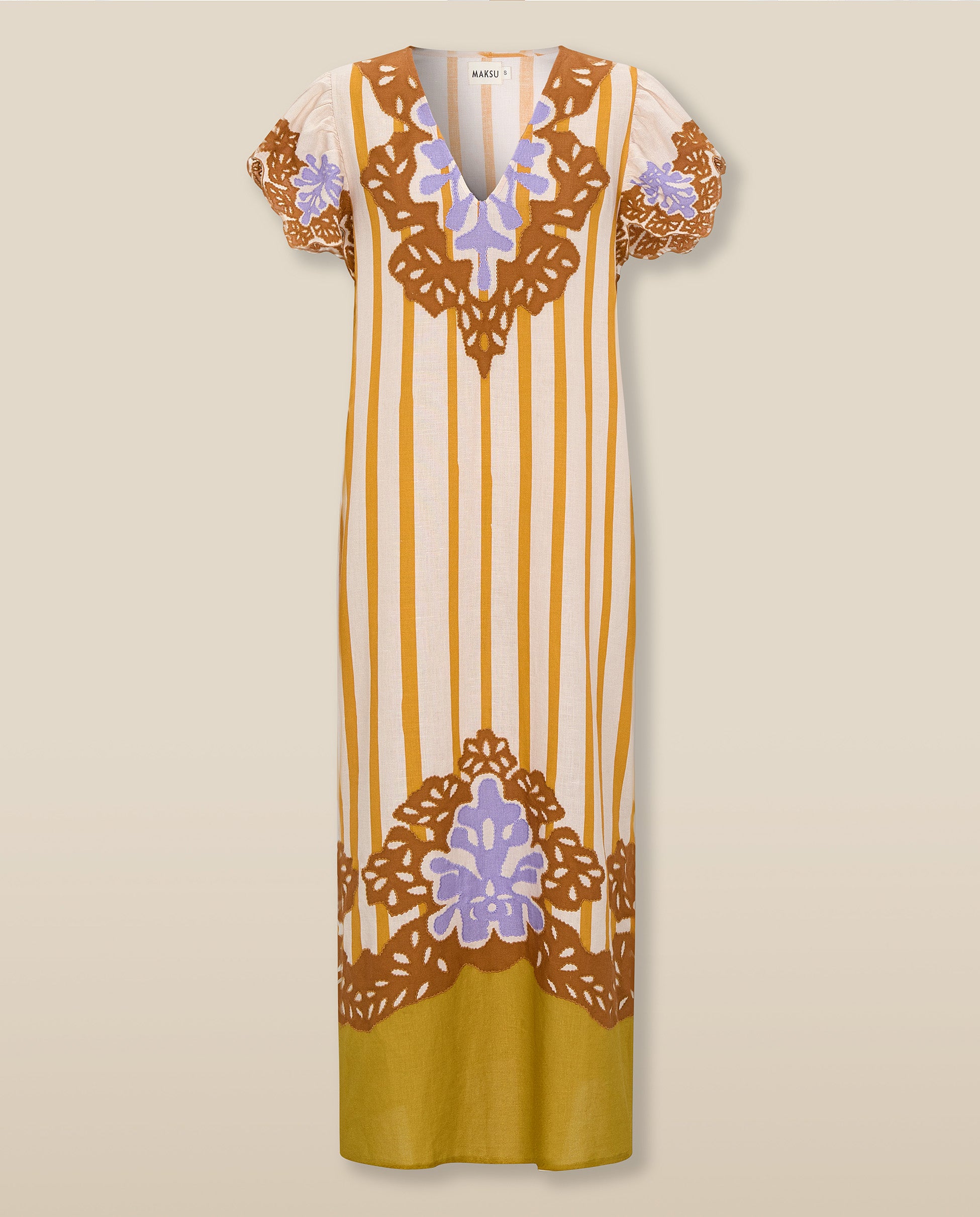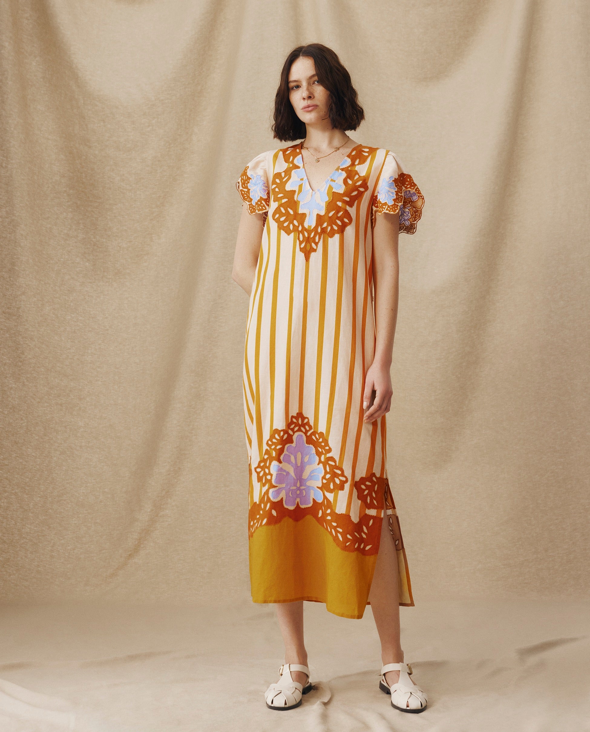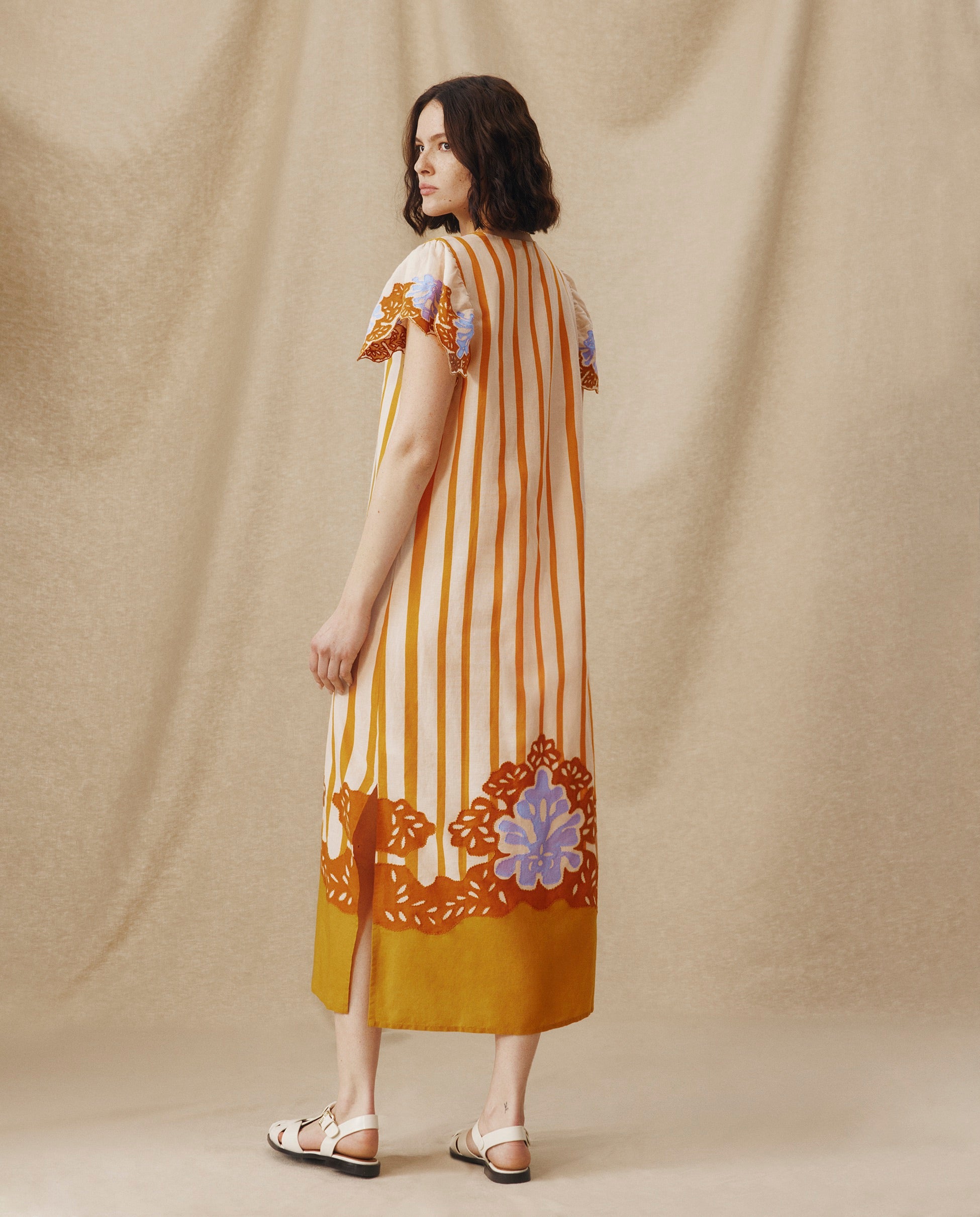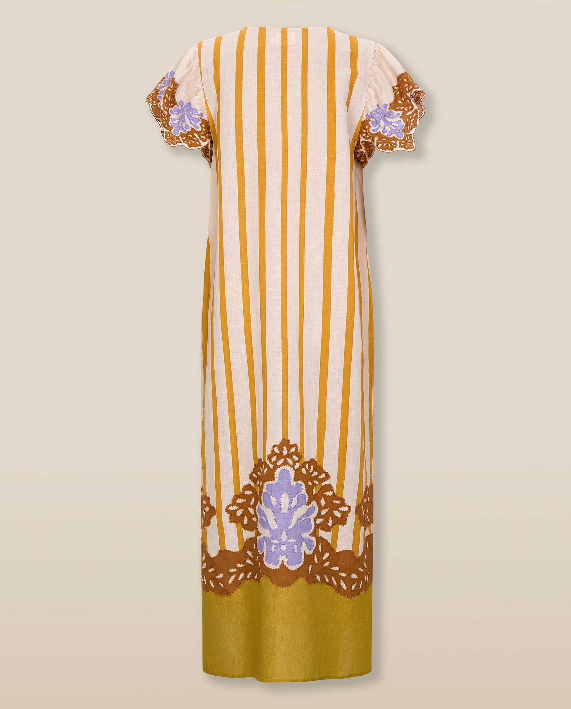 Crafted in a breathable cotton-linen blend, the Sandhika Tunic brings artisanal detail to everyday ease. Featuring intricate floral embroidery on a bold striped base, it’s finished with airy fluted sleeves and a relaxed midi silhouette—ideal for warm-weather dressing.