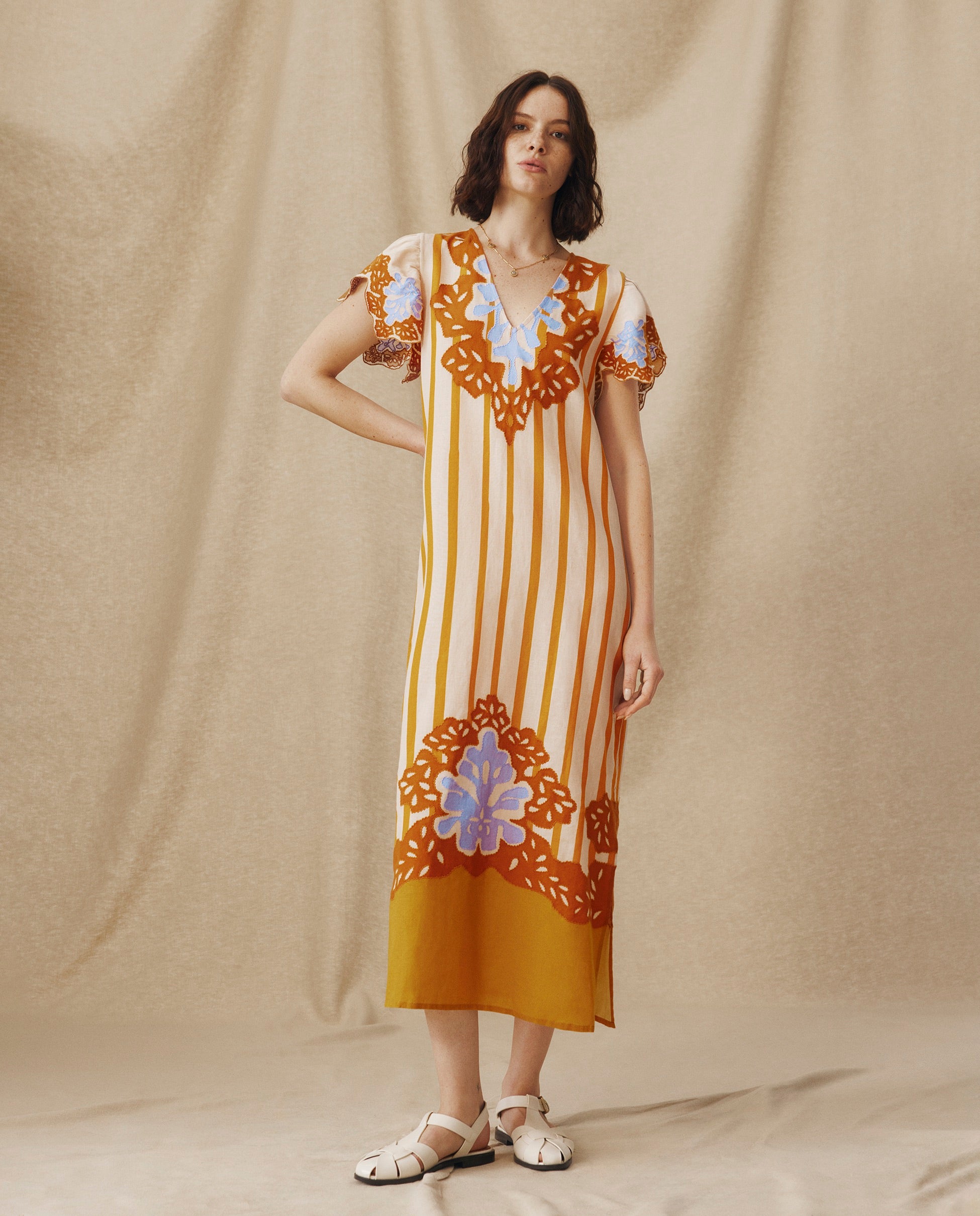 • Striped midi tunic with tonal floral embroidery and appliqué