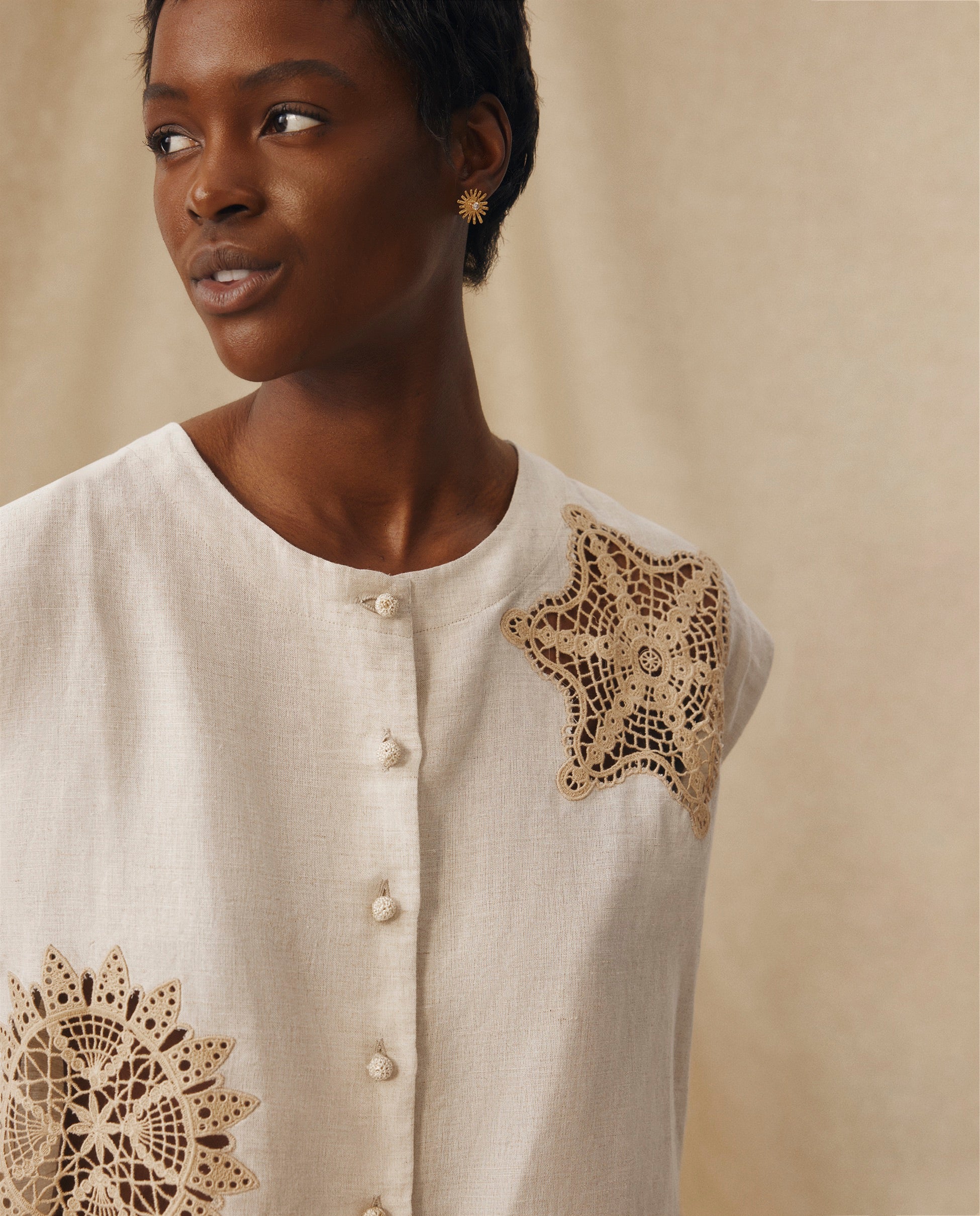 Crafted from a soft linen-cotton blend, the Soma Blouse features intricately embroidered patch motifs and crochet buttons, with adjustable side ties for a personalised fit. Style with the matching trousers for a coordinated look.