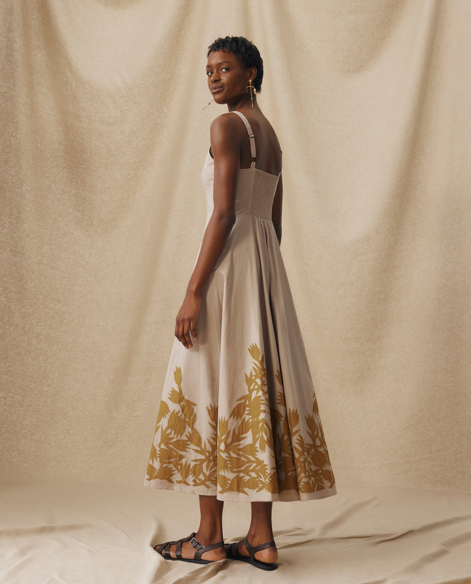 Understated yet striking, the Yukta Dress is crafted in a soft stone grey tone with a sweeping embroidered hem in antique gold. The deep V-neckline and adjustable straps create a feminine, sculpted fit, while the smocked back panel ensures comfort and flexibility. Designed in a breathable cotton blend, the full, midi-length skirt flows with ease and features discreet side pockets for effortless wear.