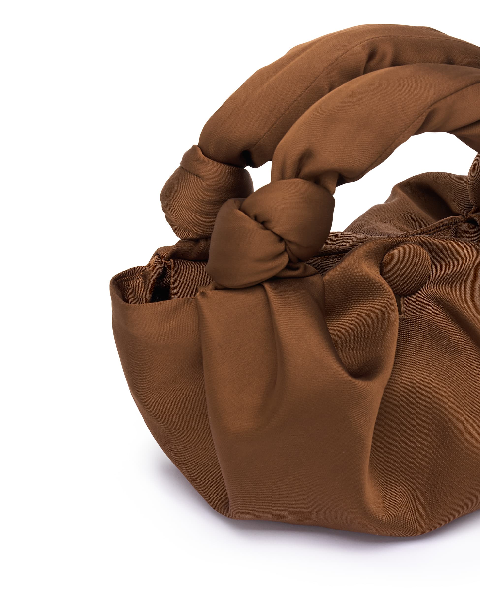 Crafted in smooth satin with a subtle sheen, the Gyosa bag is defined by its sculptural shape and softly padded knotted handles. The unstructured form sits naturally in the hand, while a covered button closure keeps essentials secure. Designed in rich paprika orange for standout appeal.