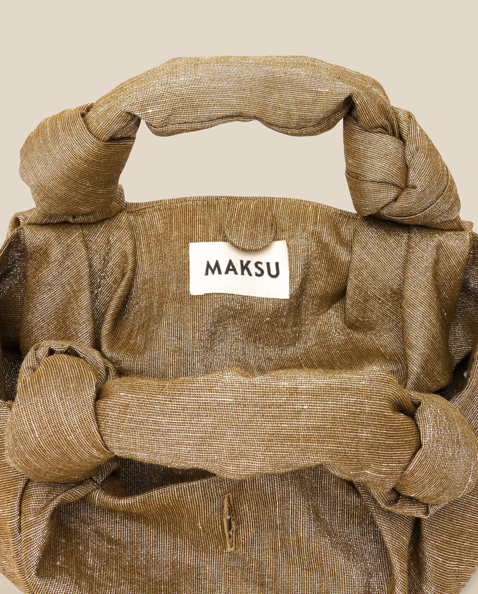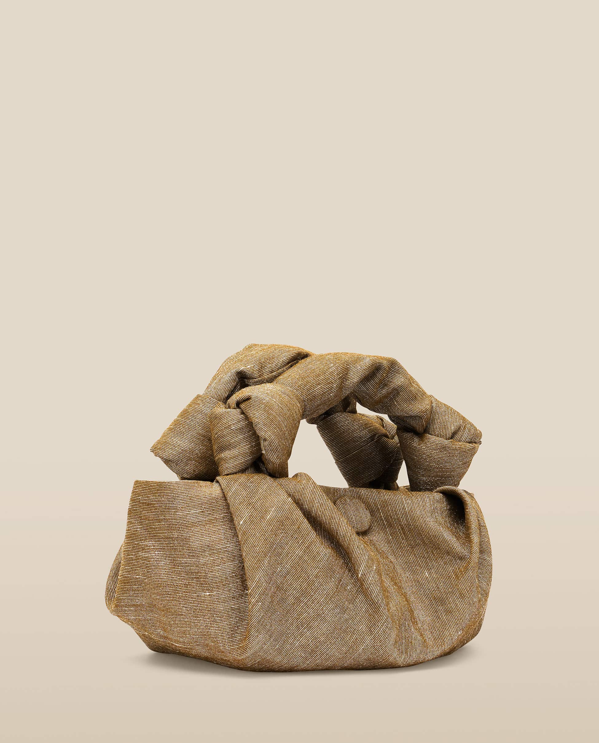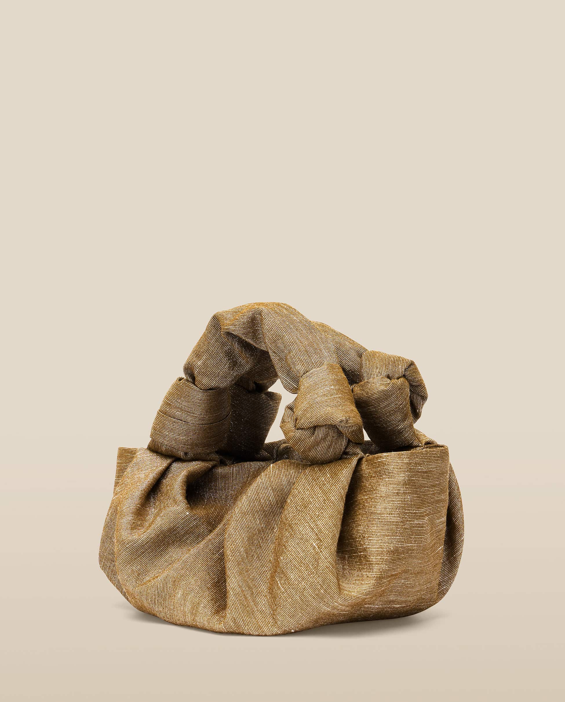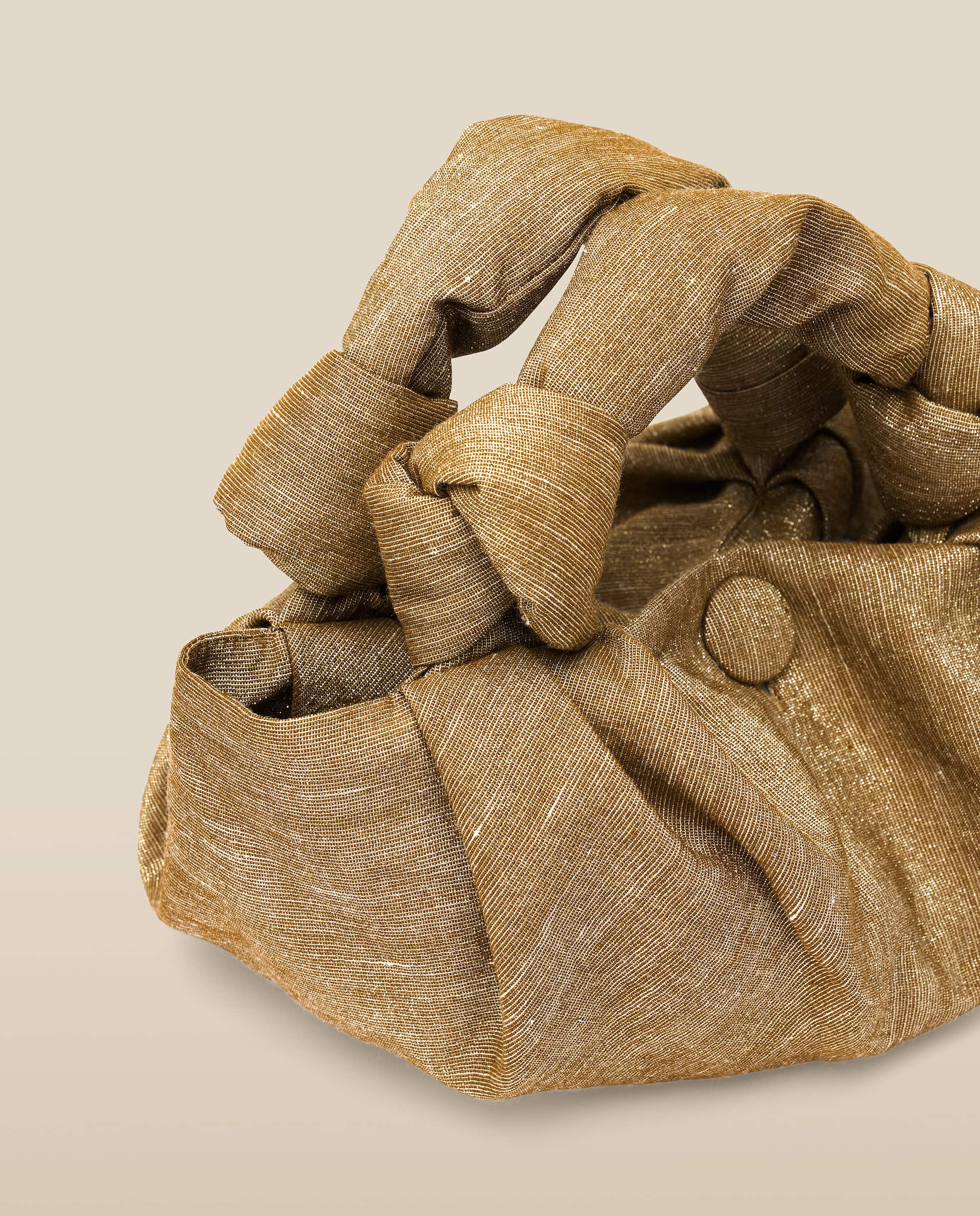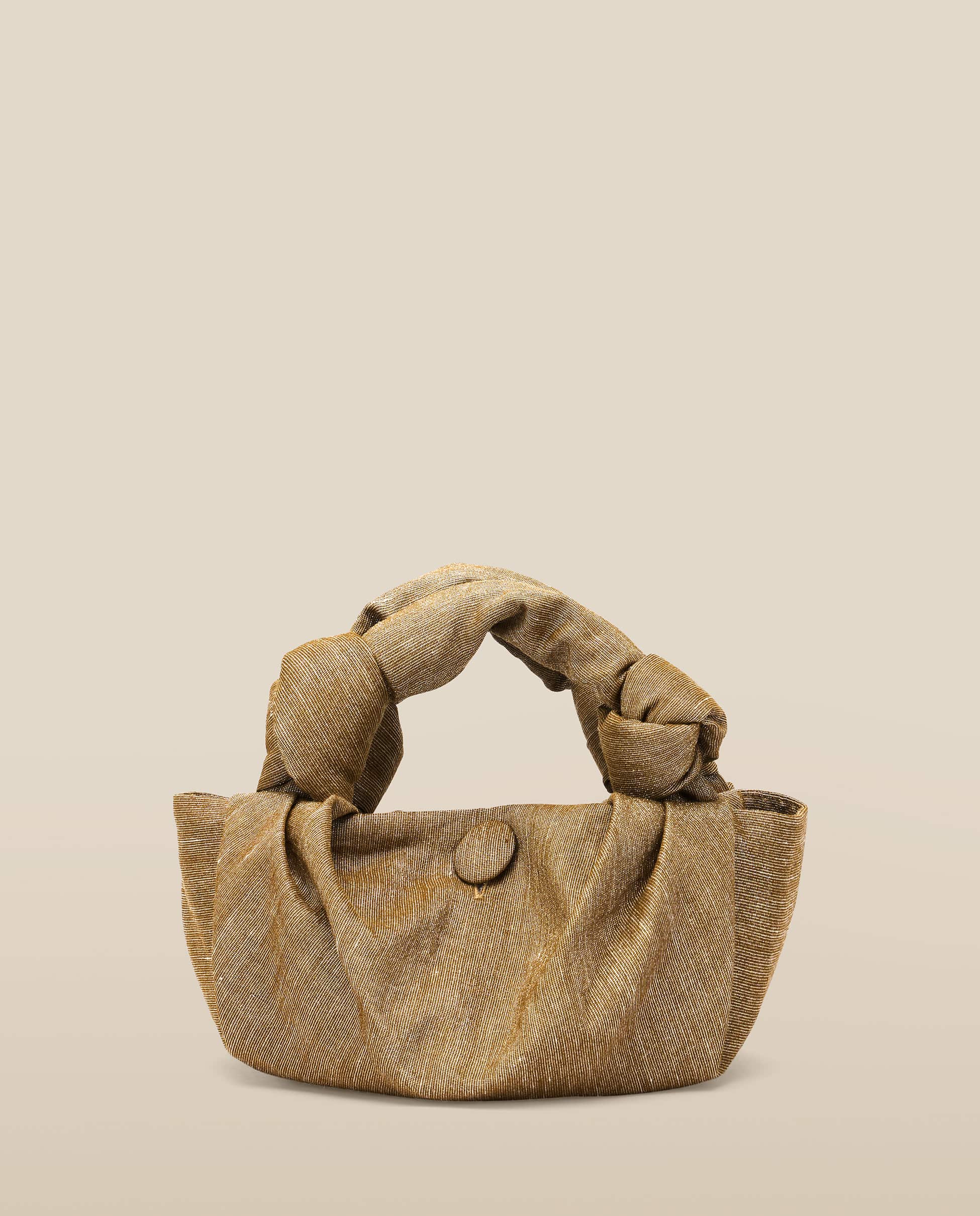 The Gyosa bag in Gold Olive is crafted from a textured lurex blend, shimmering with golden threads for a softly metallic finish. Its distinctive silhouette is enhanced by sculptural knotted handles and a rounded base. A covered button secures the opening.