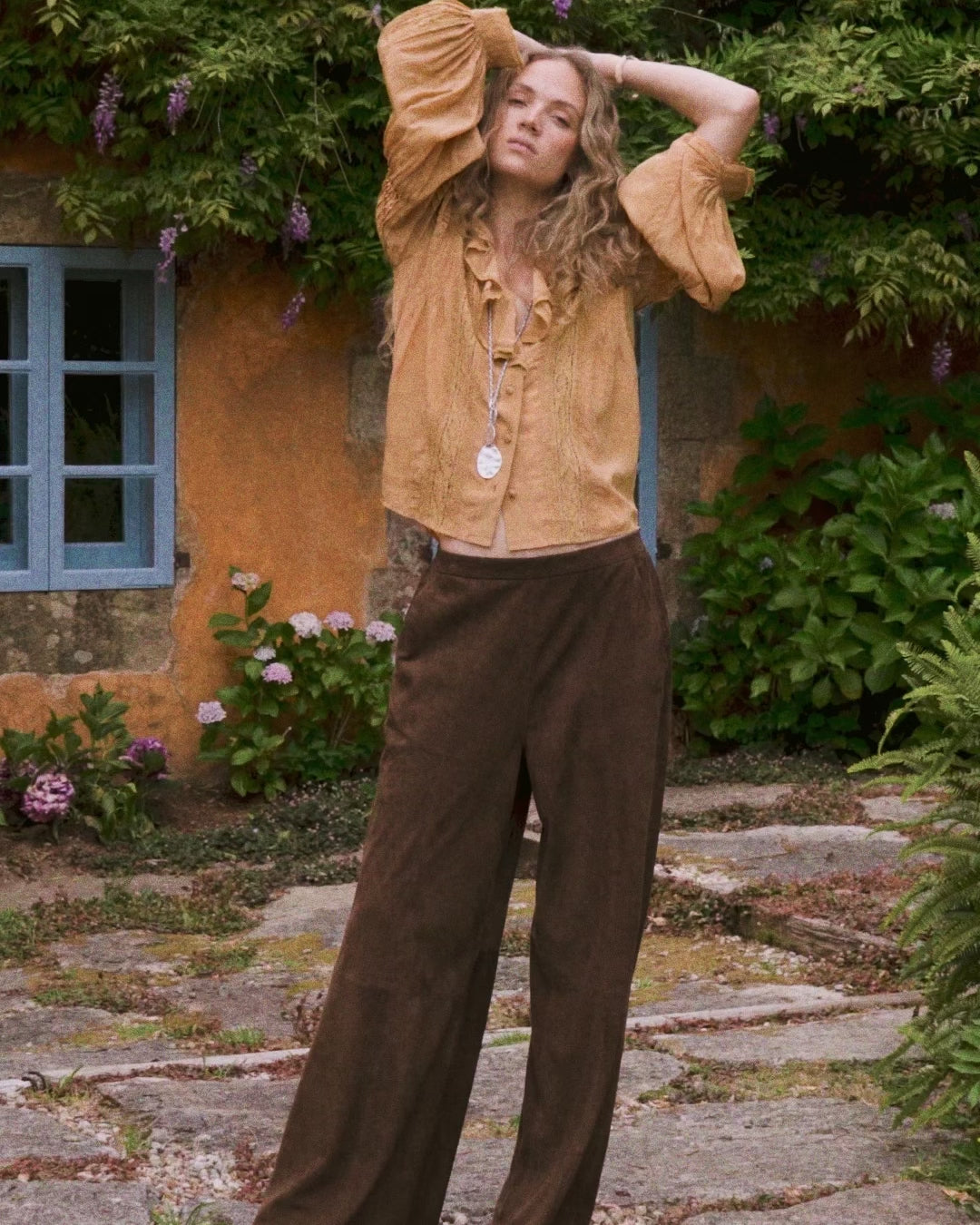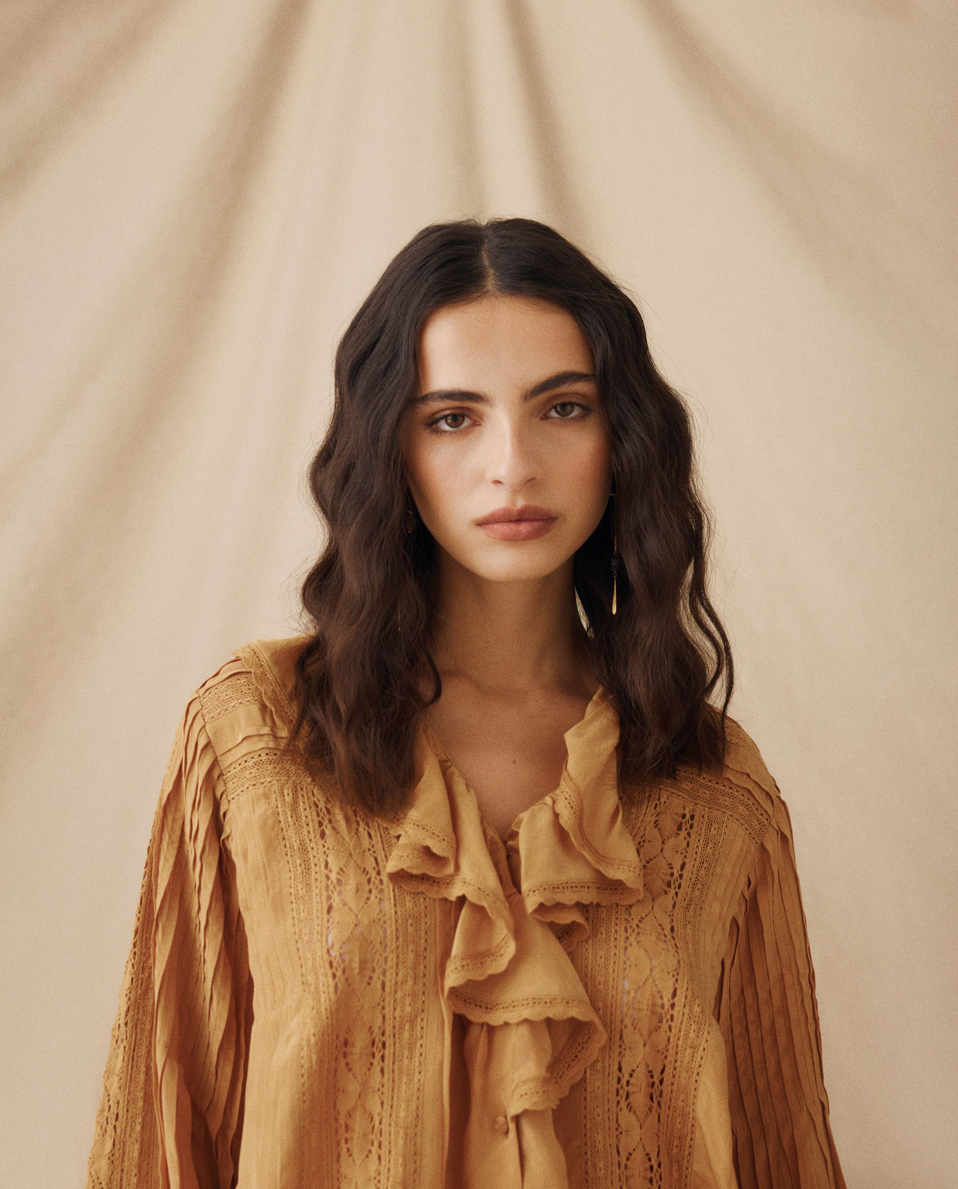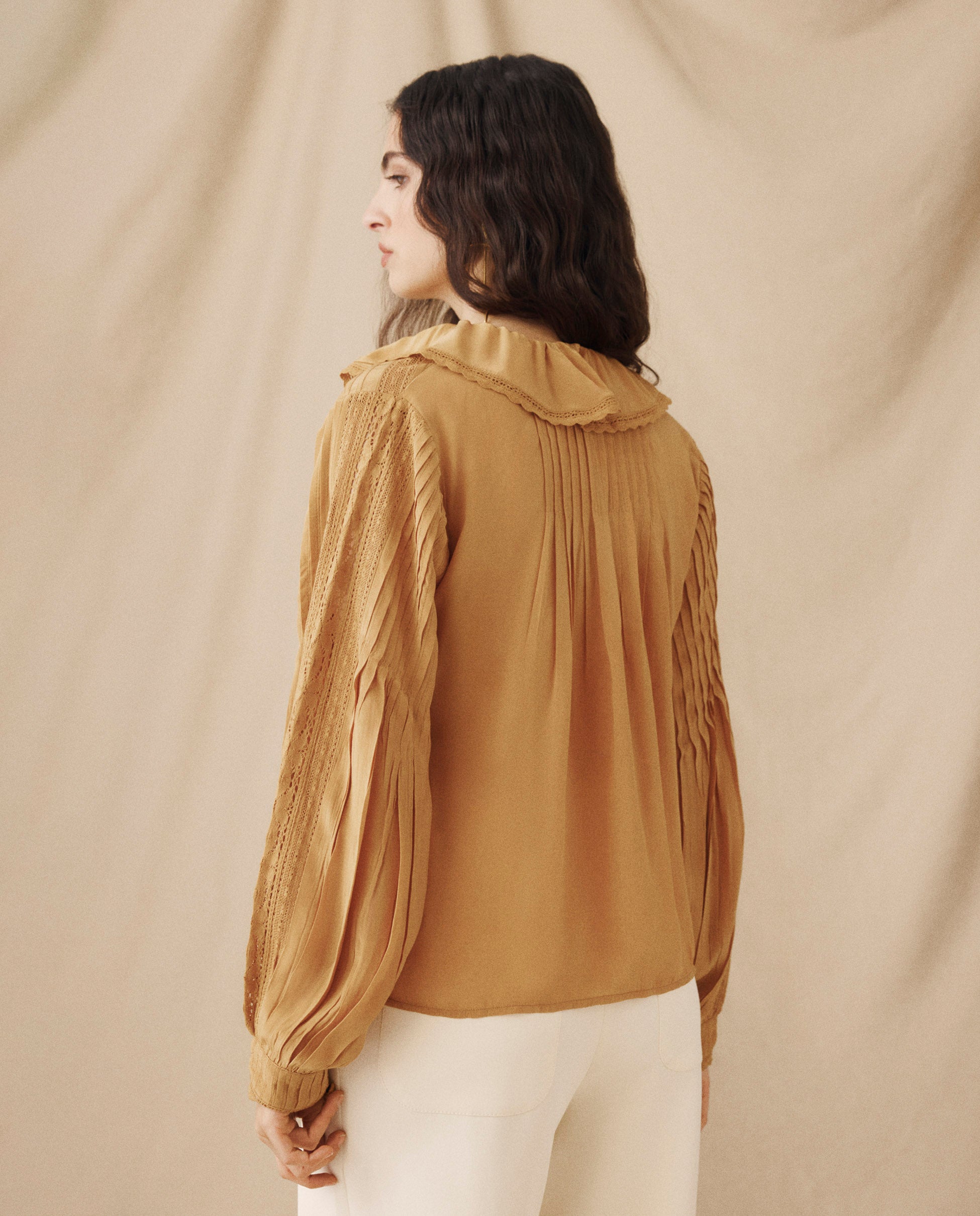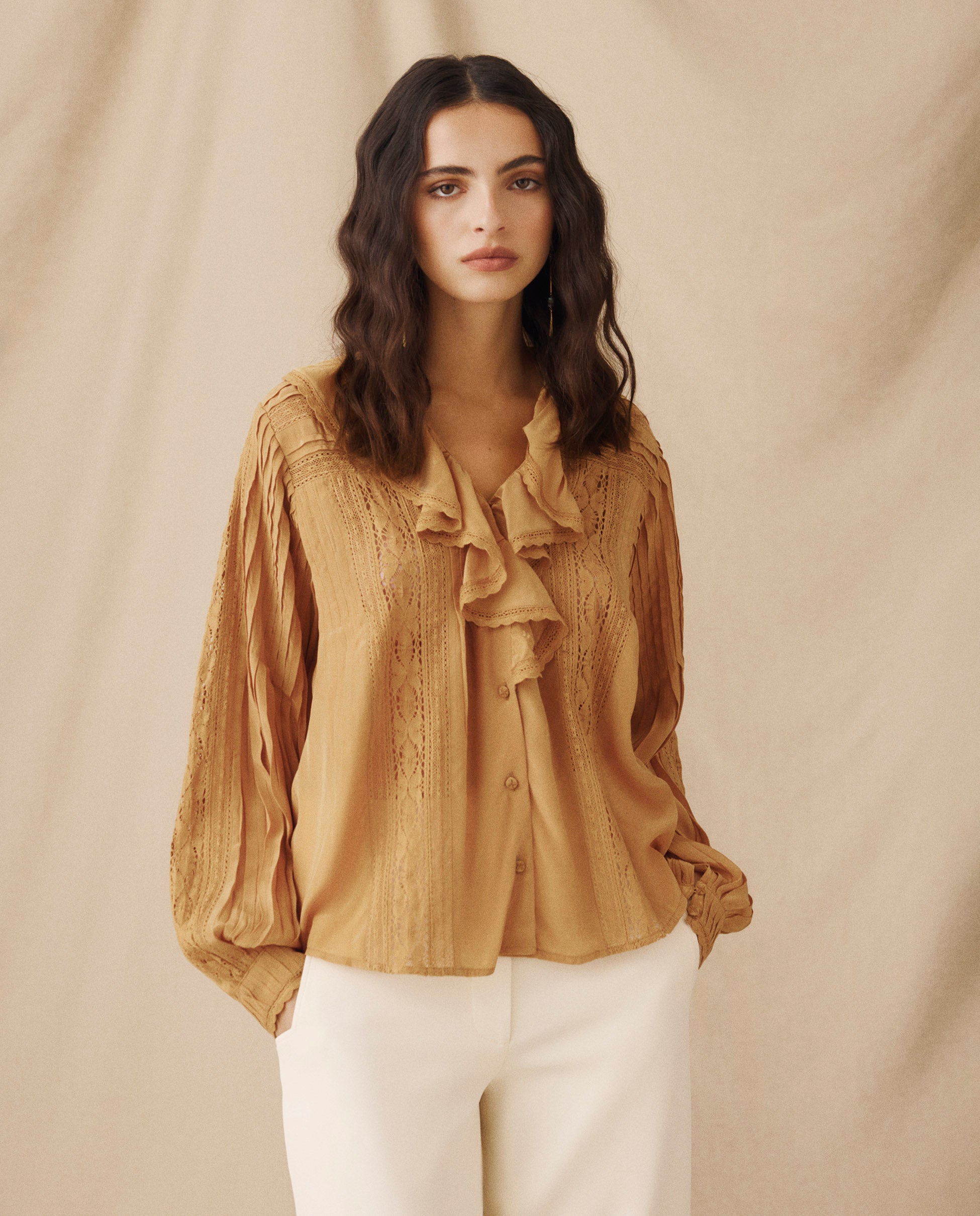 The Basil blouse blends delicate texture with soft volume in a romantic, elevated silhouette. Designed in a soft camel tone, it features vertical lace inserts and pleated long sleeves, with a ruffled V-neckline that adds feminine movement. A softly pleated back keeps the silhouette balanced from every angle.