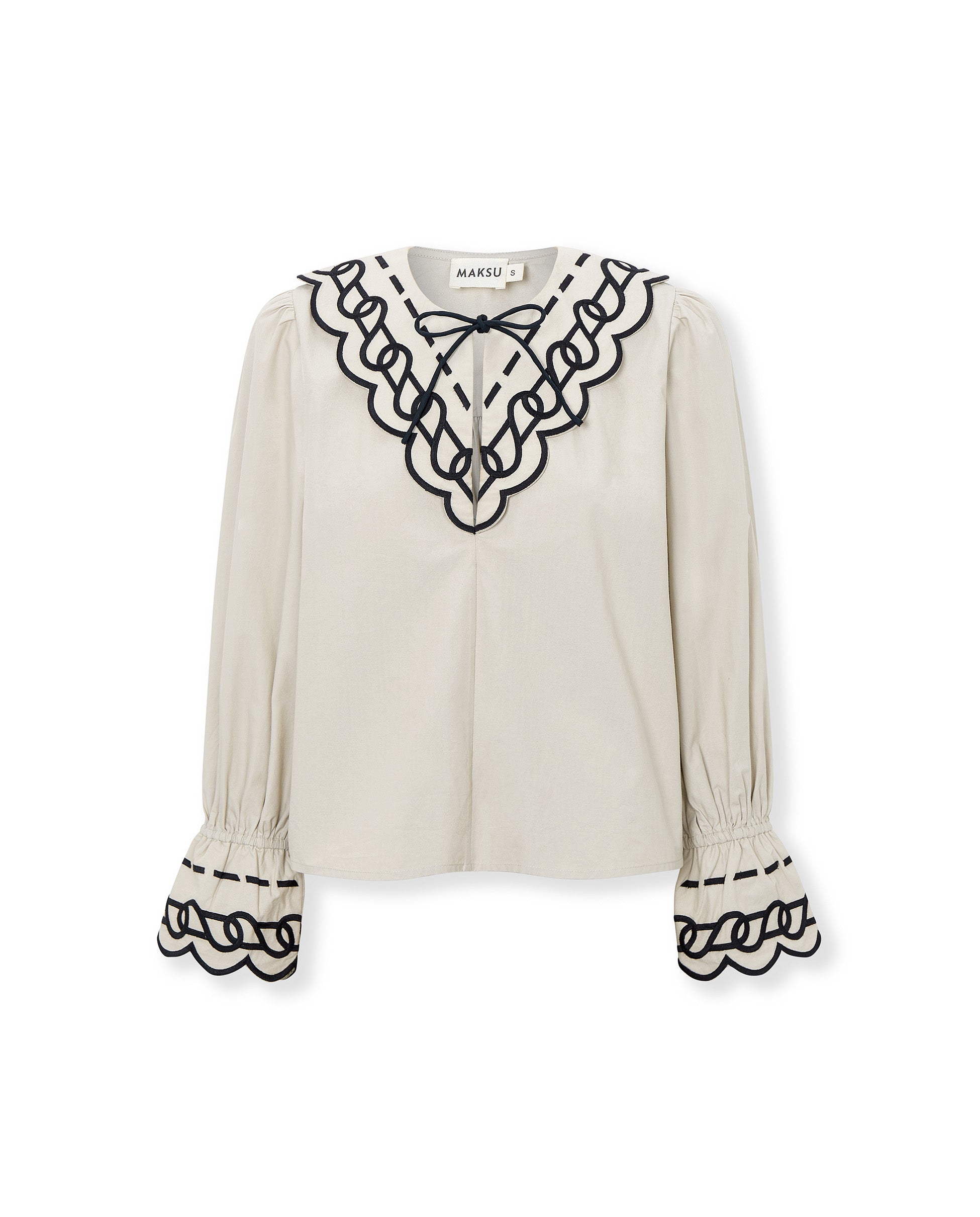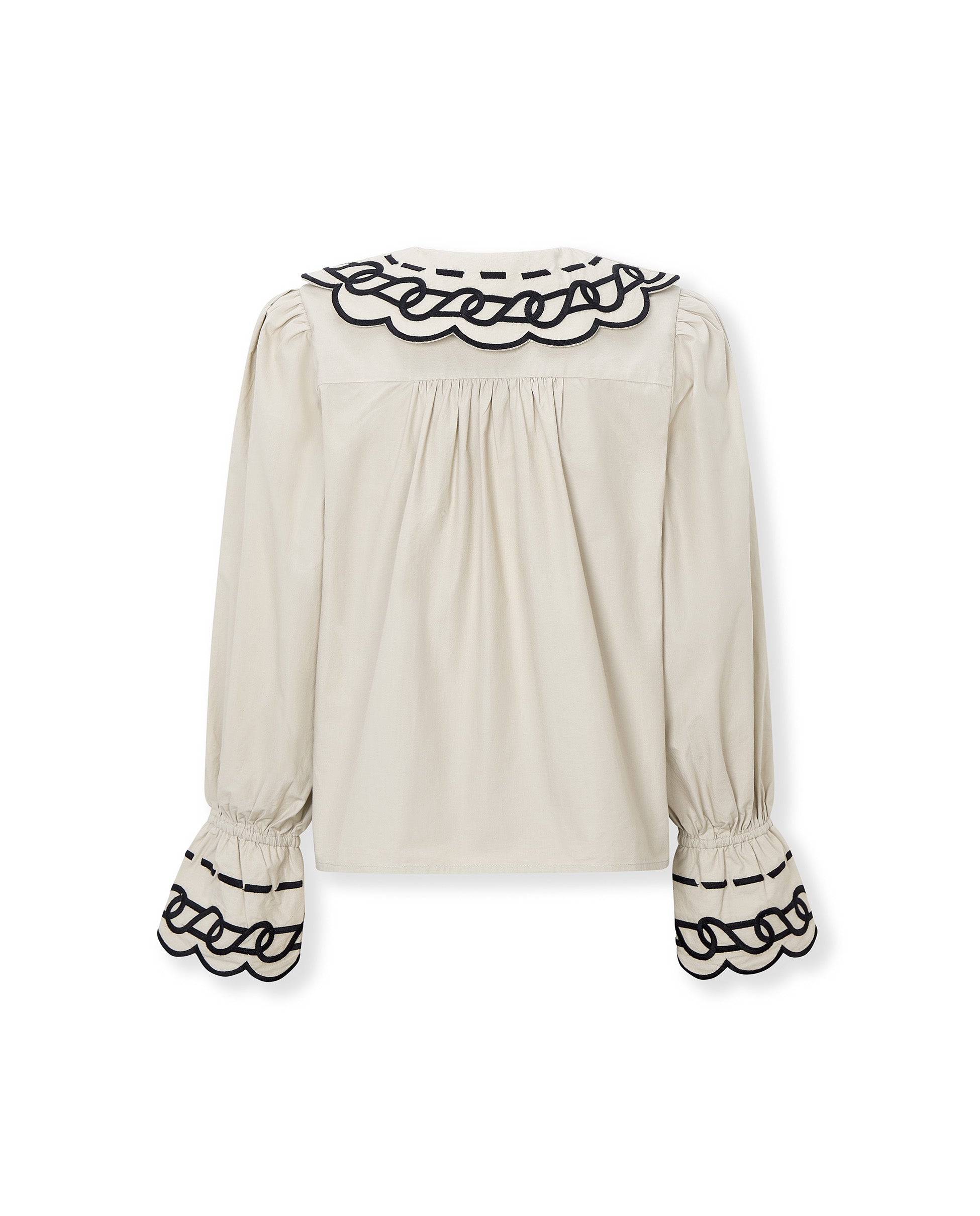 A modern take on romantic detailing, the Brunella blouse is crafted from 100% cotton with softly gathered volume and bold contrast embroidery. The scalloped collar features a delicate front keyhole with a tie detail, while the embroidered cuffs add a final statement finish.