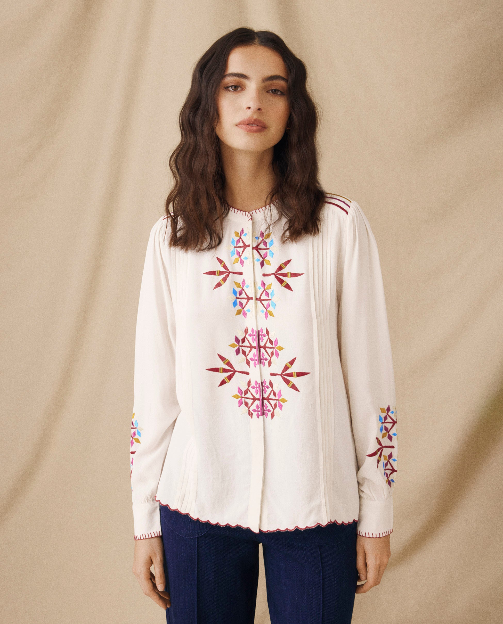 Intricately embroidered with vibrant geometric motifs, the Lina Blouse brings a refined folk influence to everyday dressing. Designed with a gently gathered yoke and a relaxed shape, it features a clean concealed placket and scalloped trims for a soft, feminine finish.