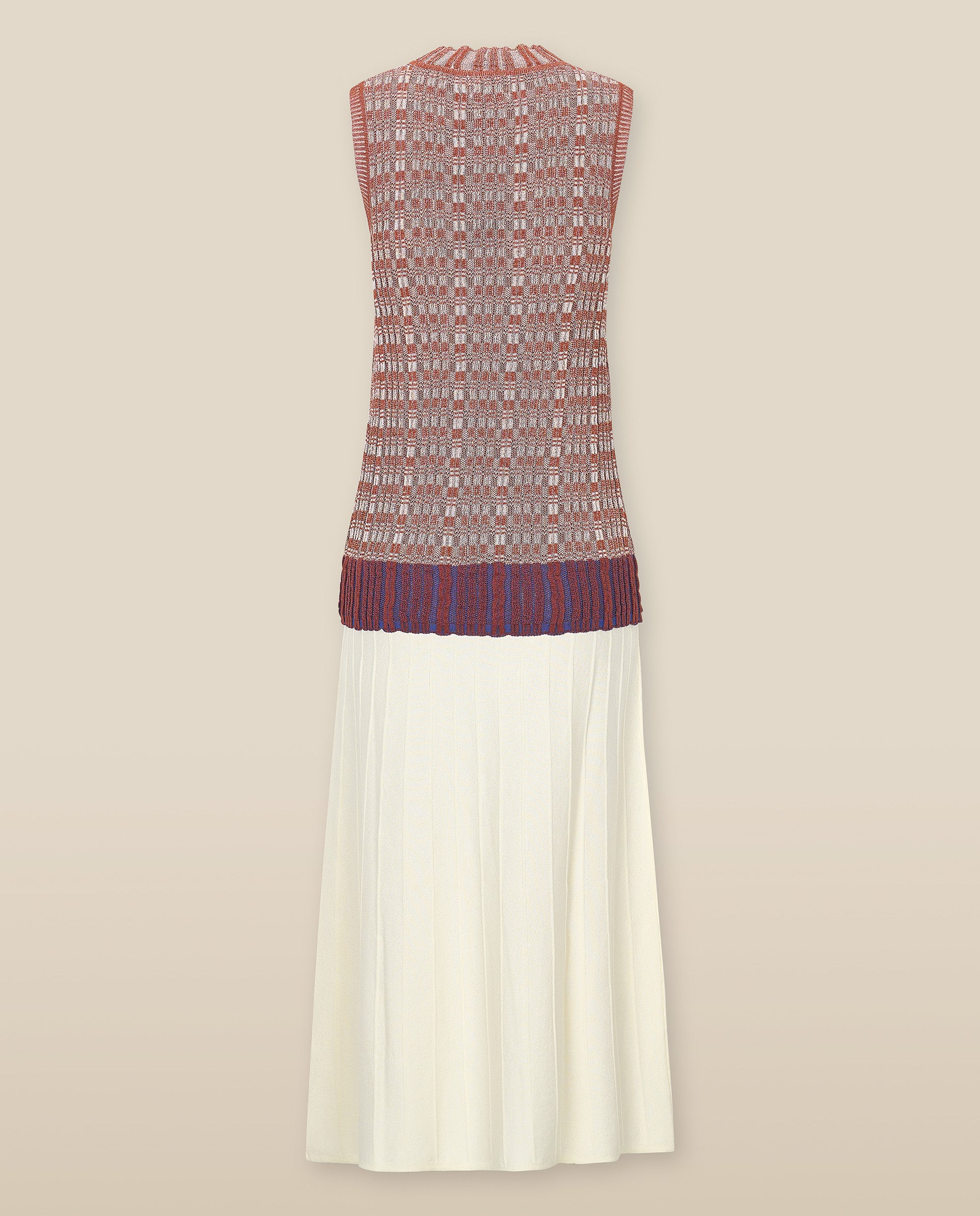 Elevate your wardrobe with this striking Uduku Midi Dress, an artful play of textures and movement. The sleeveless bodice—expertly knit in a vibrant palette of shimmering metallic threads—hugs the torso for a flattering, fitted feel, while the crisp white pleated skirt drapes fluidly over the hips and legs. A delicate scalloped round neckline frames the collarbone, adding a soft, feminine touch. Designed to flatter without compromising on comfort, this versatile piece transitions seamlessly from daytime polish to evening elegance.
