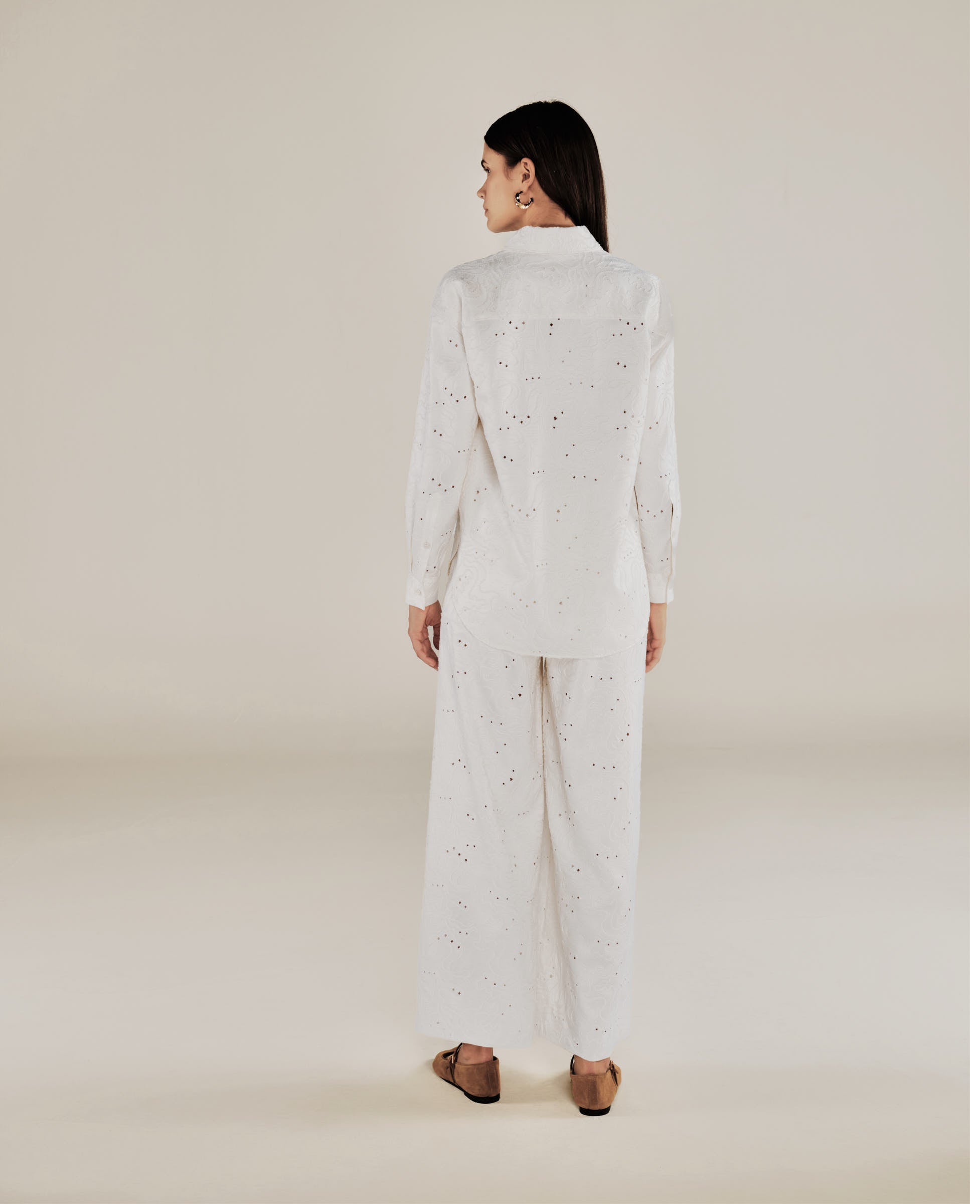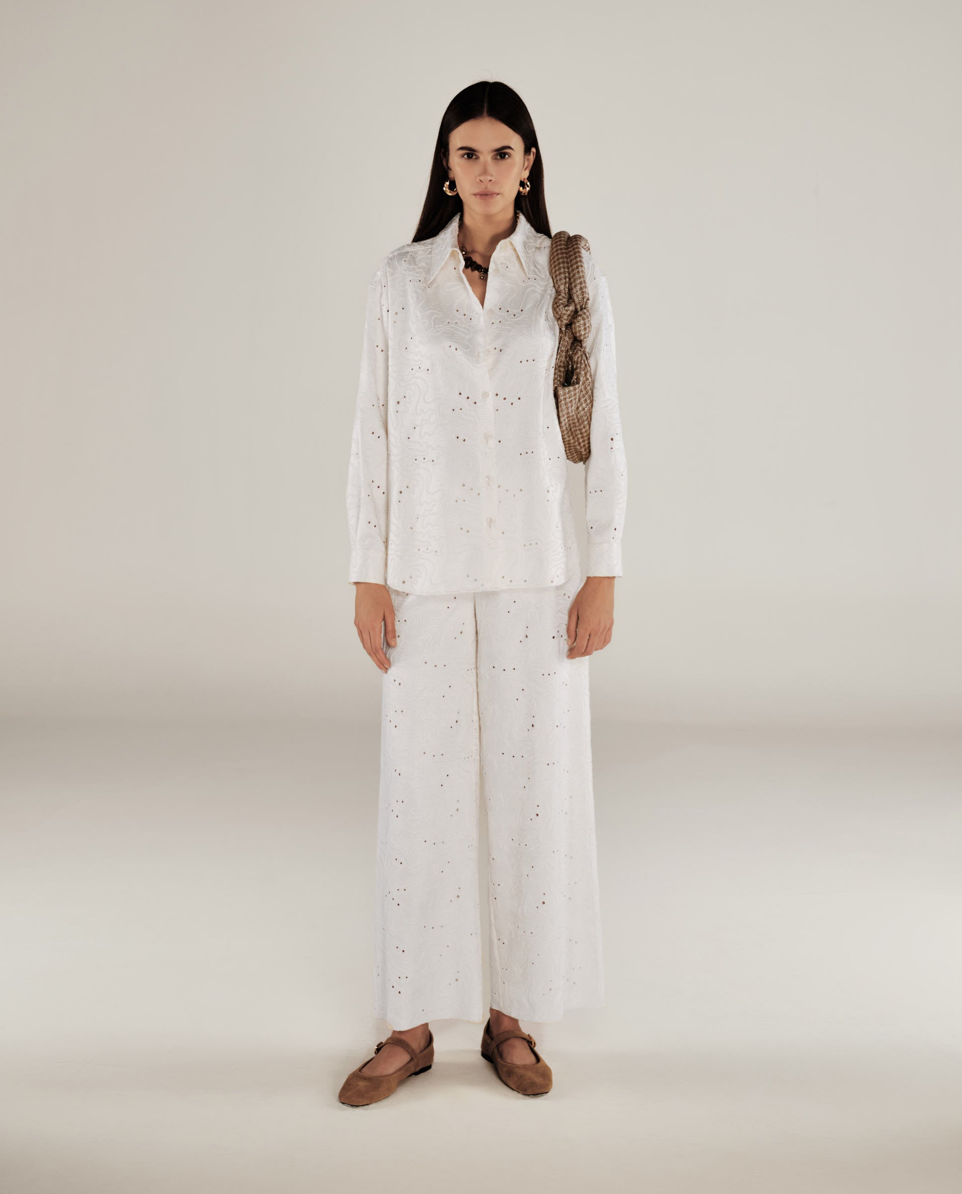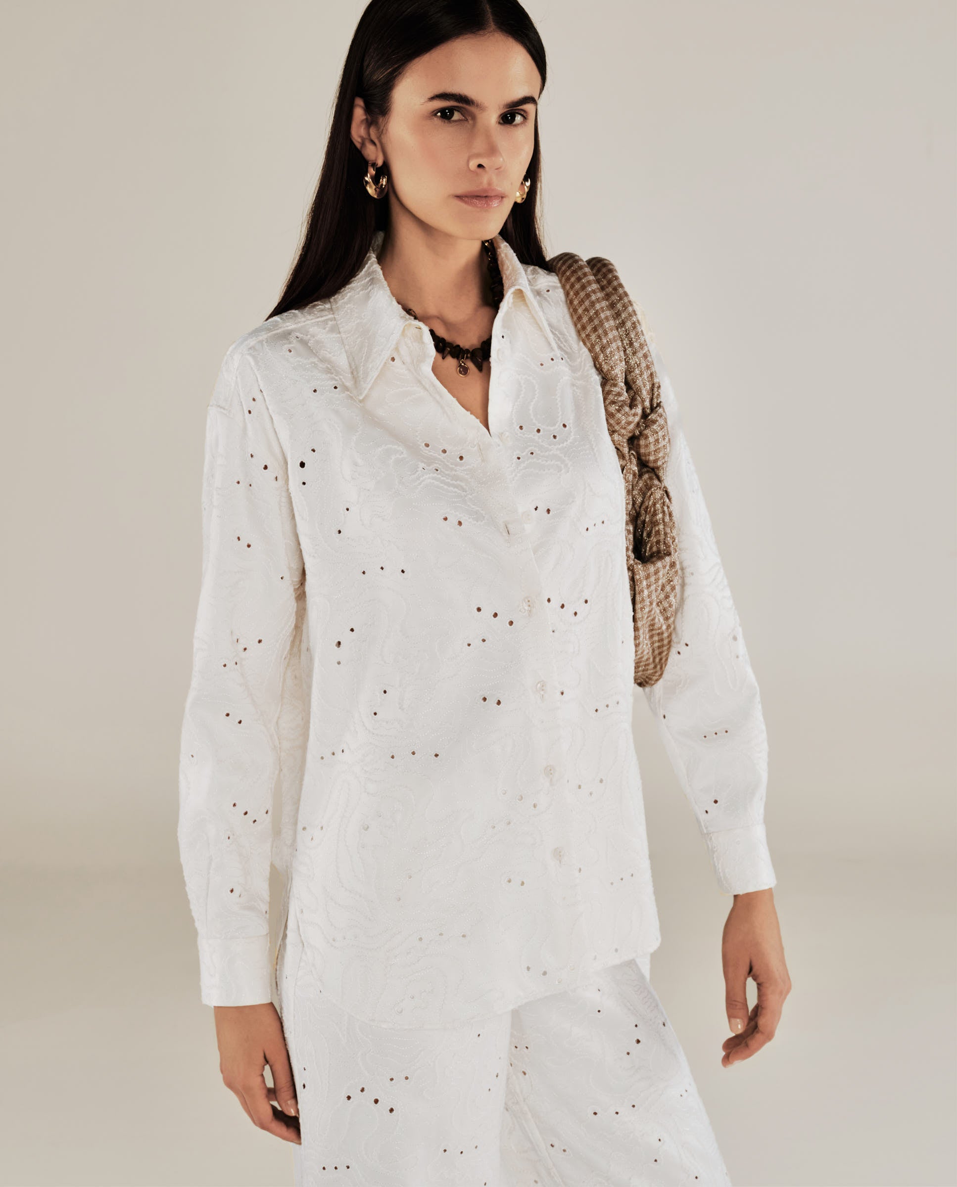 Eleva tu conjunto con la camisa Elodie en color crudo, confeccionada en un tejido ligero y decorada con un bordadoque recorre toda la prenda. Con un corte holgado, cuello clásico y cierre de botones, ofrece una combinación perfecta de elegancia y comodidad. Llévala por dentro con los pantalones a juego para un conjunto sofisticado, o abierta sobre una camiseta de tirantes para un estilo más desenfadado.