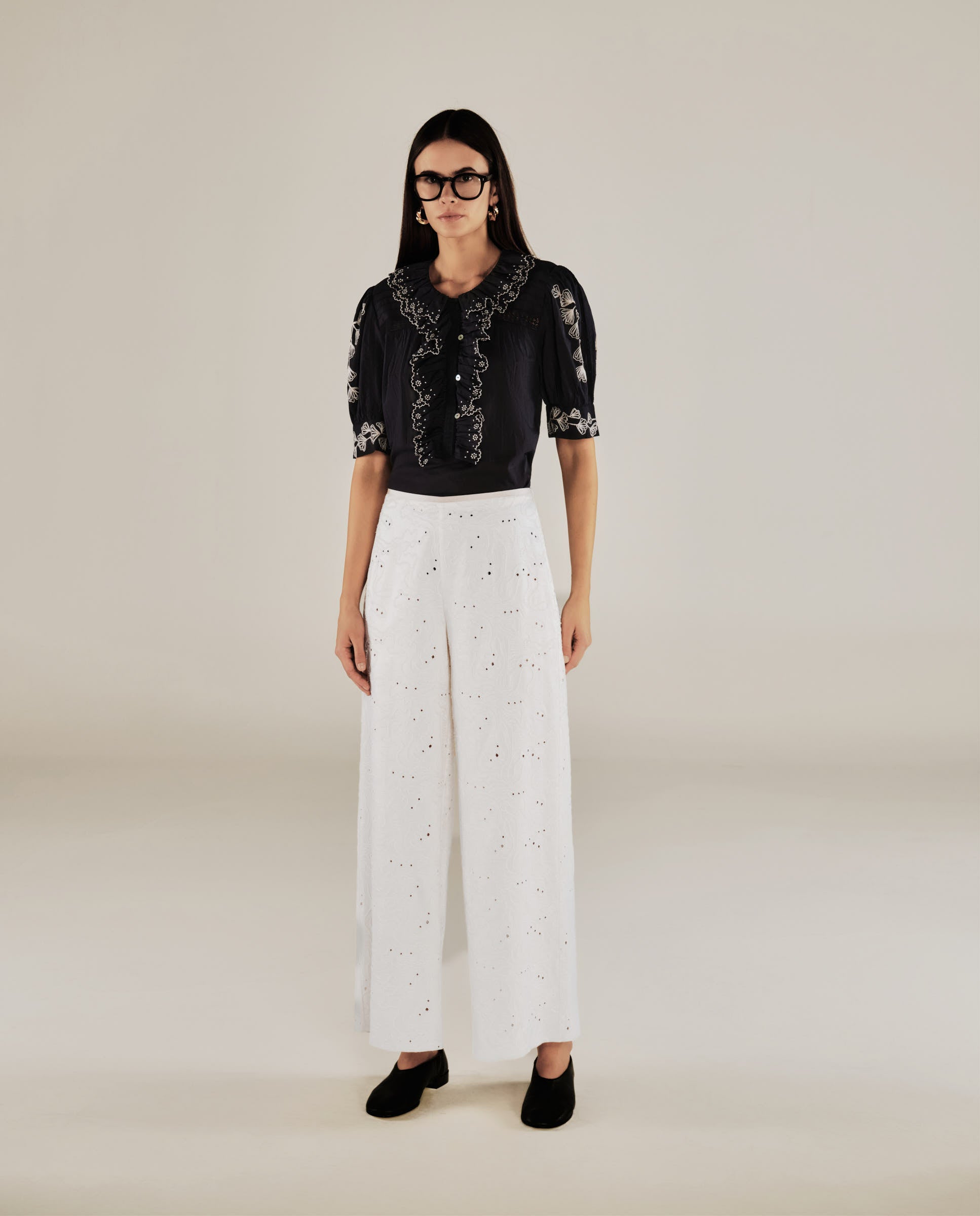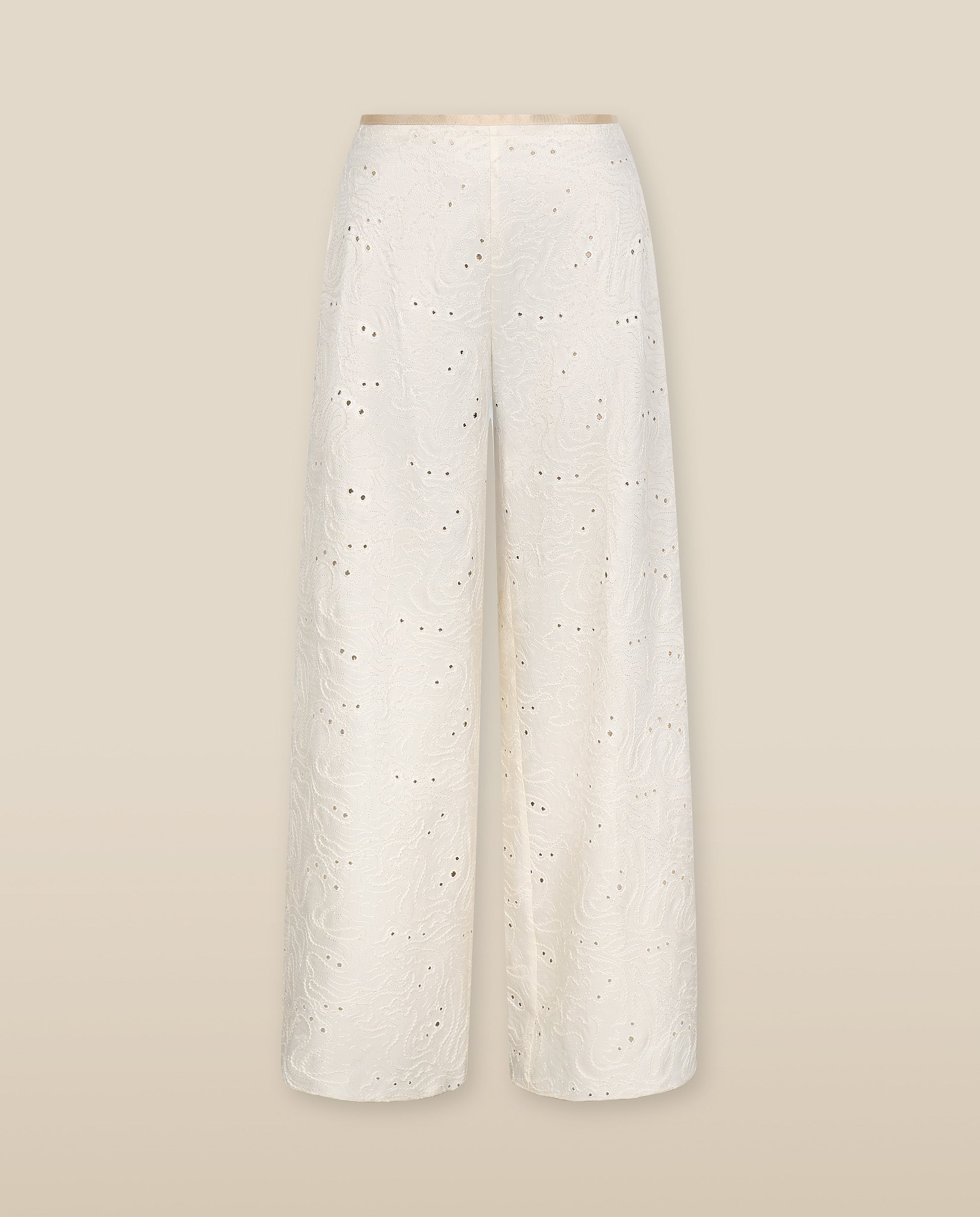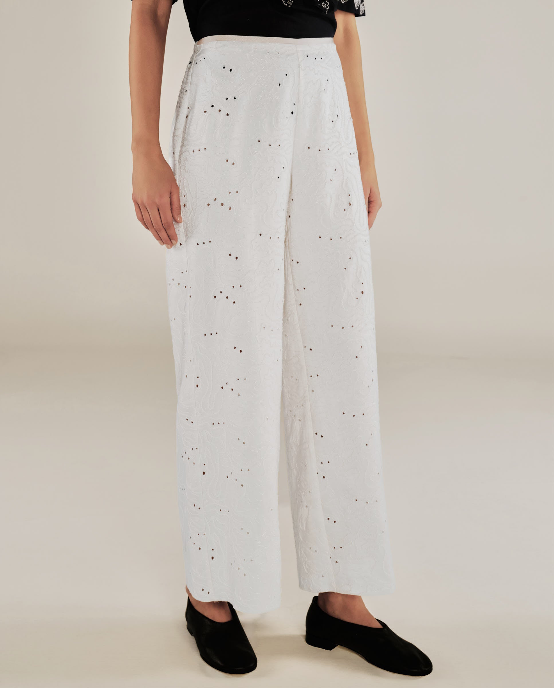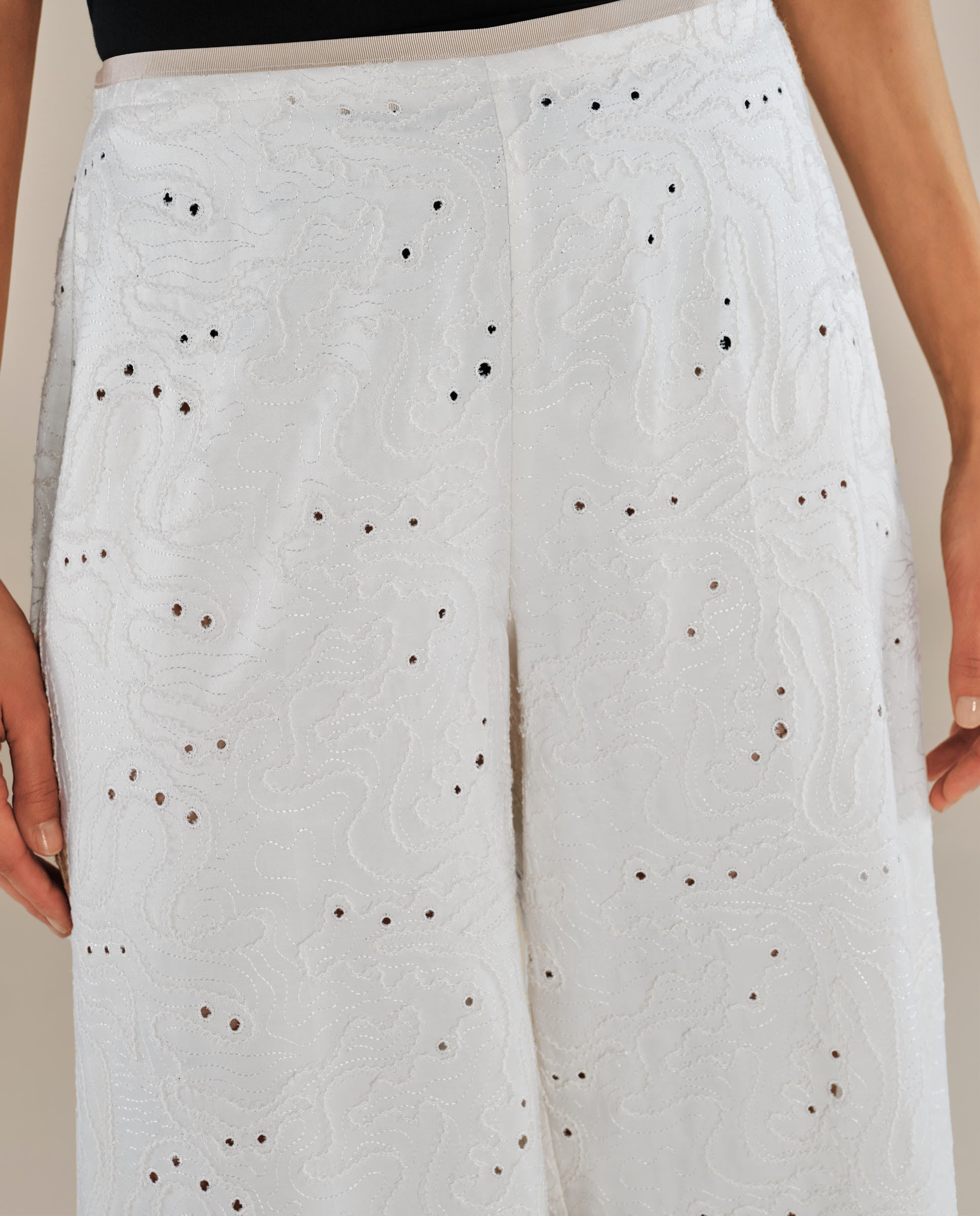 ELODIE | Ecru Embroidered Wide Leg Trousers