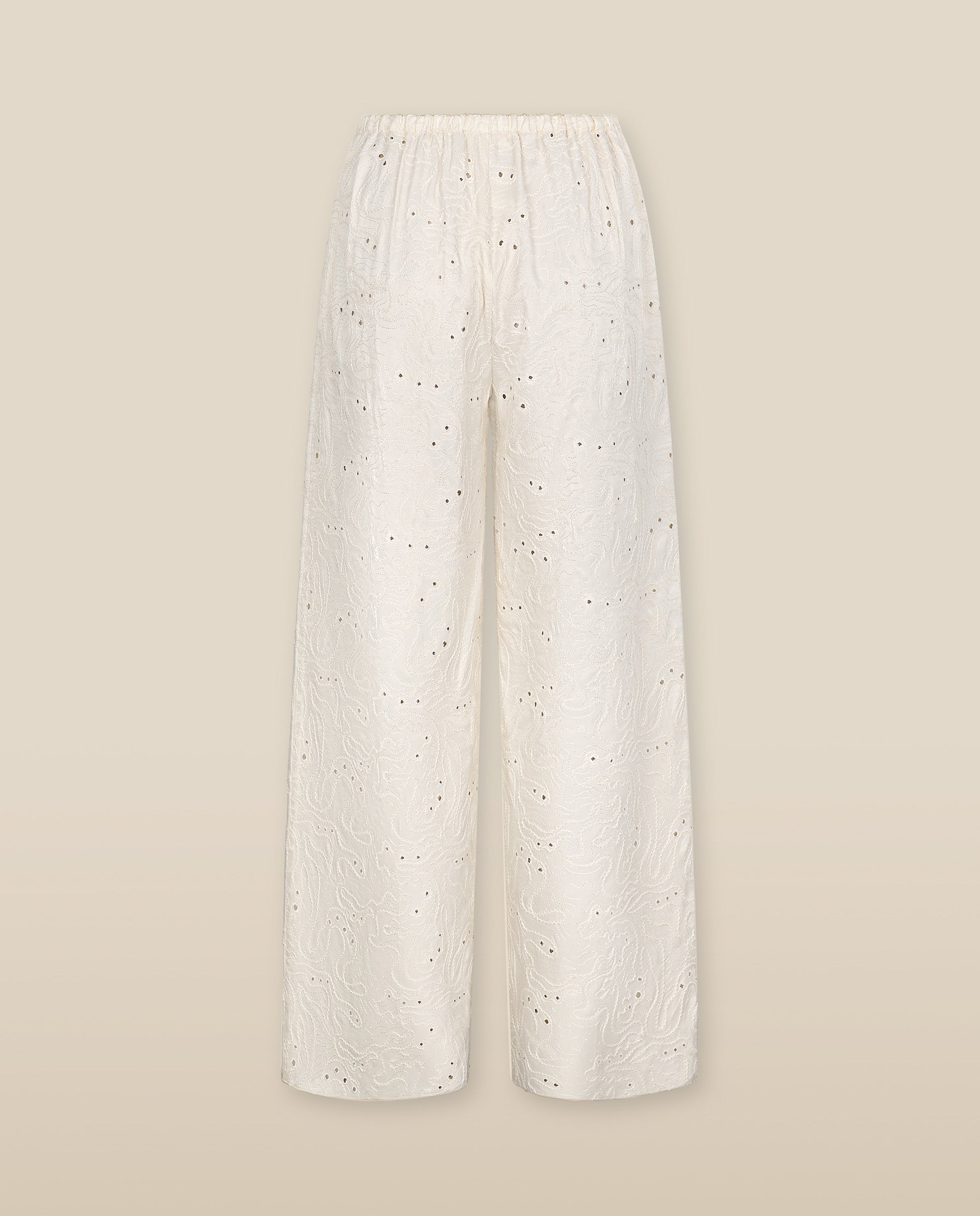Elevate your wardrobe with the Elodie Trousers in ecru, crafted in a lightweight fabric with a graceful drape and adorned with loose, all-over embroidered stitching for an elegant, textured finish. Designed with a high-rise satin front waistband and a flowing wide-leg silhouette, they blend comfort with refined sophistication. Style with a sleek top for daytime polish or dress up with heels for evening appeal.