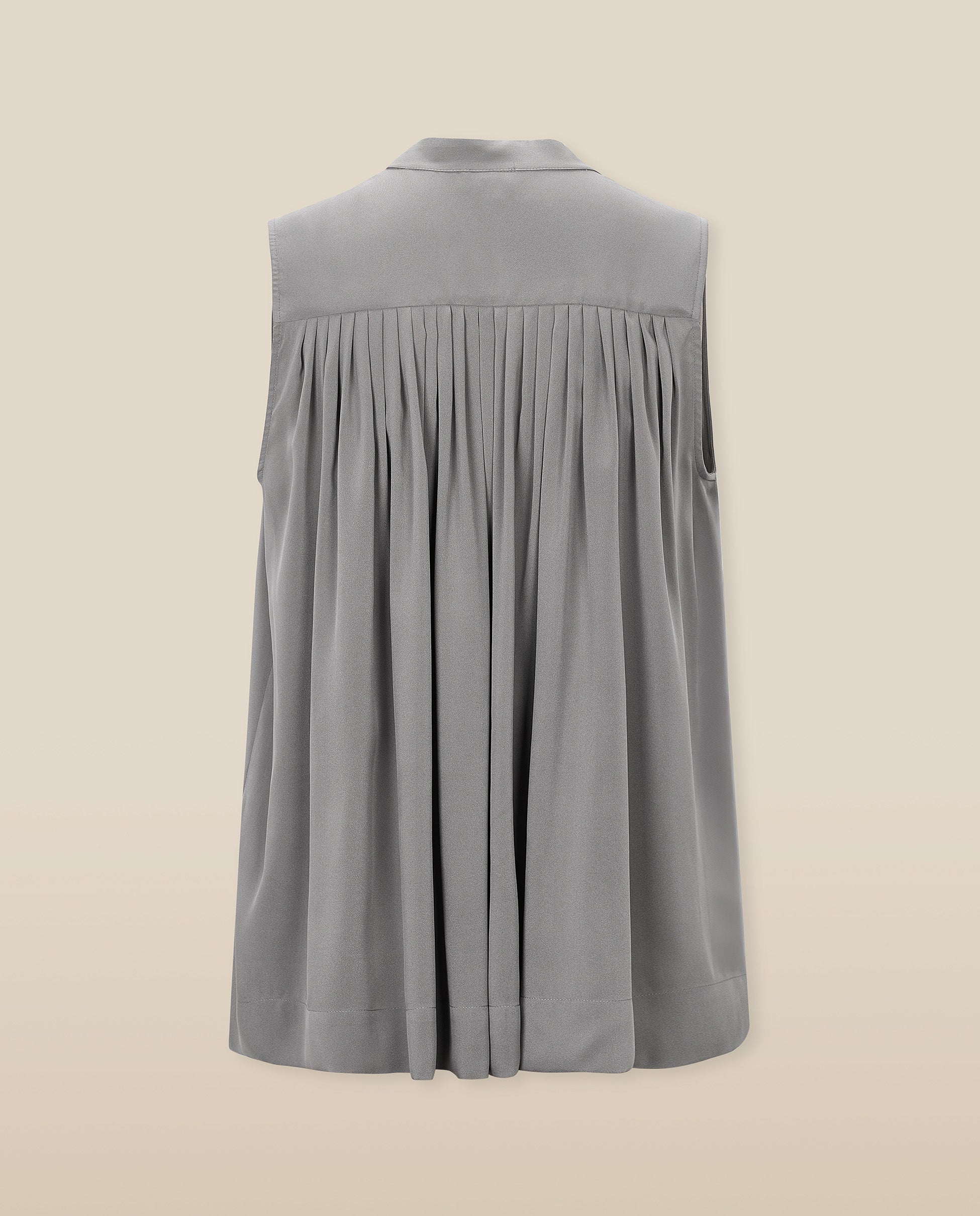 • Delicate pleats frame the sleeveless shoulders for added volume