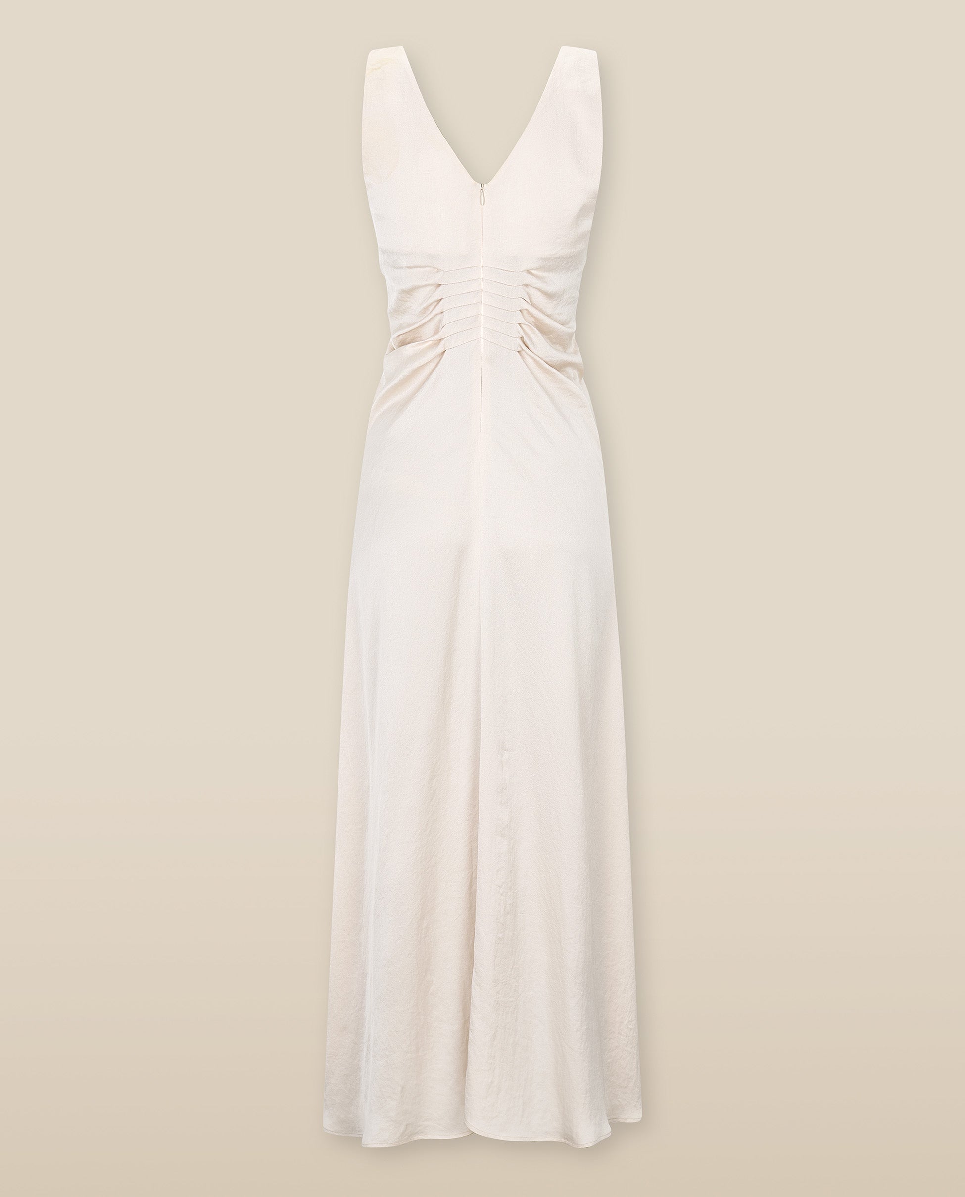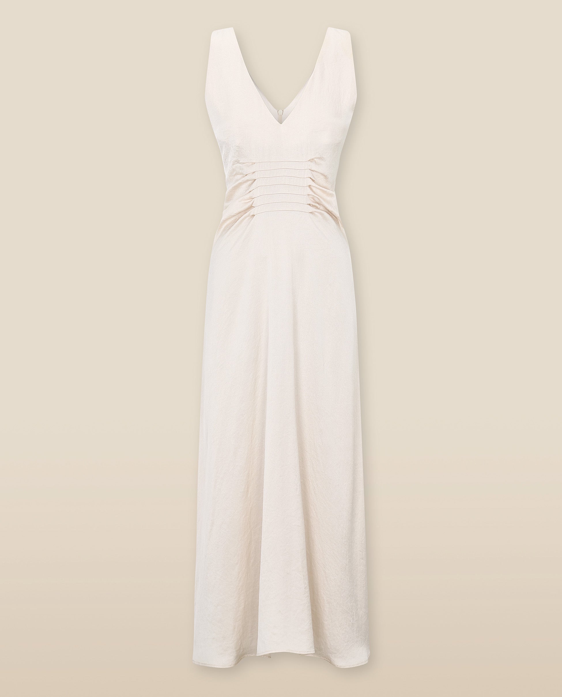YUKTA | Ivory Pleat Front Satin Midi Dress