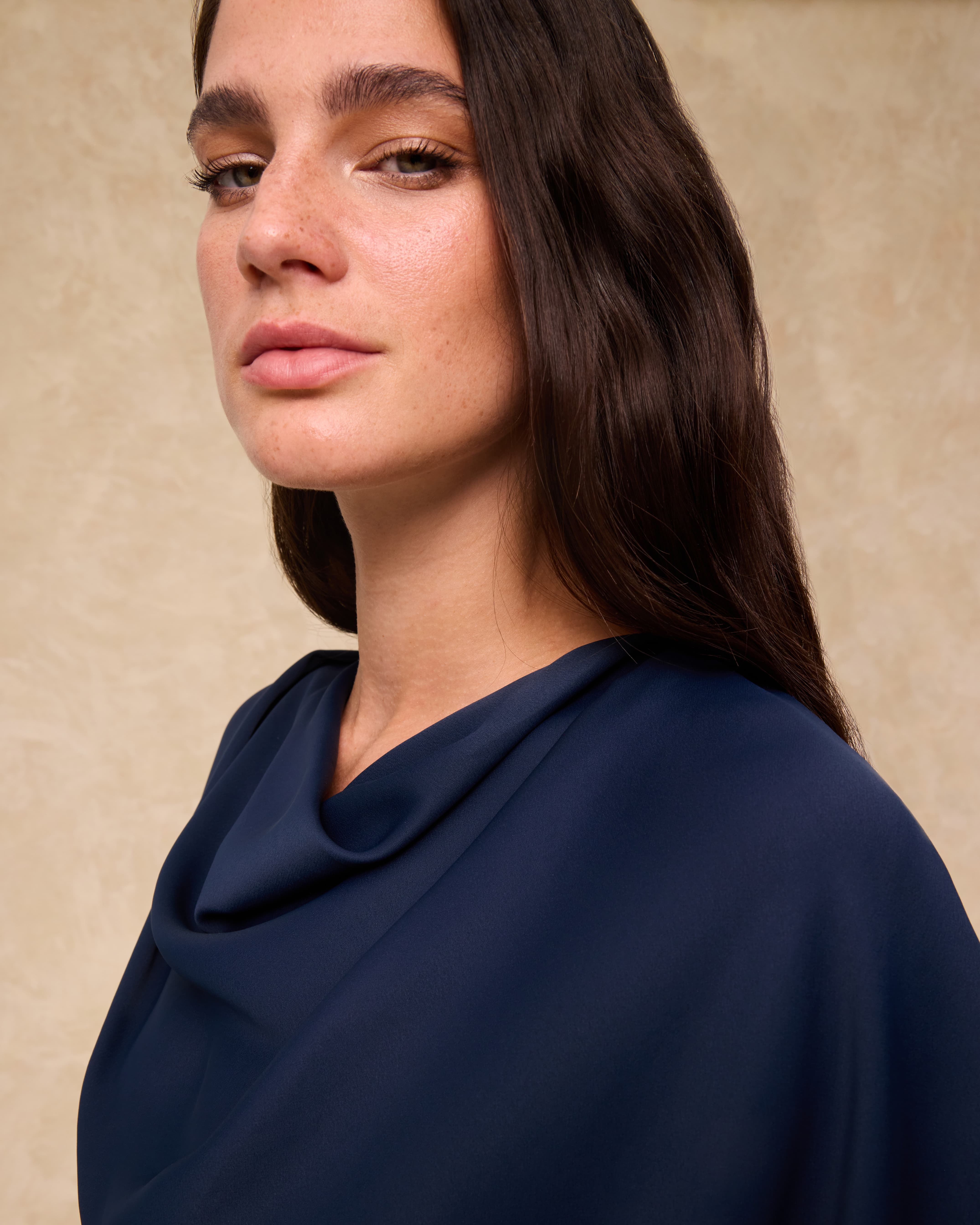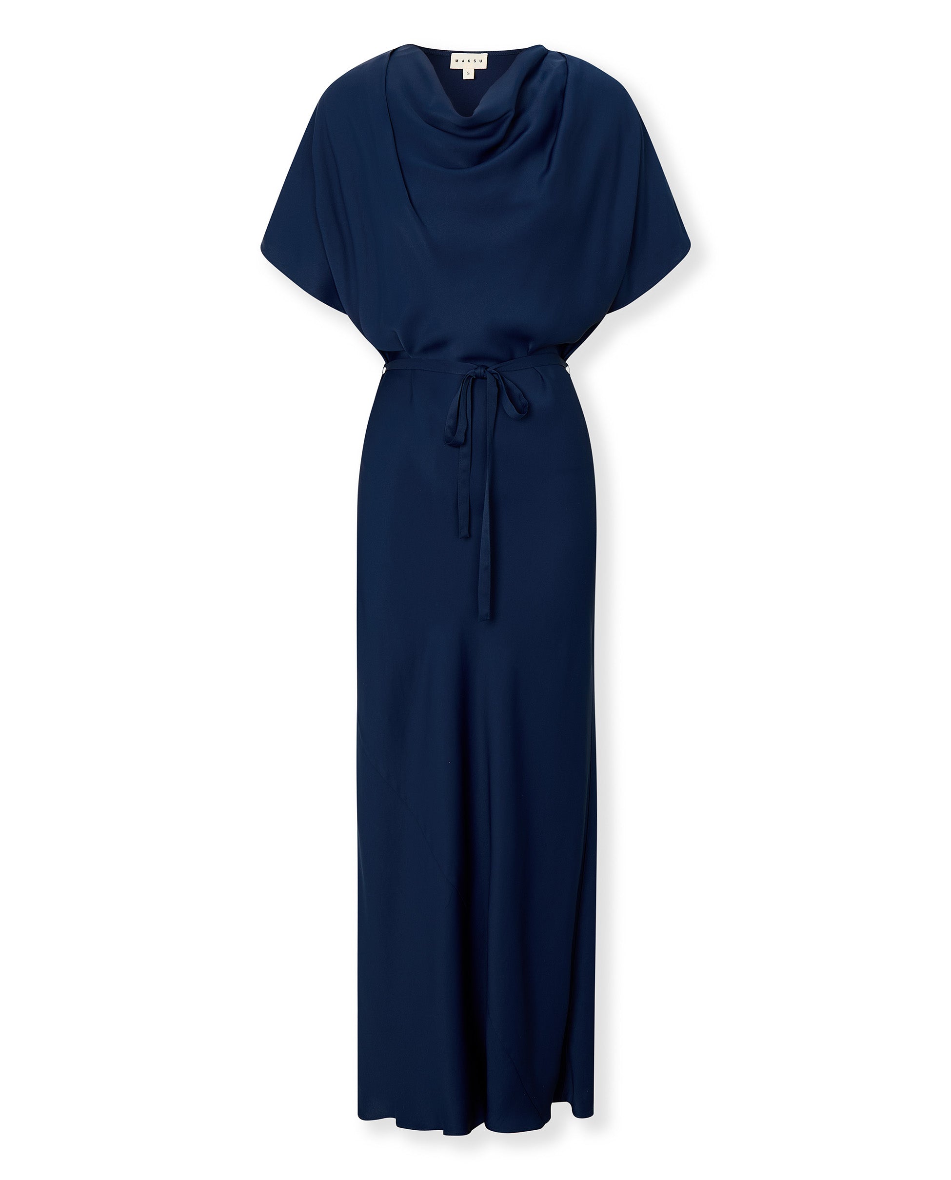 Effortlessly refined, the Capri Dress is cut from fluid satin with a subtle sheen and beautiful drape. Its relaxed batwing sleeves and soft cowl neckline offer elegant ease, while the detachable waist tie allows for personalised shaping. A bias-cut hem enhances the silhouette with gentle movement.