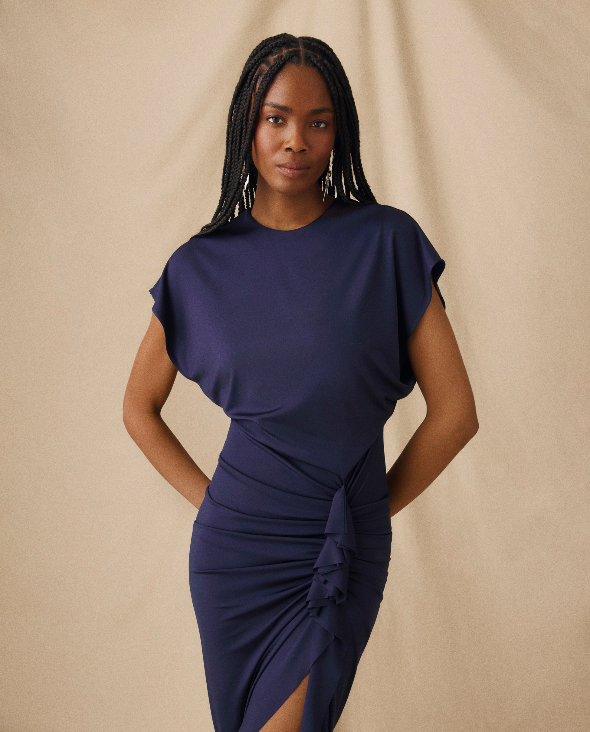 Sculptural and fluid, the Michaela dress is defined by its elegant draping and soft movement. Crafted in a deep navy tone, it features a relaxed bodice, gathered waist and asymmetric ruffle detail that cascades into a side split. A concealed zip at the back ensures a smooth silhouette.