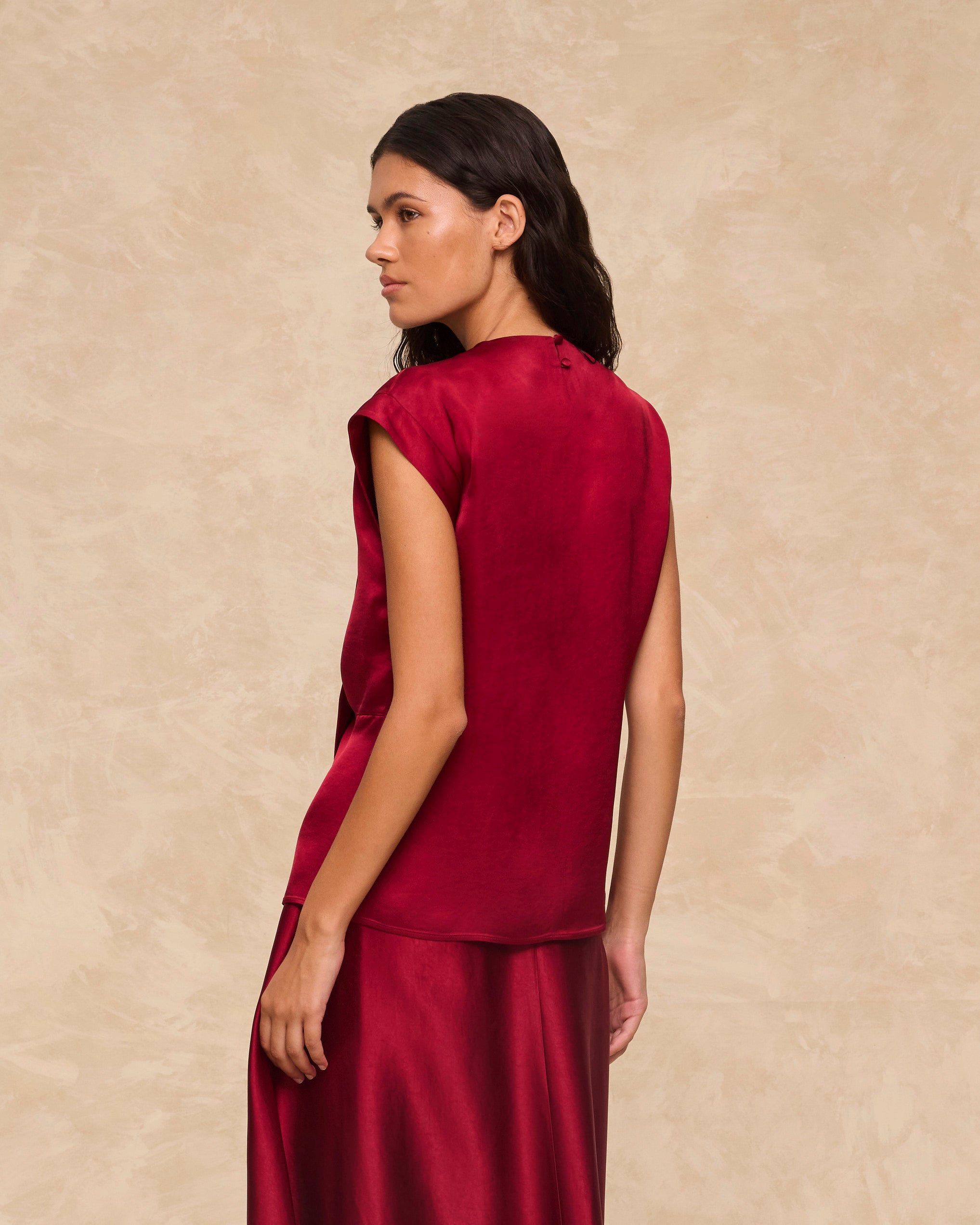 The Natalia top is a refined staple in claret red, balancing subtle structure with feminine ease. Designed with cap sleeves and gentle shoulder gathers, it features a clean round neckline and fastens at the back with two tonal buttons for a discreet finish.