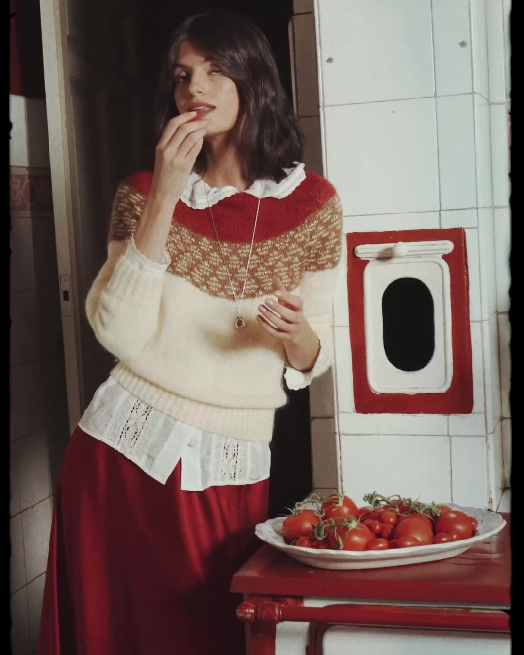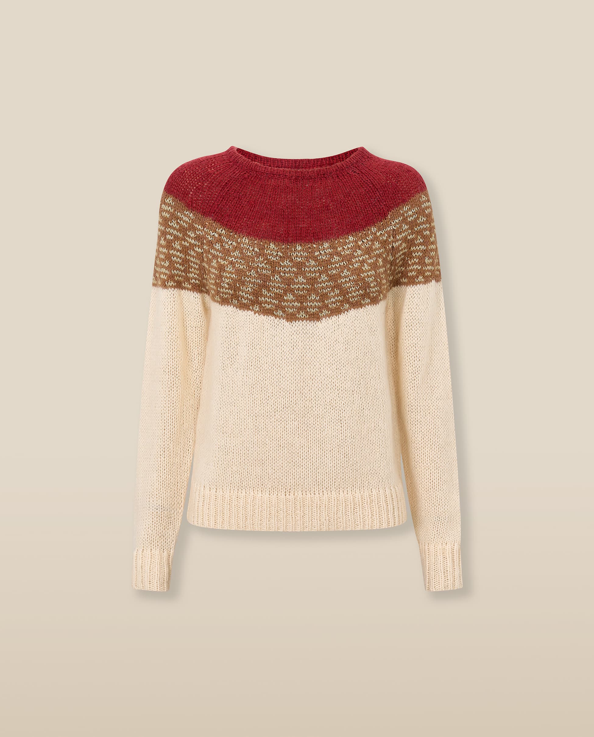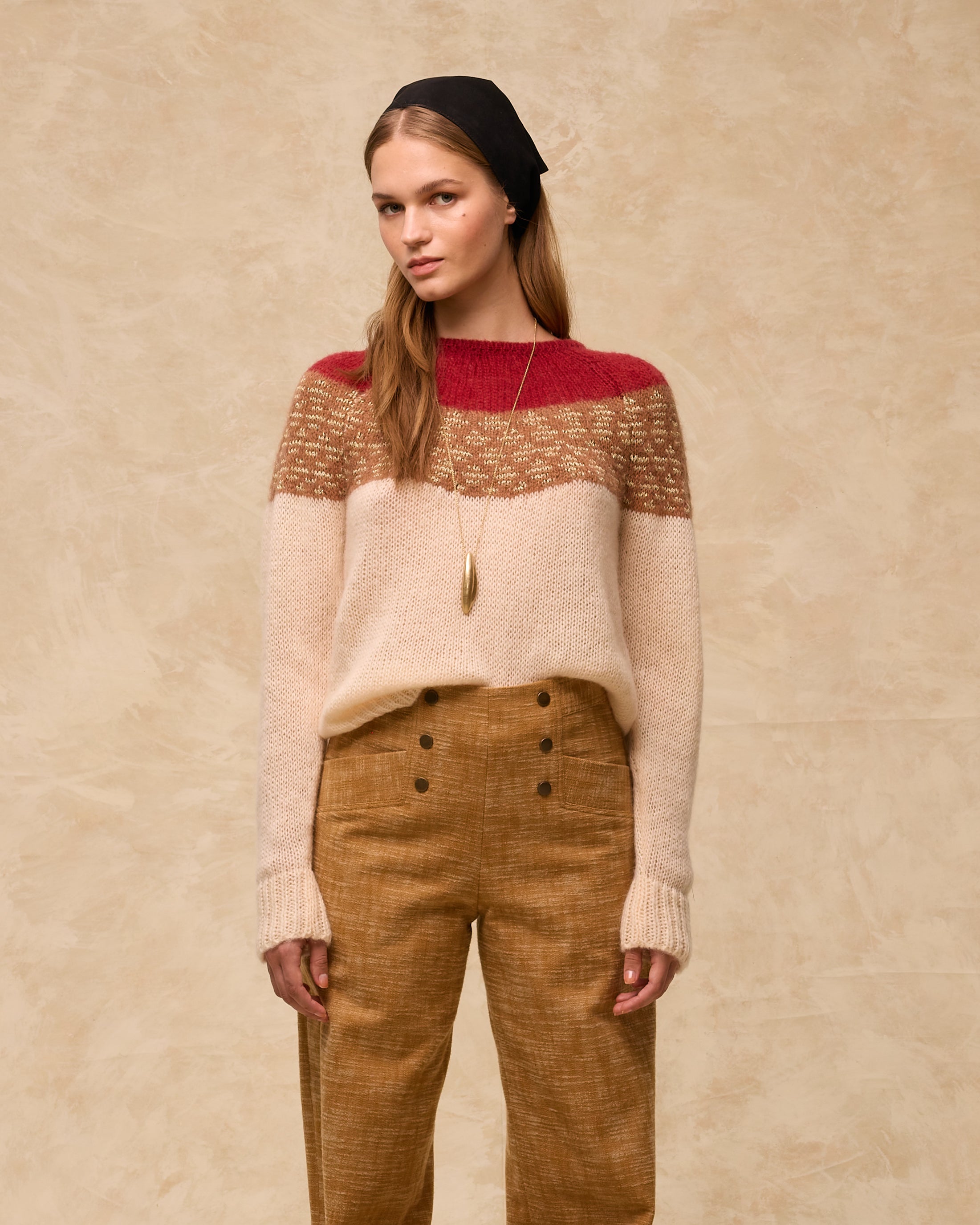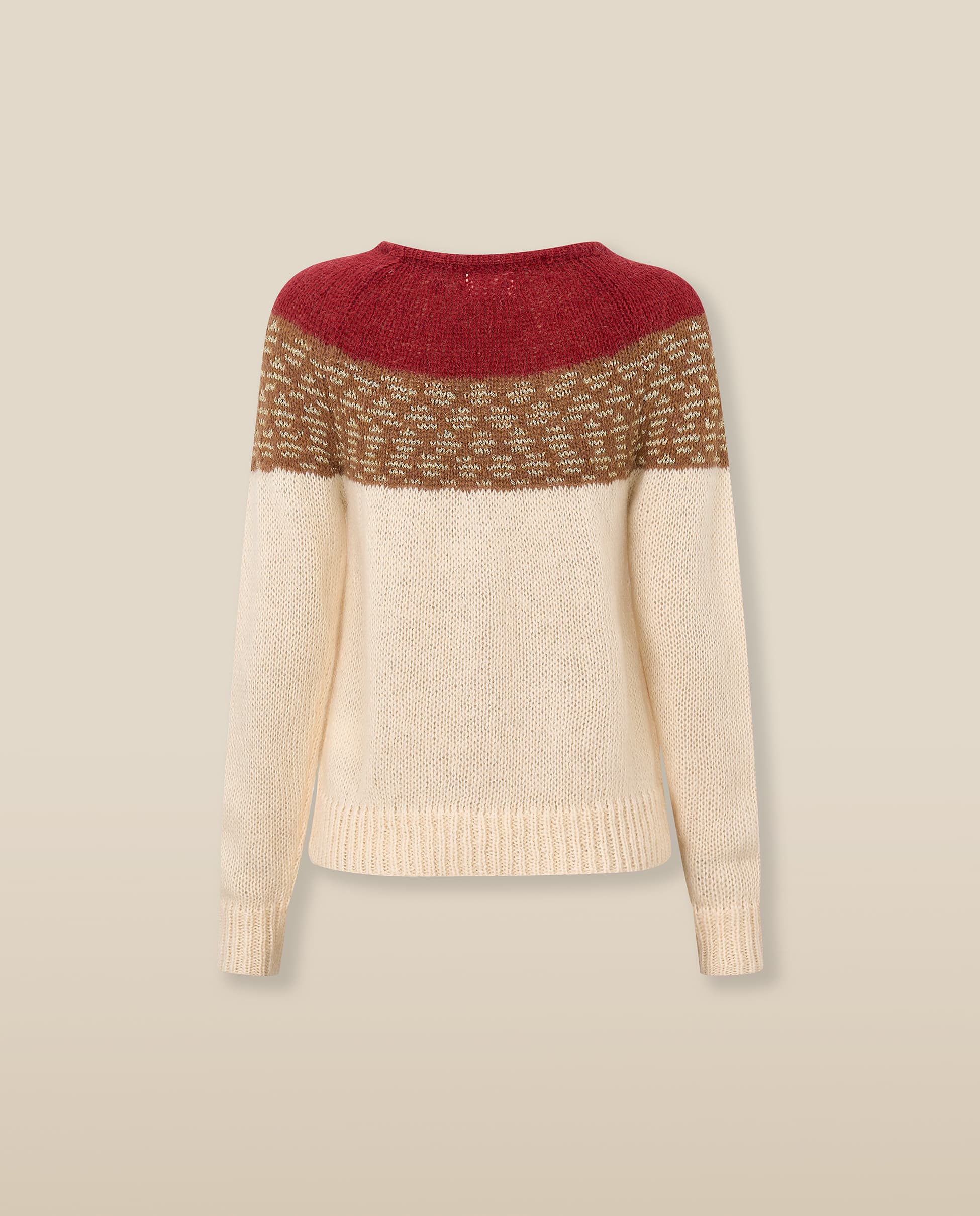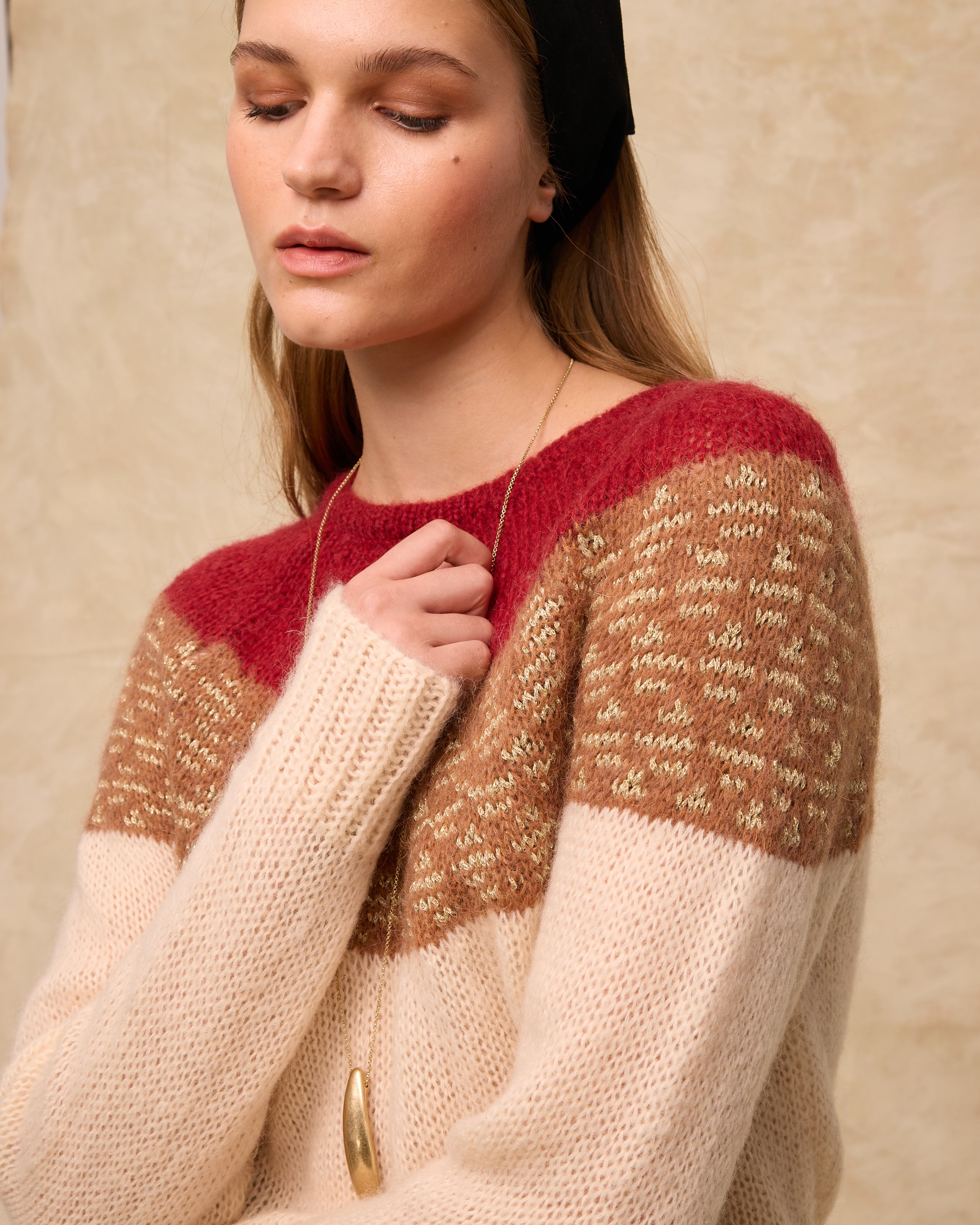 • Cream knit with a statement yoke in red, bronze and metallic gold