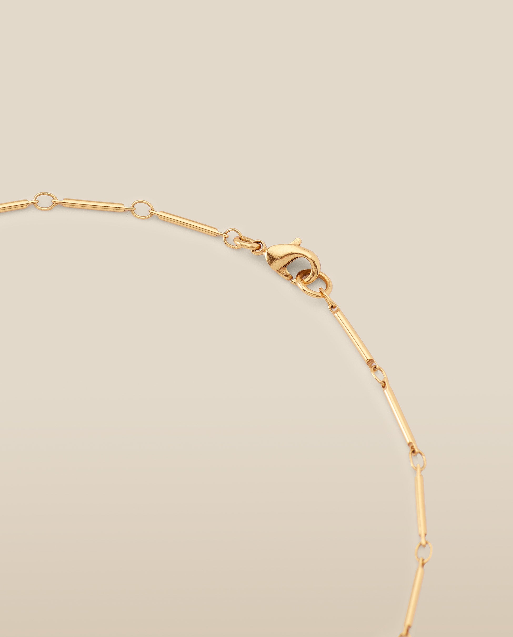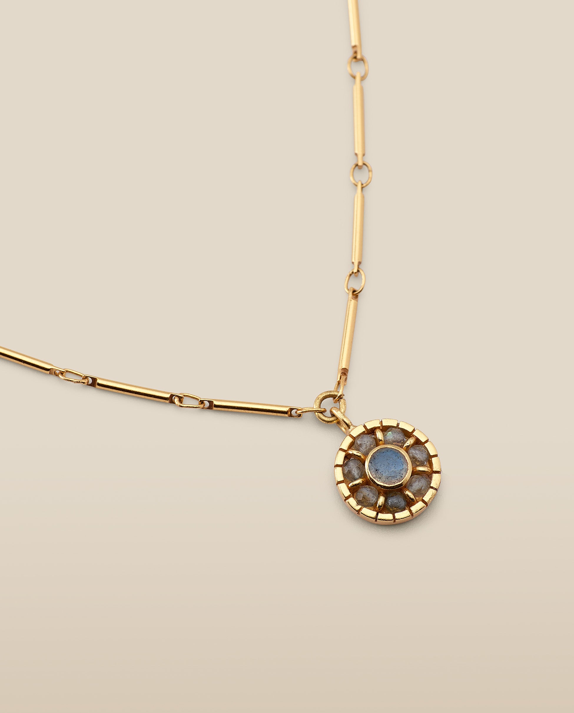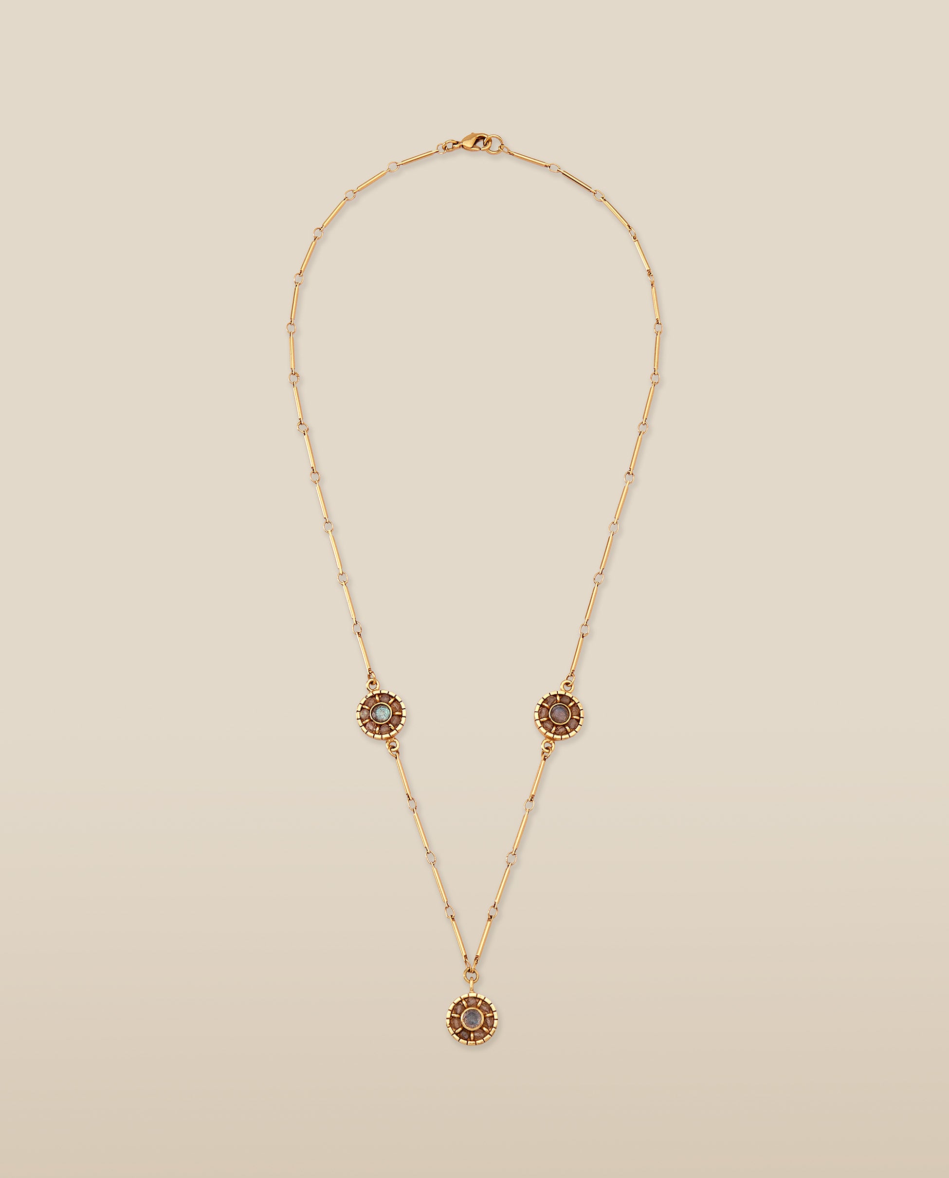 Crafted from 22k gold-plated metal, the Gauchita necklace features a delicate chain with three labradorite-studded medallions, each framed with a sculpted border for a vintage-inspired touch. Designed for effortless layering or a stand-alone statement, this piece captures a timeless, artisanal charm.