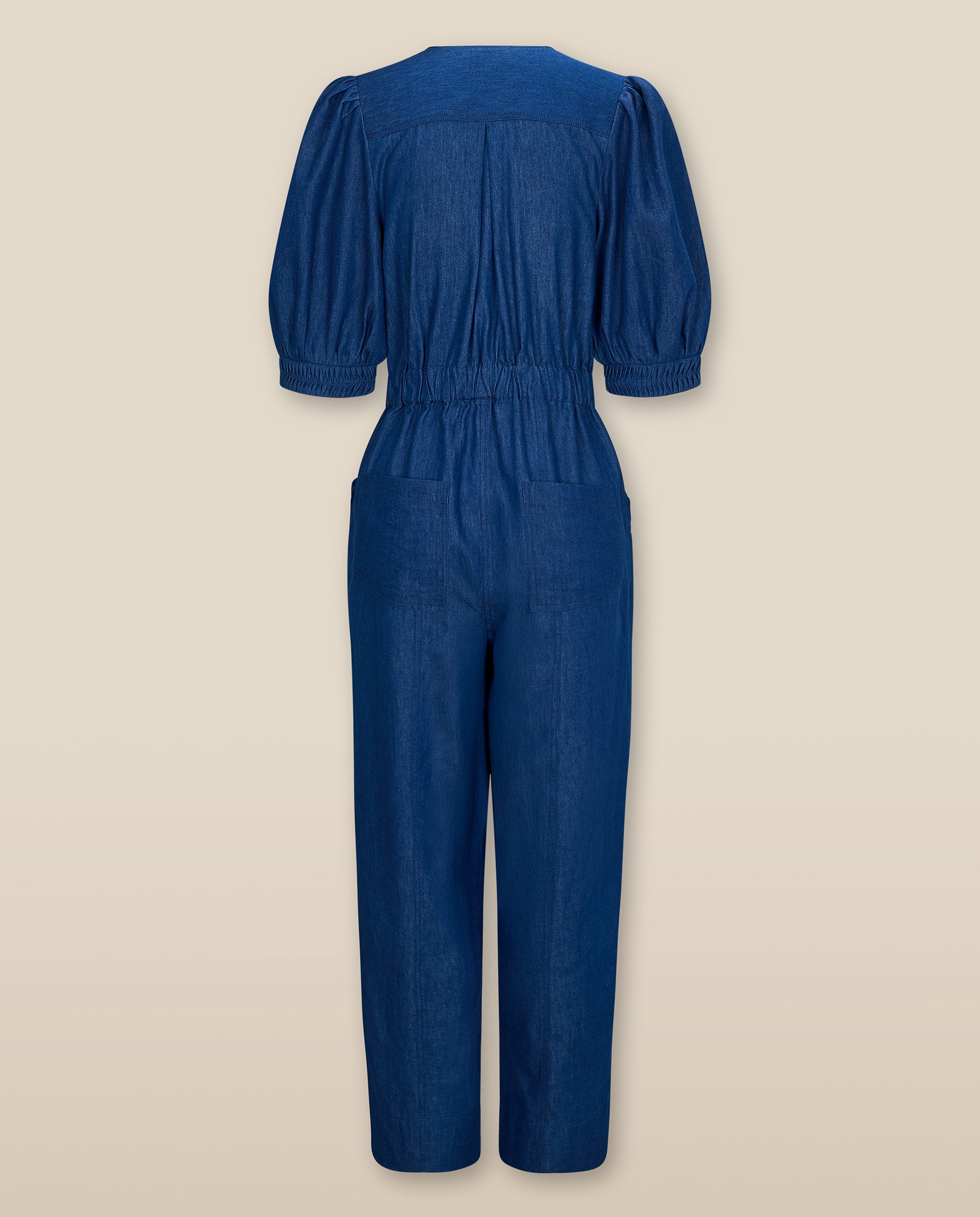The Janat Jumpsuit is a versatile one-piece designed for effortless style and ease. Crafted from 100% lightweight cotton denim, it’s breathable and soft, making it the perfect choice for spring and summer dressing. The flattering V-neckline, gently puffed short sleeves, and elasticated waist create a defined yet relaxed silhouette, while herringbone-trimmed seams add an elegant touch of detail. Finished with a front zip fastening and button closure, this jumpsuit beautifully balances utility and femininity.